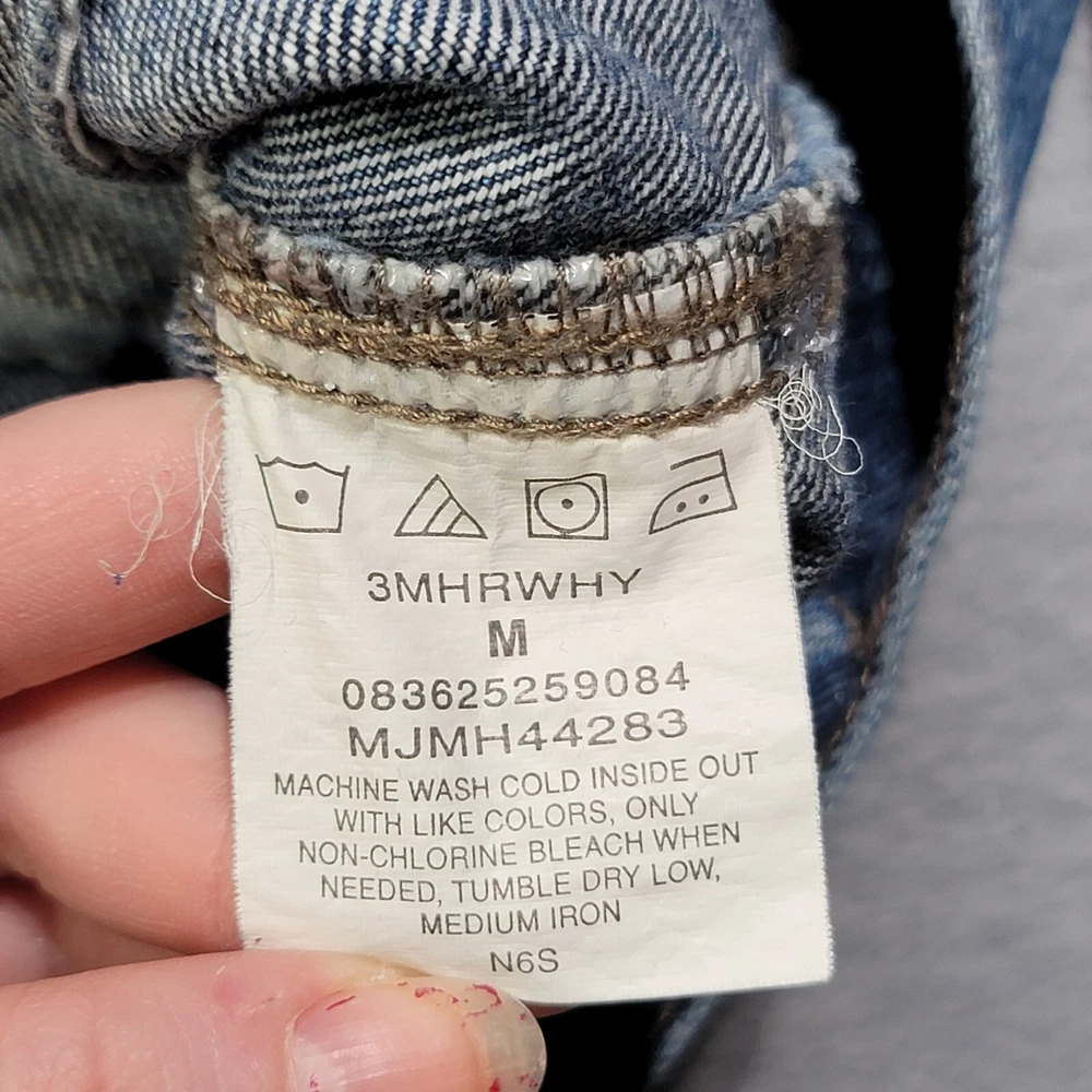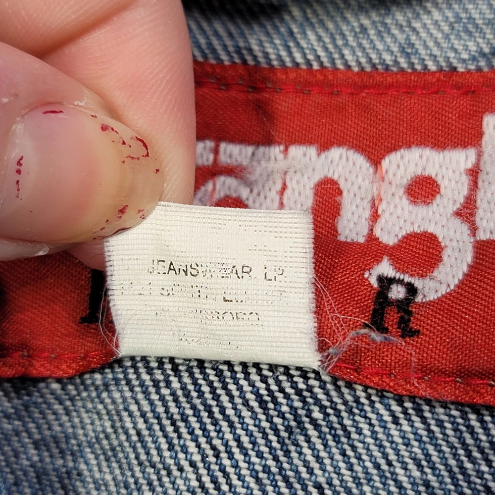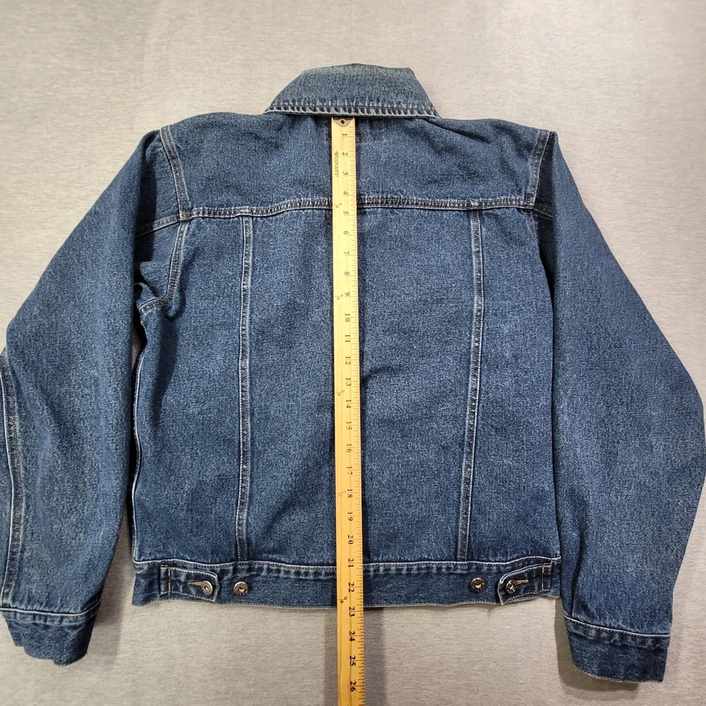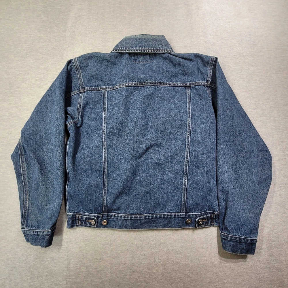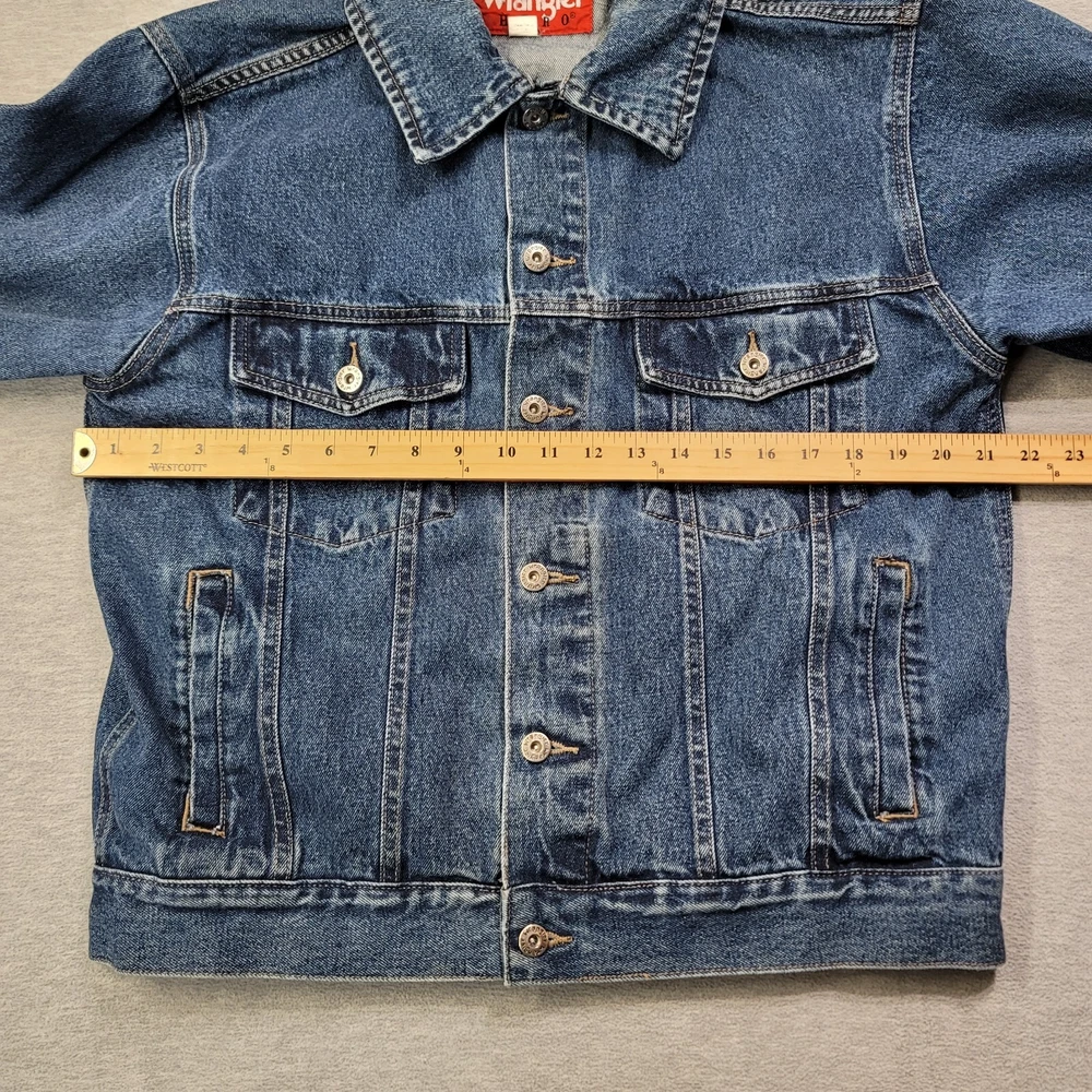 This vintage Wrangler denim jacket is a must-have for any fashion-savvy man. With a solid blue color and short length, it's perfect for any occasion. The jacket features a spread collar, button closure, and accents that give it a unique look. Made of high-quality cotton denim, it's comfortable and durable. The jacket is a size medium and has a regular fit. It's perfect for men who want to add a touch of style to their wardrobe. Whether you're going out with friends or running errands, this jacket is sure to turn heads. Don't miss out on the chance to own this one-of-a-kind piece.