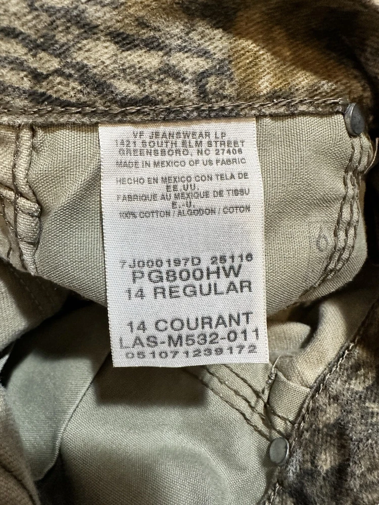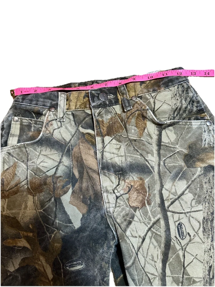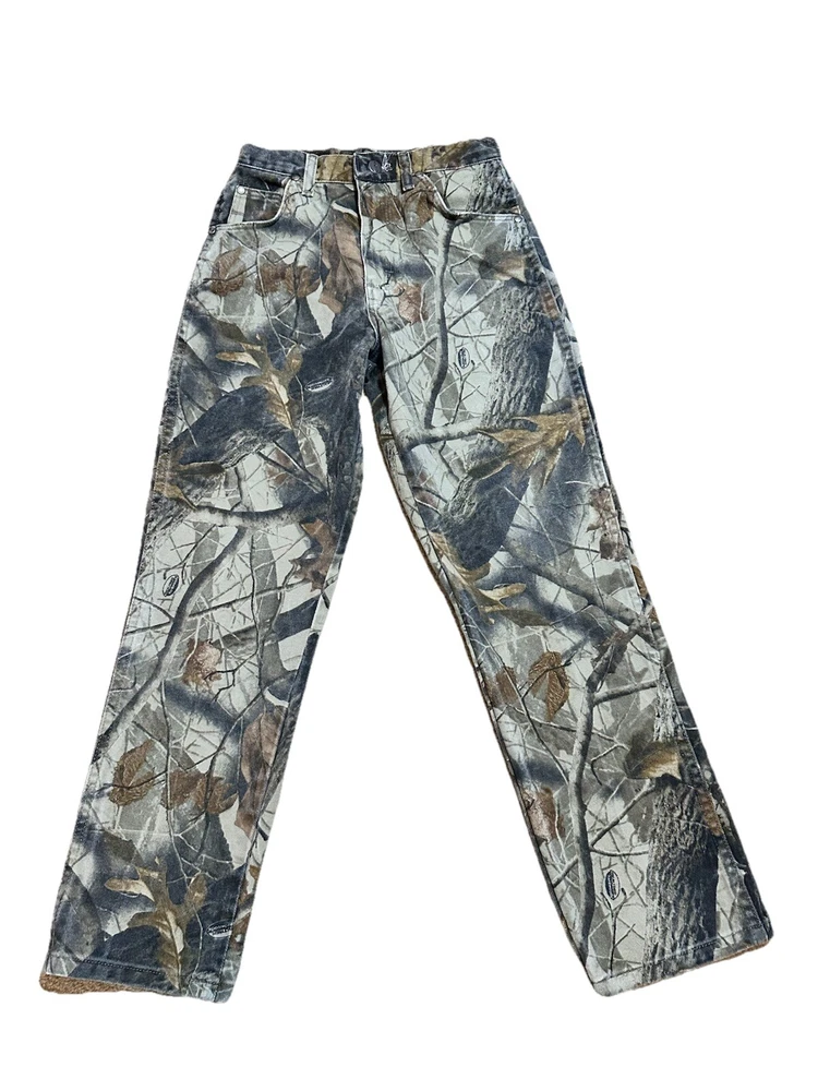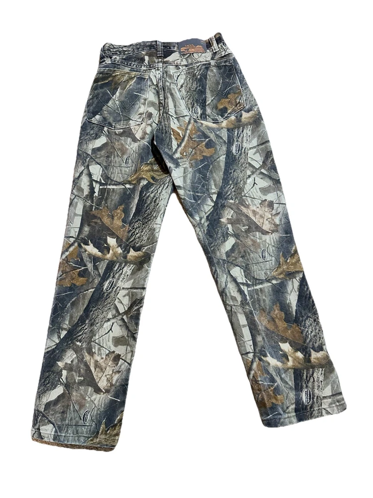 Vintage Wrangler Pro Gear Youth Camo Pants in size 14 made of 100% cotton. These multicolor pants feature a camouflage pattern, zip and button closures, and a carpenter style. They are machine washable and suitable for casual occasions. With a denim fabric type, these pants have a regular fit and come with pockets. Ideal for outdoor activities like hunting, fishing, hiking, and climbing in all seasons. Brand: Wrangler. Made in Mexico. These vintage hunting jeans are in great condition for their age. No problems with the jeans themselves. The Wrangler Pro Gear outer label on the back of the jeans is coming off as seen in pictures.