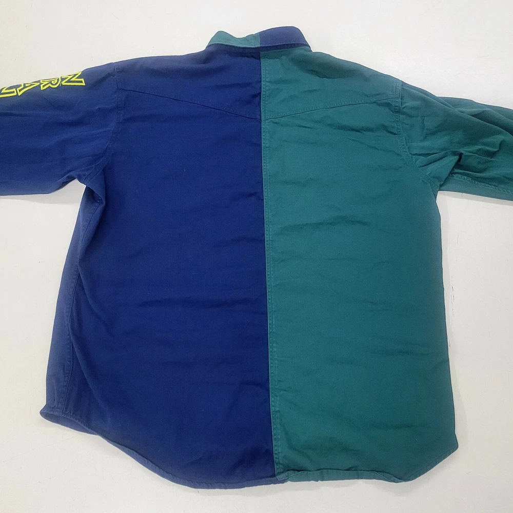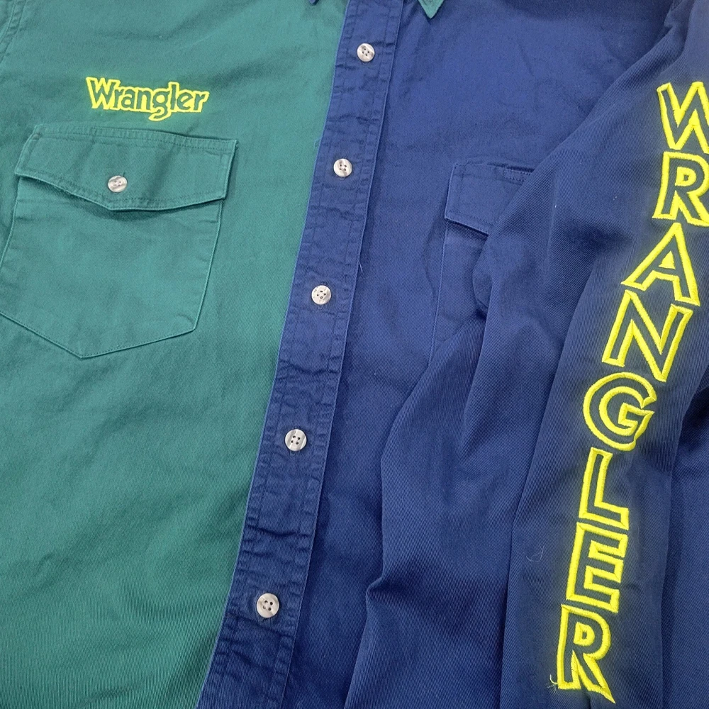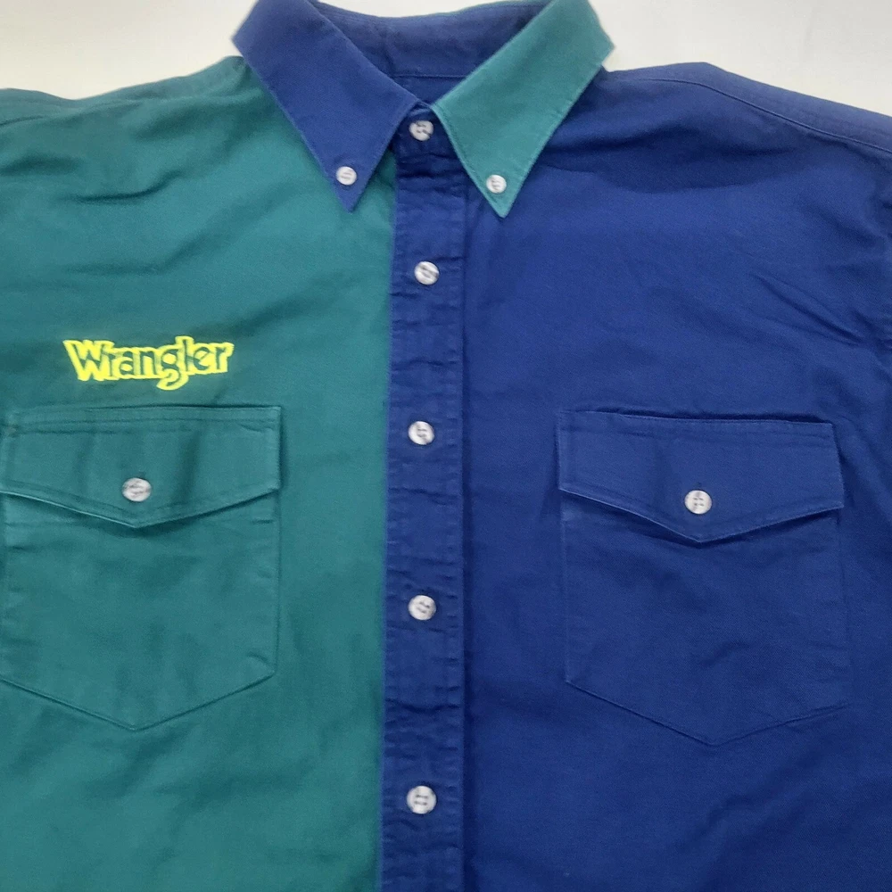 This vintage Wrangler shirt for men is a must-have for any collector or fan of retro western style. The shirt is made of a lightweight cotton blend canvas material and features a button-up collar and long sleeves with embroidery details. The shirt has a split color design and is perfect for any occasion, whether it be travel, party/cocktail, casual, or workwear. The shirt is machine washable and easy to care for, making it a great addition to any wardrobe. It also comes in size XL and has various features such as pockets and a classic fit. The shirt's theme includes rock, american, colorful, grunge, cowboy, classic, rockabilly, retro, logo, hipster, western, 60s, outdoor, 70s, 80s, 90s, Southwestern, and fun.