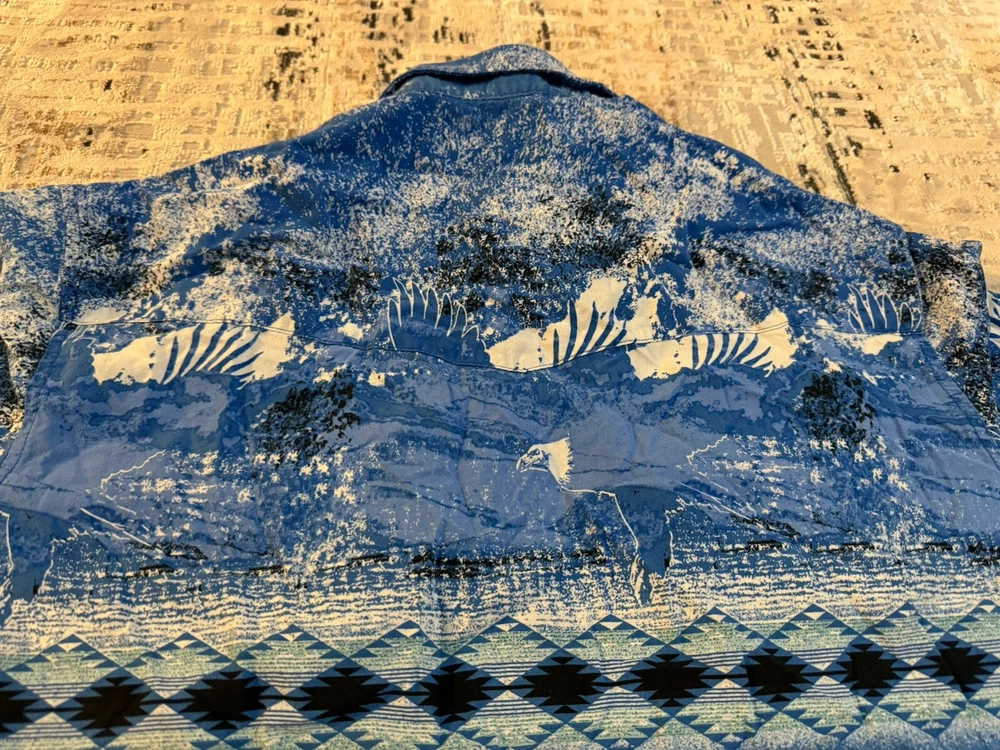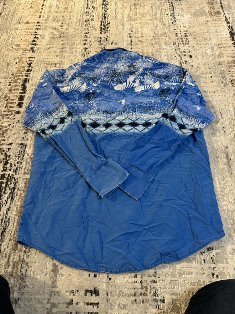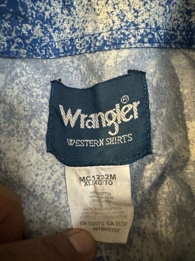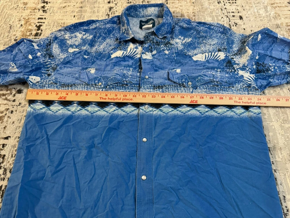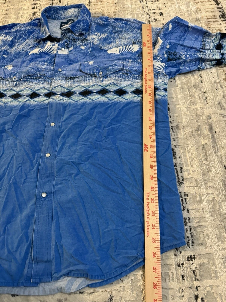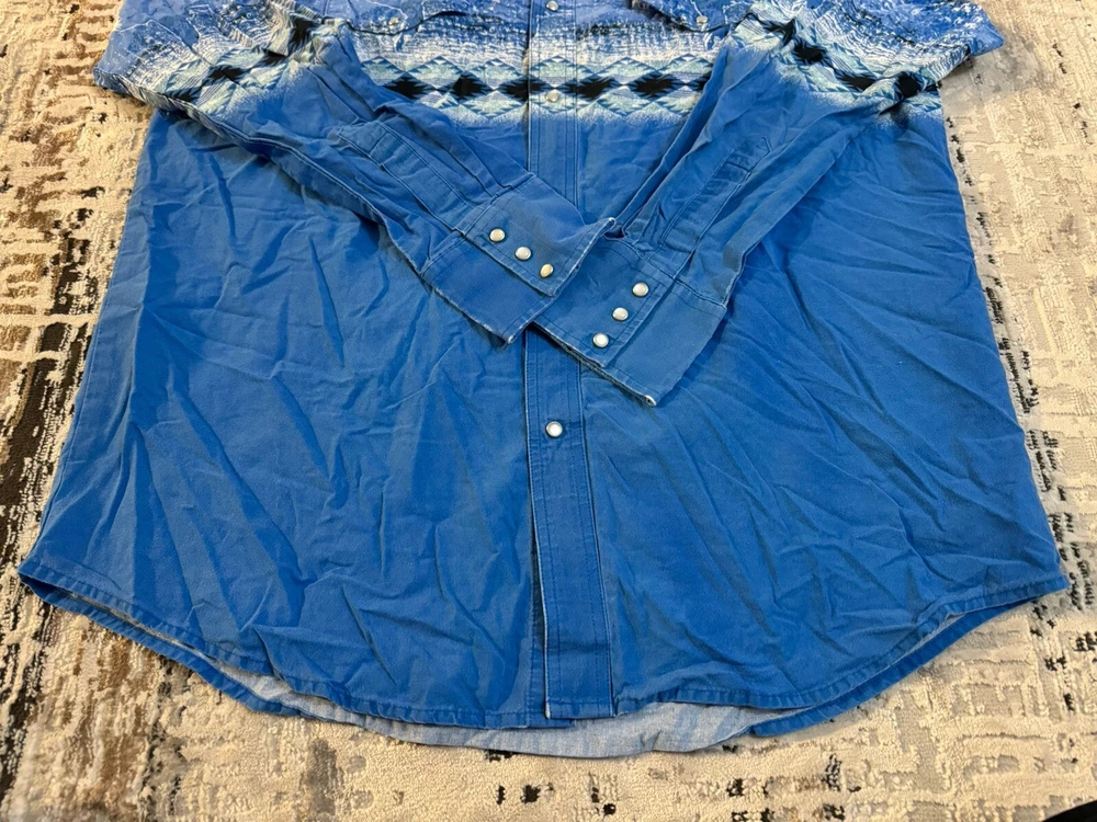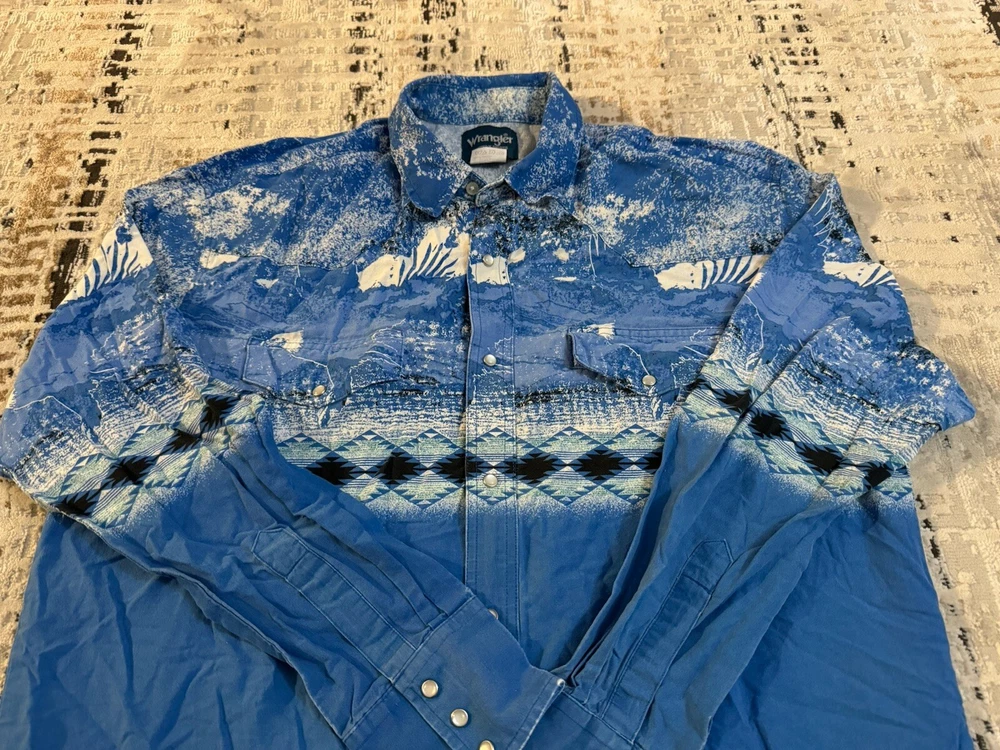 This Vintage Wrangler Shirt is a men's size XL with a Western Aztec print and pearl snap closures. The shirt features a collared neckline with a point collar style, long sleeves, and a regular fit. Made of cotton knit fabric, it is designed for all seasons and easy care, with a blue geometric pattern. This hipster Western shirt from Wrangler is perfect for travel, casual wear, or workwear, adding a touch of cowboy, Aztec, and bohemian style to any outfit.
