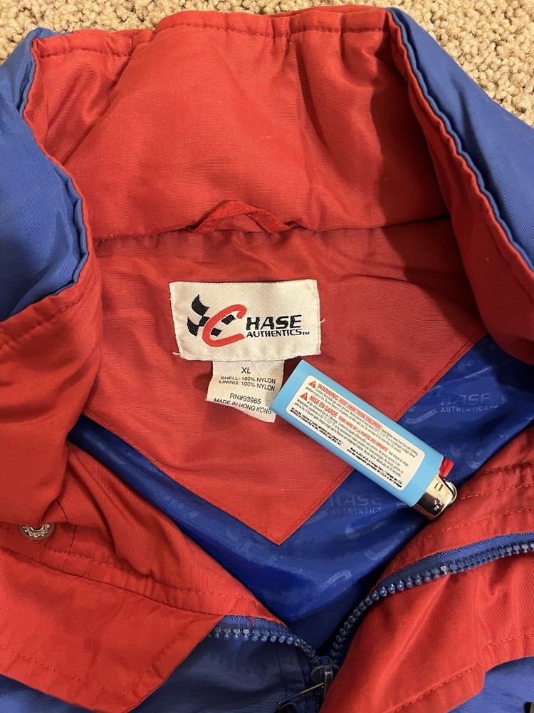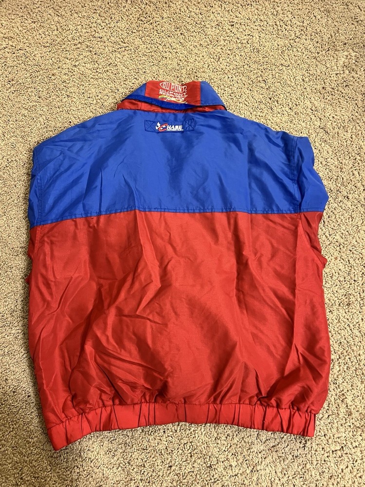 Vintage XL Jeff Gordon Dupont Racing Windbreaker Jacket by Chase Authentics #24. This jacket is perfect for any NASCAR fan who wants to show their support for Jeff Gordon and Hendrick Motorsports. The jacket is made in Macao and is officially licensed by NASCAR. The jacket is a unisex adult size XL and features multiple colors including red, blue, and white. It has a hood and zip front closure for added protection against the elements. The jacket is in great condition with no signs of wear and tear.