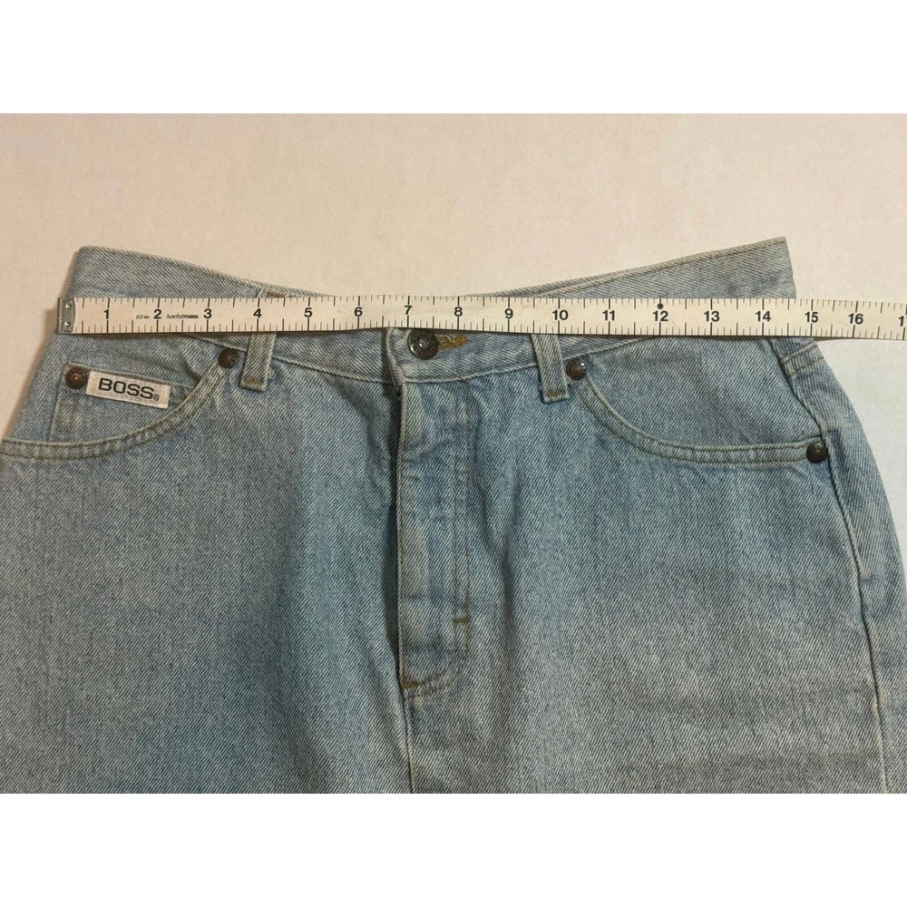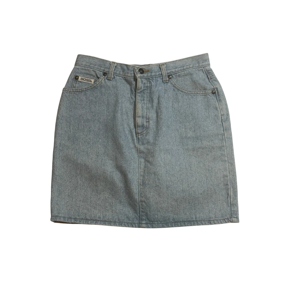 Vintage Y2K Boss by IG Design Denim Jean Skirt Womens Small Light Wash Mini Blue Festival Country Cowgirl Cowgirlcore Western Basic Everyday Staple Capsule Wardrobe Classic Timeless 5 pocket design Casual High Rise High Waisted America American Made 2000s denim skirt by Boss. Light blue. High waist. Leather brand logo tag on back. PLEASE READ – As with all vintage pieces please see measurements for sizing. VTG tag size 11/12, measurements indicate would be todays size small, please review measurements. Made in the USA. This VTG piece in great preowned condition for age. Professional, highly rated seller, quick shipper, open to offers! Approximate measurements: Waist: 29 inches Length (waist to hem): 18 inches 71602