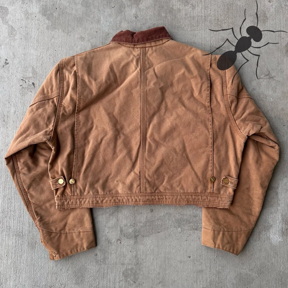 Vintage Y2K Carhartt brown cropped Detroit style work wear jacket. CUT FROM COVERALLS SO THE ZIPPER DOES NOT WORK!!! Measures 25.5x21. Please check measurements before purchasing. I do my best to show any flaws in pictures. Quick shipping! Bundles encouraged! @ants_haul on Instagram. J0162!!!
