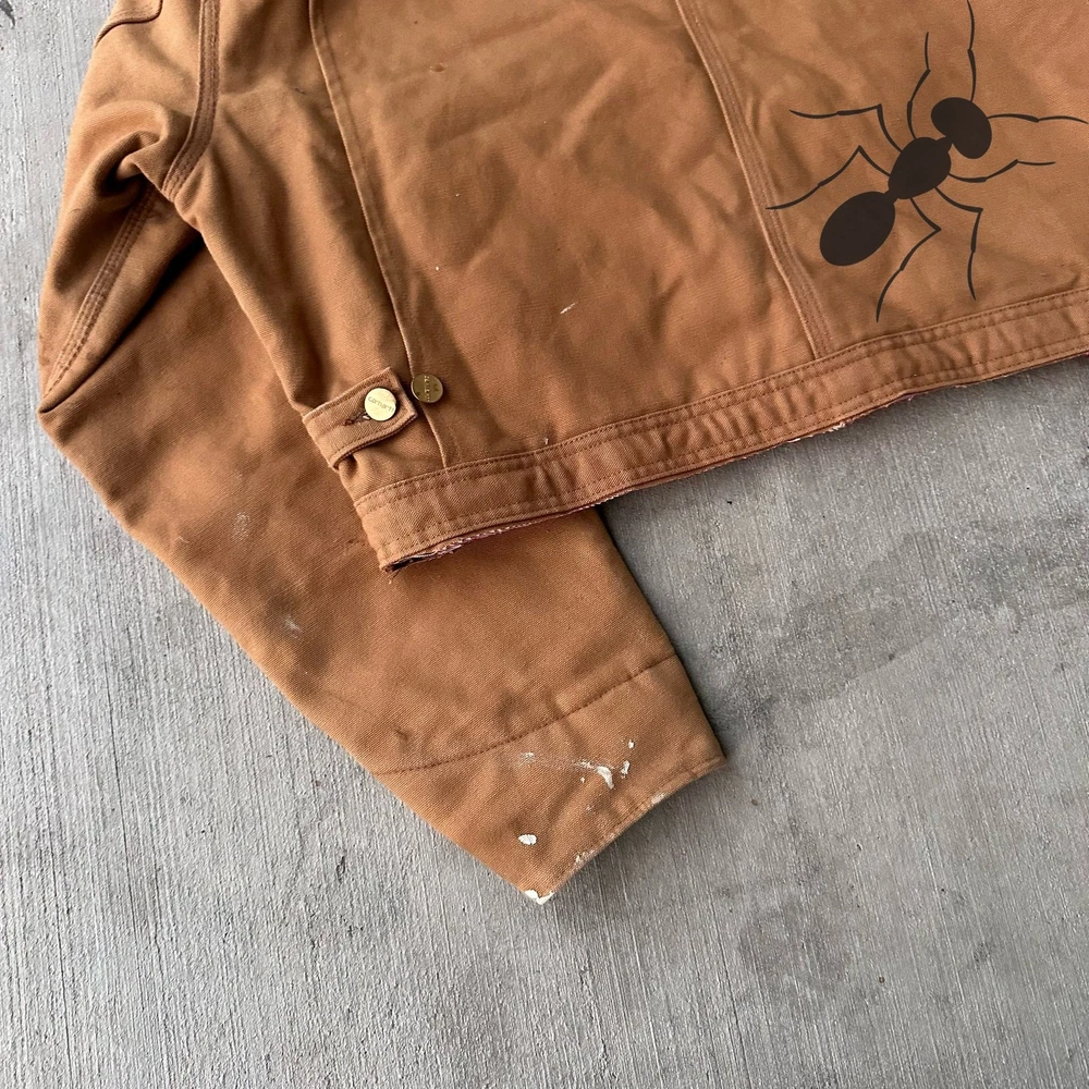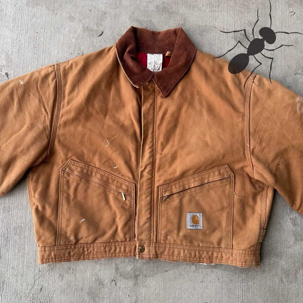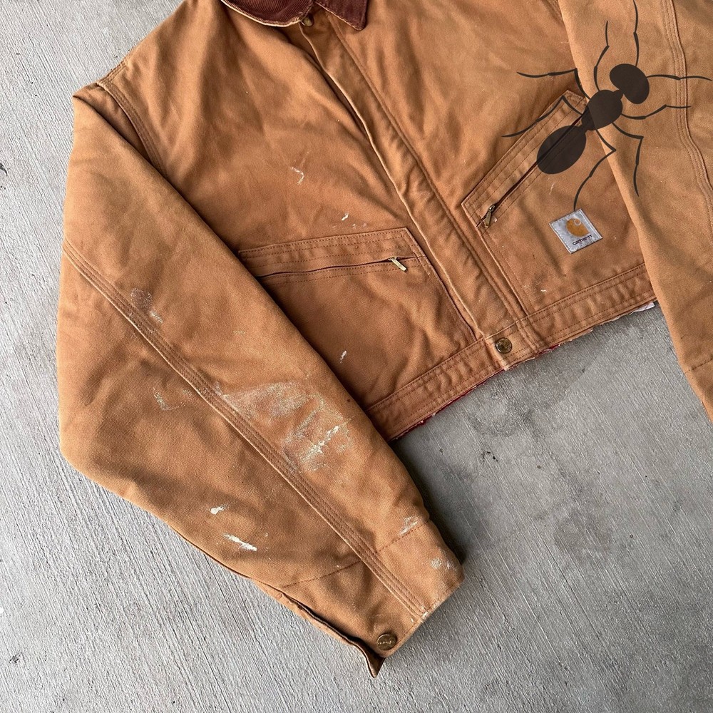Vintage Y2K Carhartt brown cropped Detroit style work wear jacket. CUT FROM COVERALLS SO THE ZIPPER DOES NOT WORK!!! Paint stains on sleeves. Measures 24.5x21.5. Please check measurements before purchasing. I do my best to show any flaws in pictures. Quick shipping! Bundles encouraged! @ants_haul on Instagram. J0165!!!