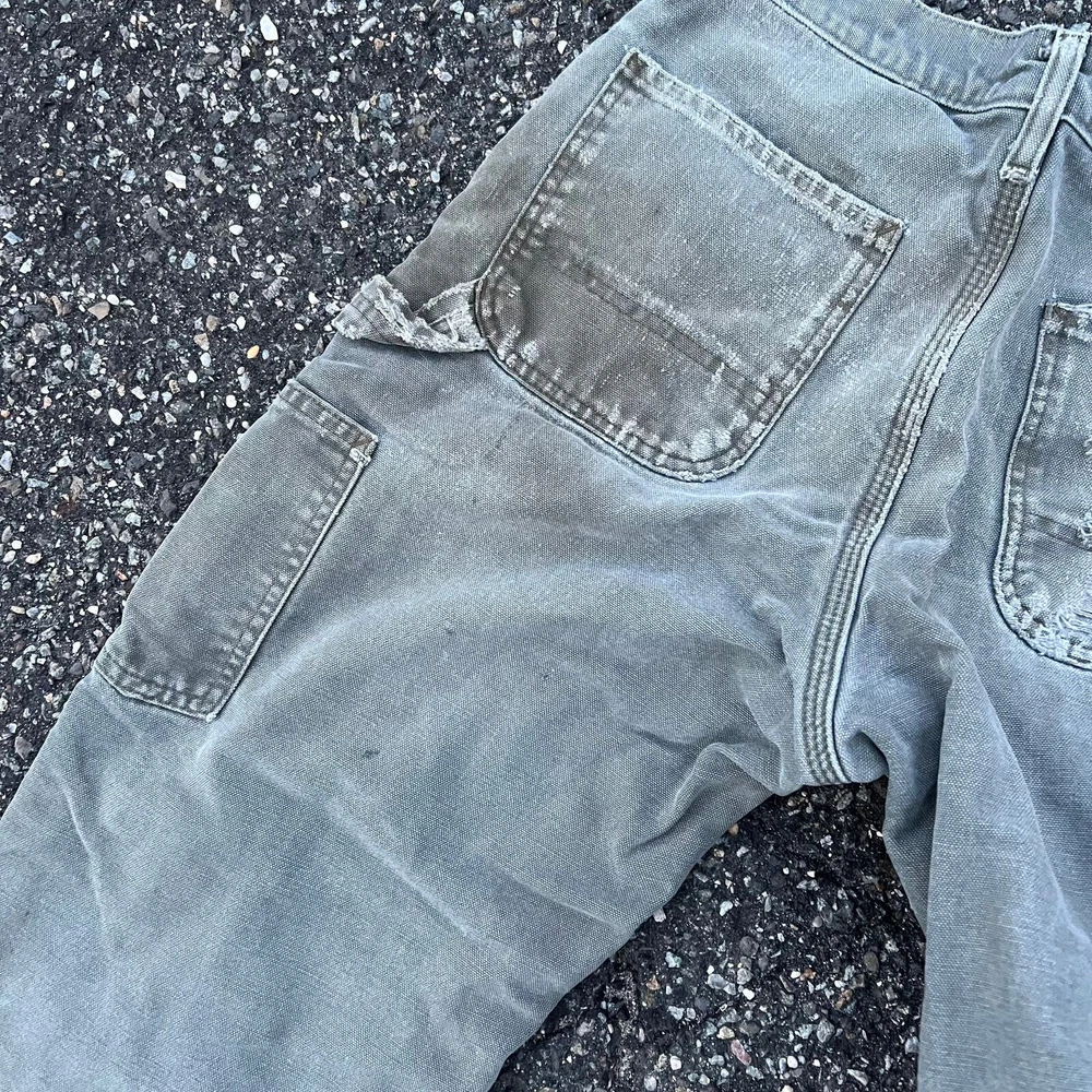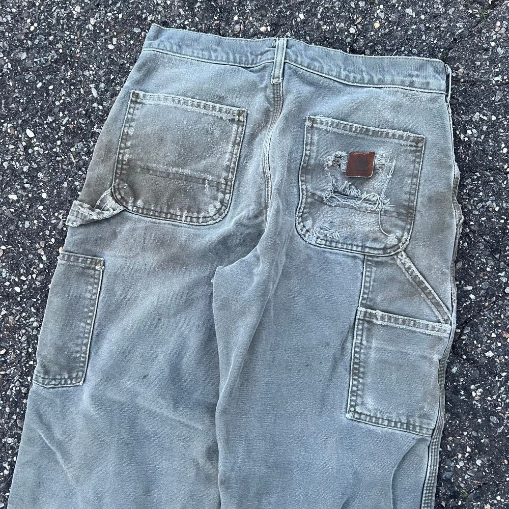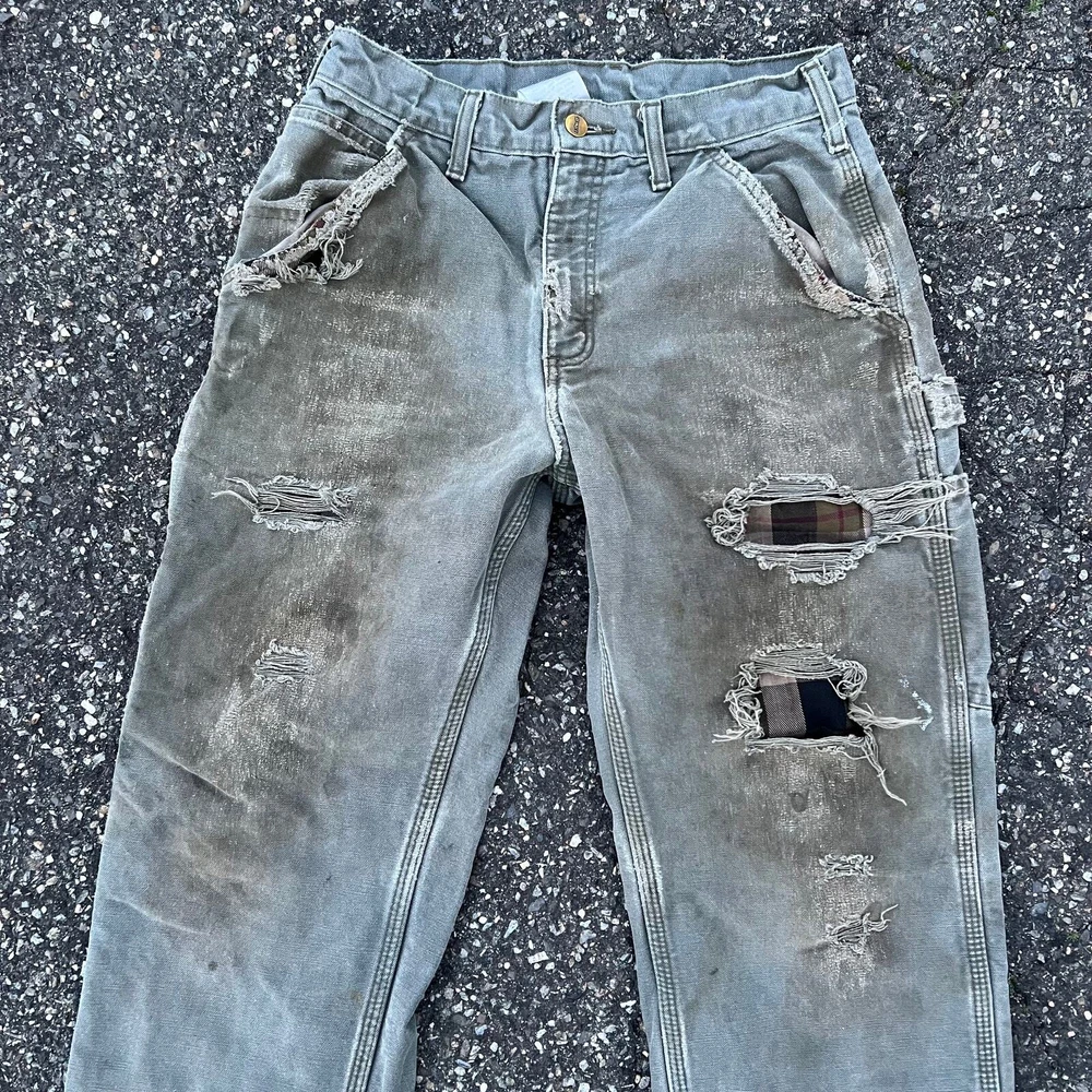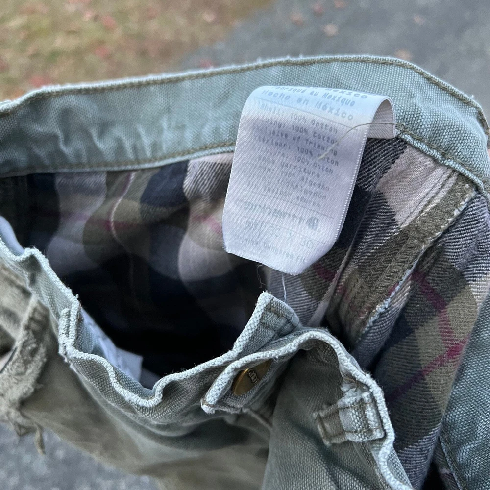 Vintage Y2K Carhartt mos flannel lined dirty green work wear carpenter pants. Clearly have stains hahahah please just be ready to wash these ones. Kinda smell too. Measure 30x30 and a 8.75 leg opening. Please check measurements before purchasing. I do my best to show any flaws in pictures. Quick shipping! Bundles encouraged! @ants_haul on Instagram. 408!!!