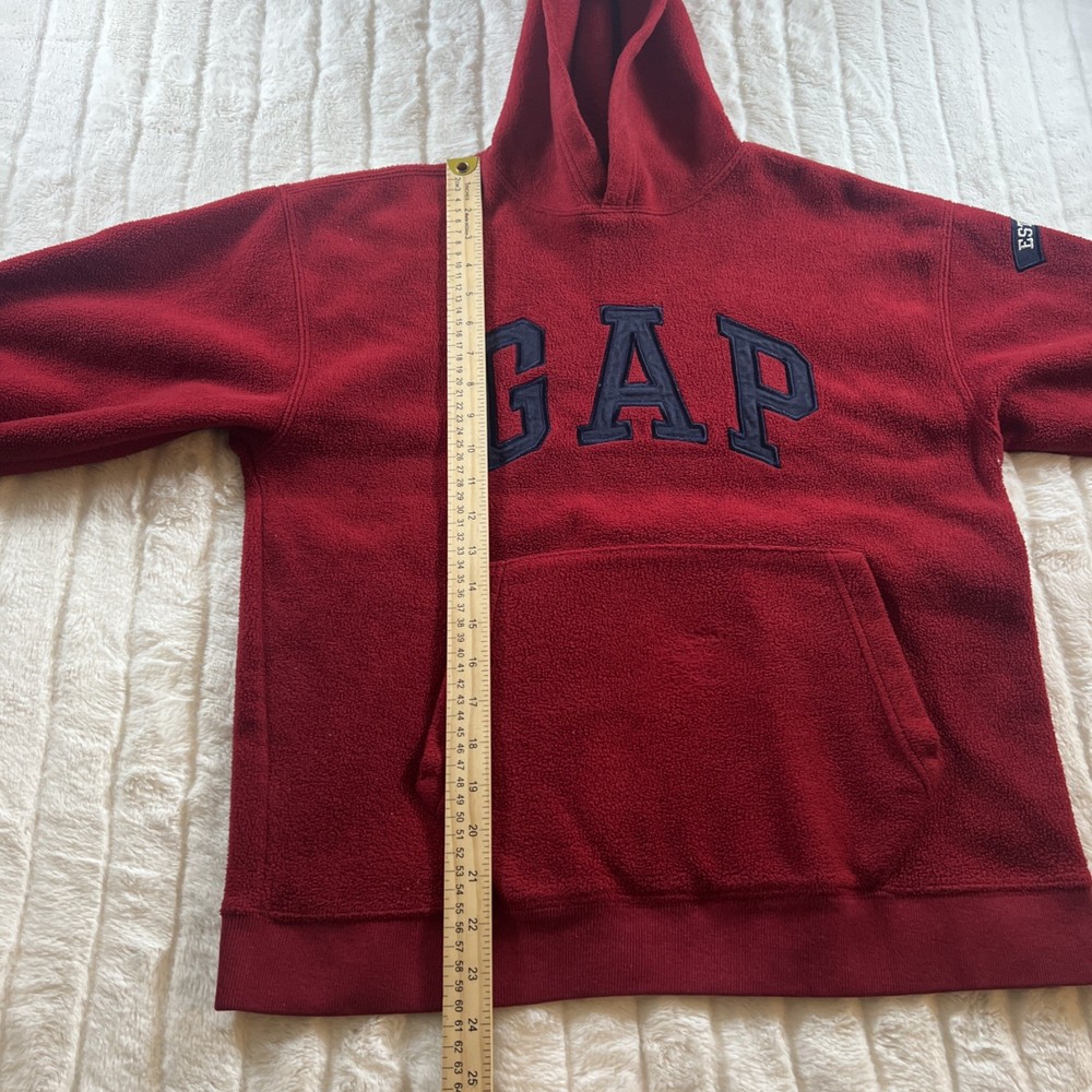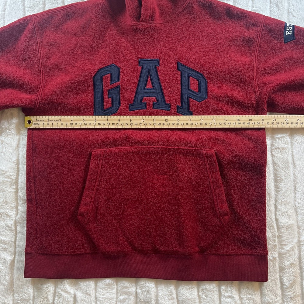 The Vintage Y2K Gap Hoodie in Youth XL size is a stylish and cozy red and blue fleece sweatshirt featuring the brand's iconic spell-out logo. This unisex kids' hoodie is perfect for the winter and fall seasons, keeping young boys warm and comfortable with a chest size of 40 inches. The retro design adds a nostalgic touch to any outfit, making it a must-have piece for any young wardrobe.