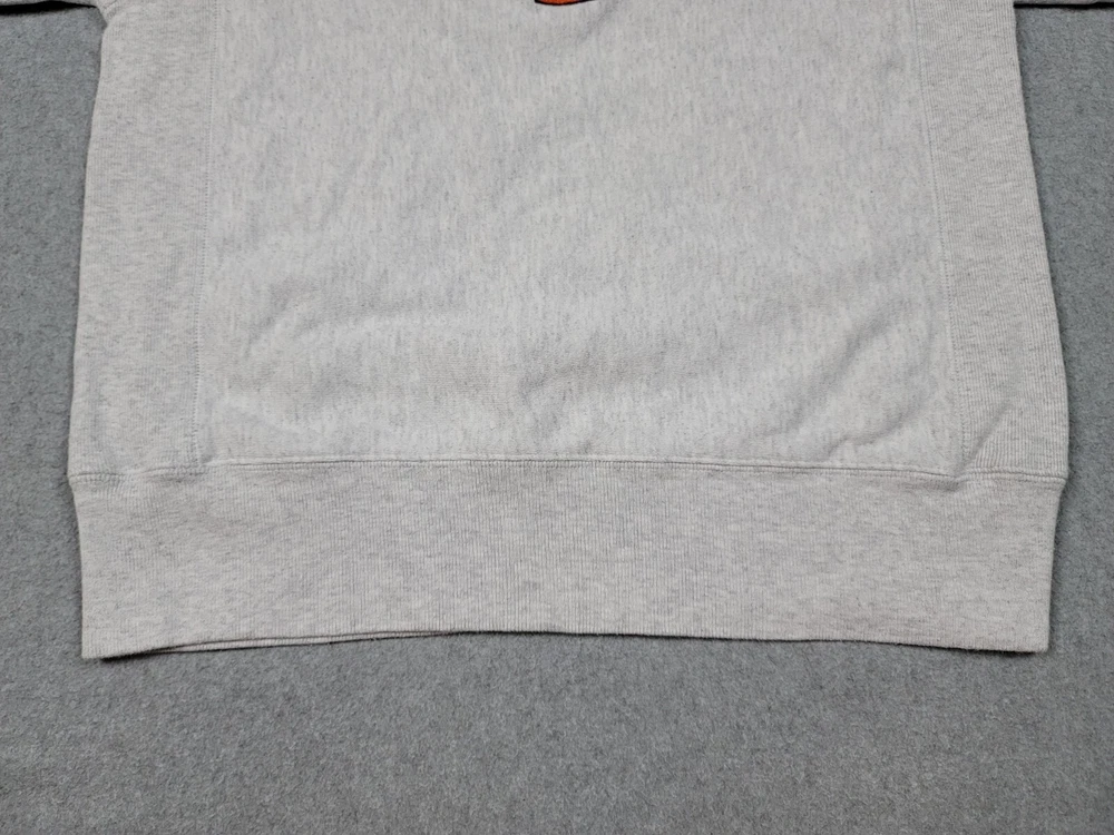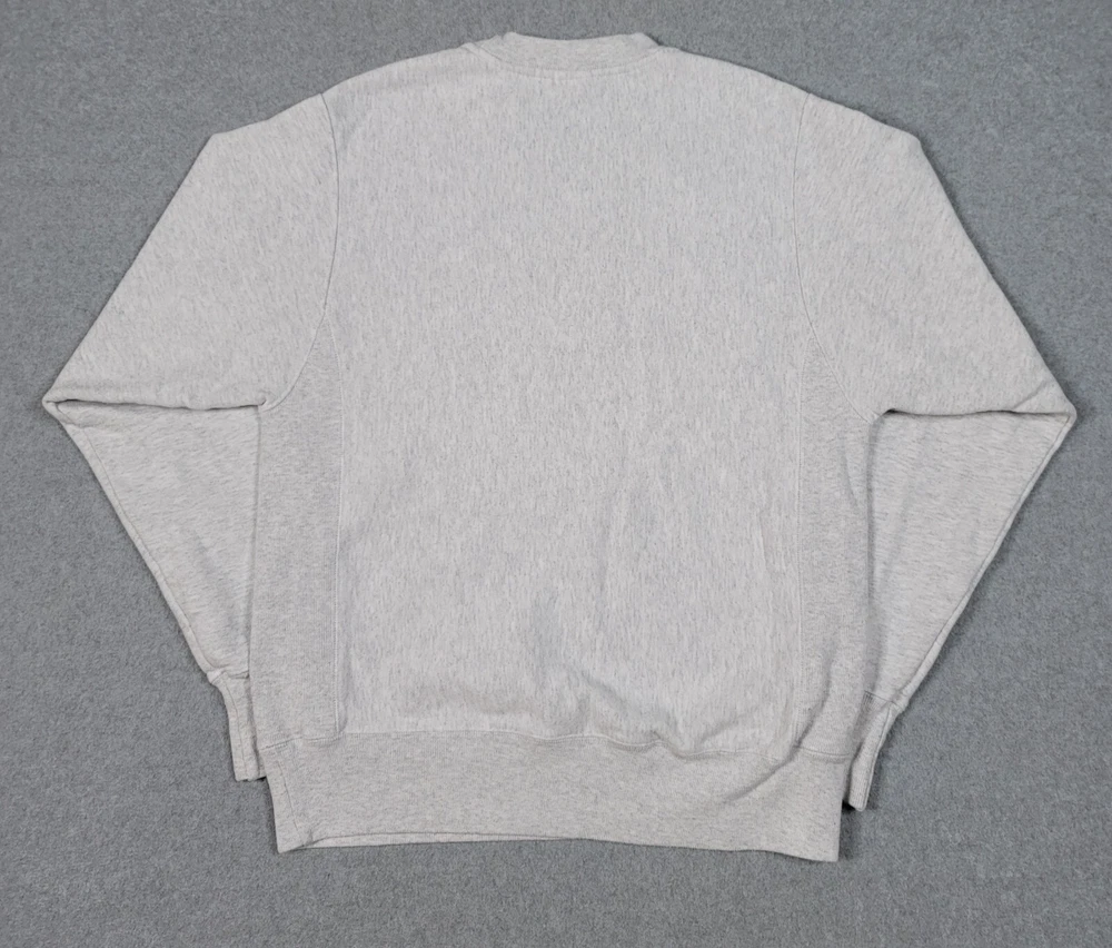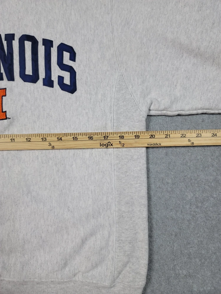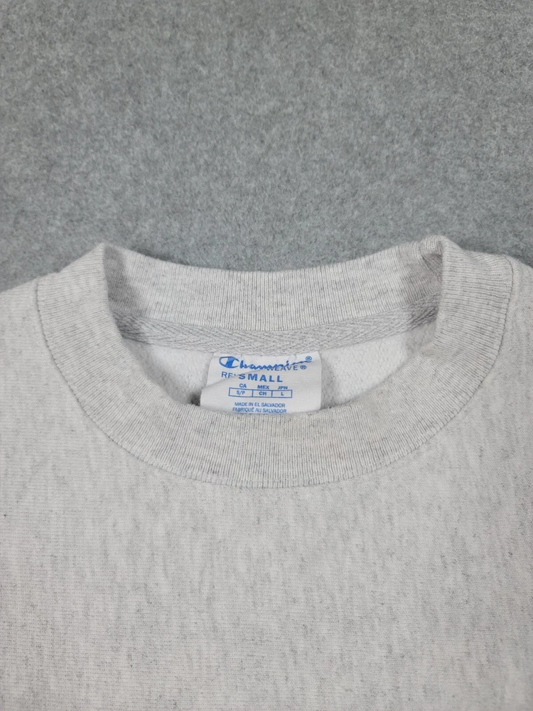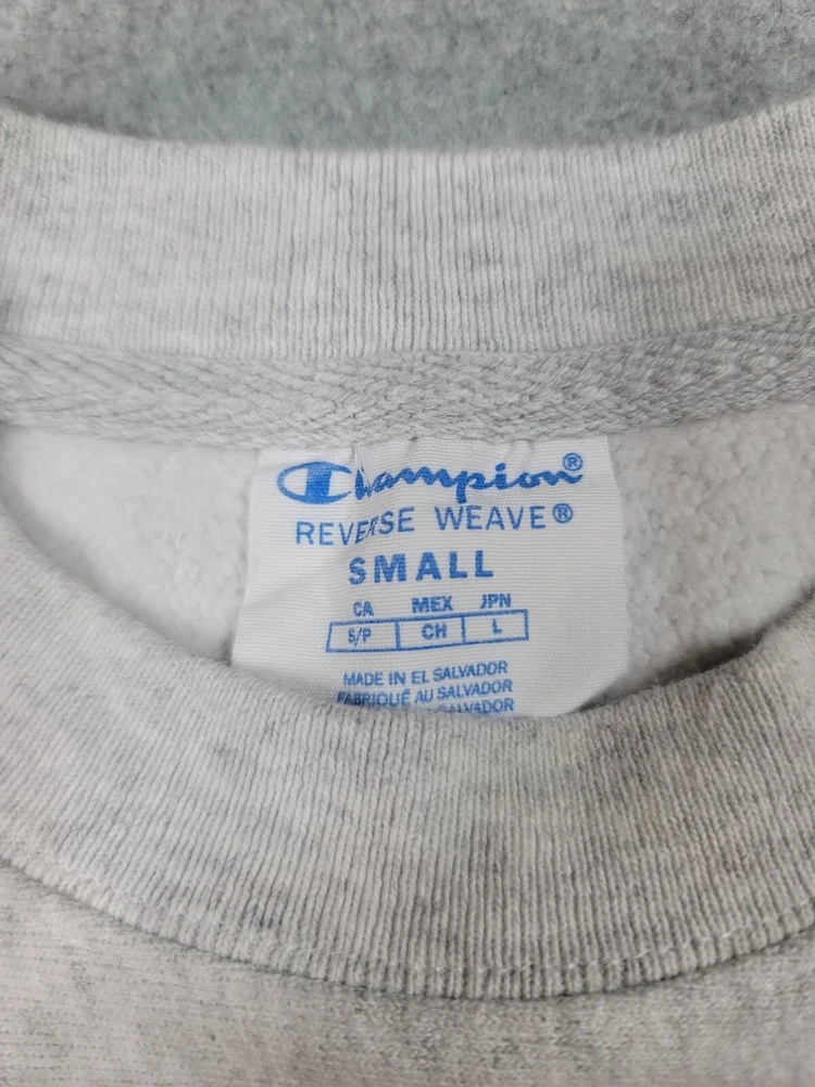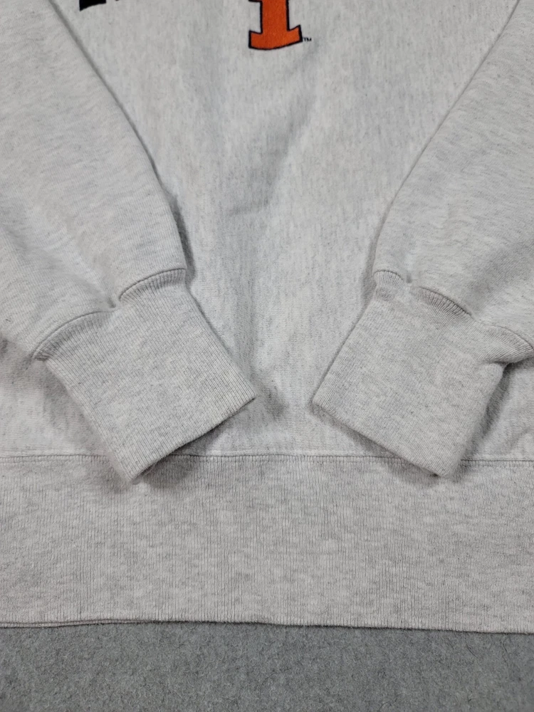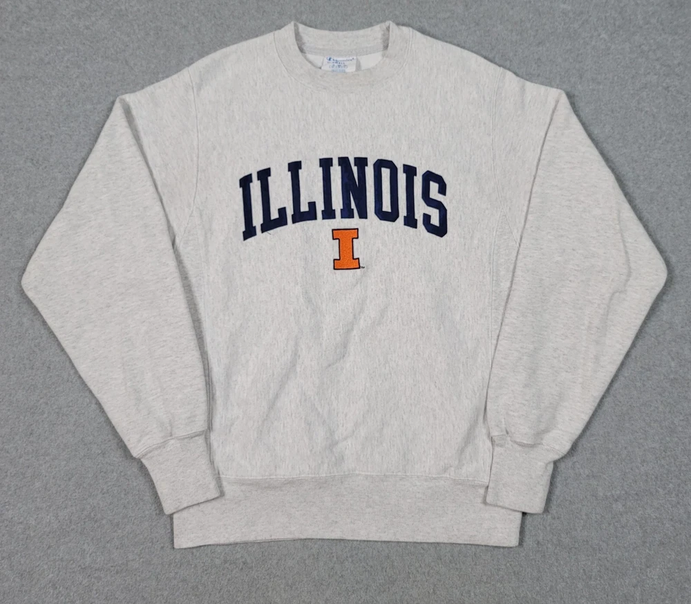 Collar has a very light stain. The product is a vintage gray Champion reverse weave sweatshirt in size S, officially licensed by the NCAA for the Illinois Fighting Illini football team. It is a Y2K era item made in El Salvador and is suitable for both male and female adults.
