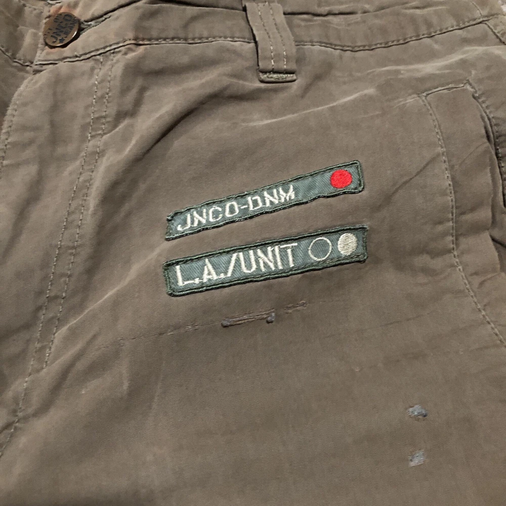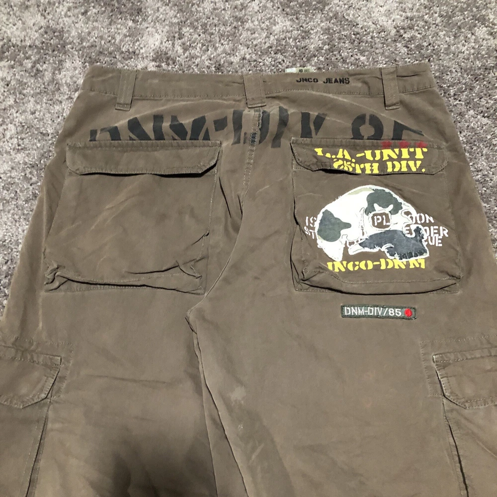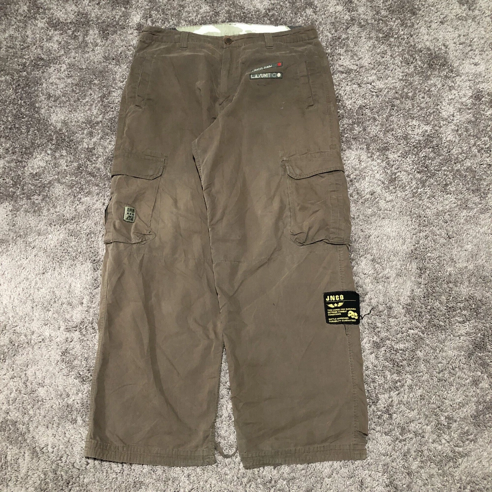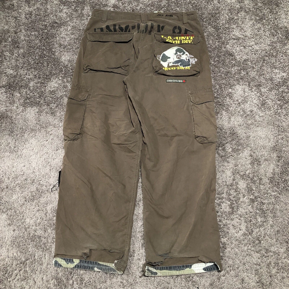 Vintage Y2K JNCO Jeans Baggy Army Cargo Pants Men’s 38x32 Brown LA Unit Skull Preowned Small grease spot on leg, and bottoms at ankle are cut some on the back. Hole starting at crotch bottom, could use patching up. A couple bleach spots on back and front waist. See pictures for overall condition Have some nice army style designs and patches Please see pics and ask questions before purchasing Thanks!