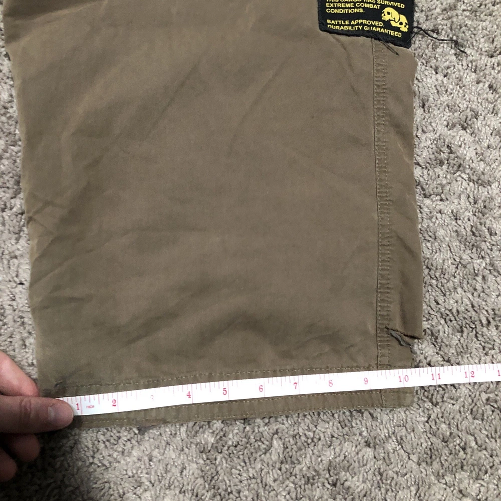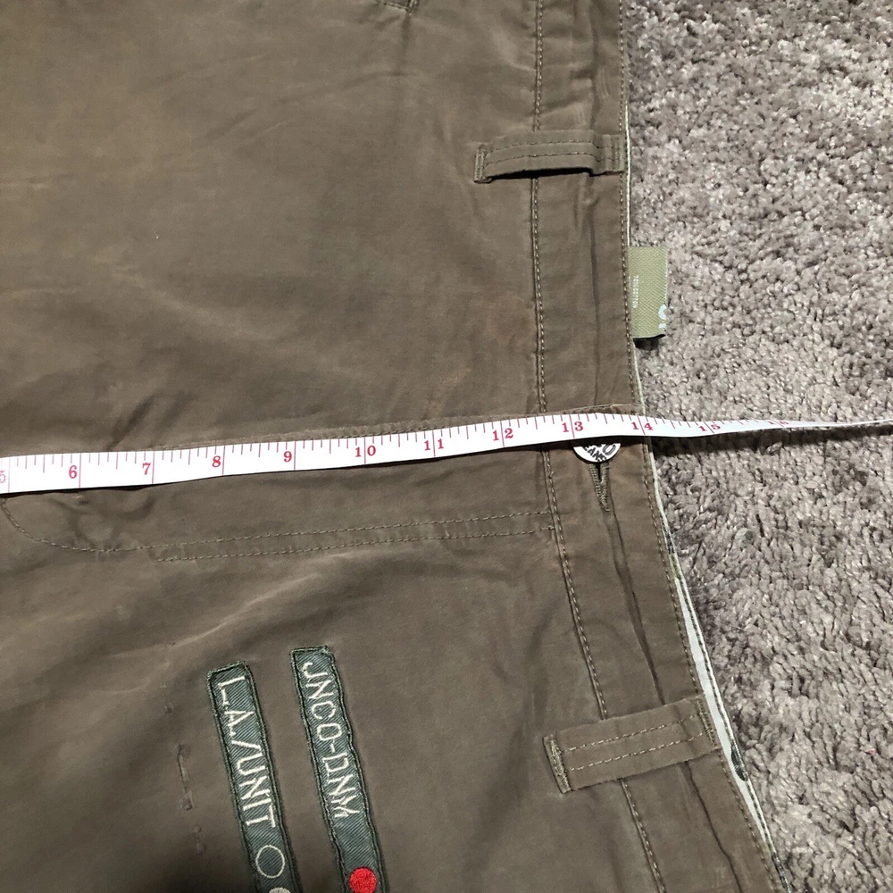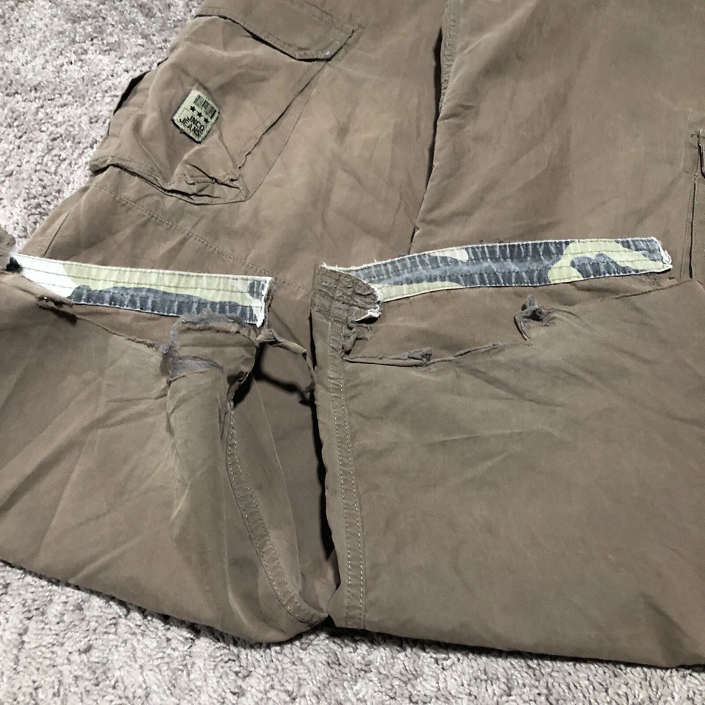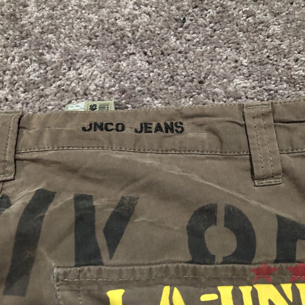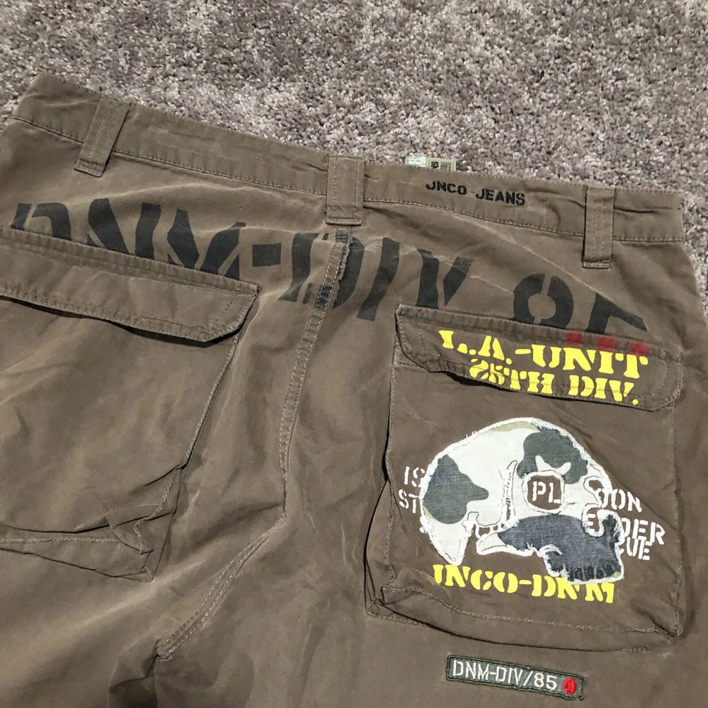 Vintage Y2K JNCO Jeans Baggy Army Cargo Pants Men’s 38x32 Brown LA Unit Skull Preowned Small grease spot on leg, and bottoms at ankle are cut some on the back. Hole starting at crotch bottom, could use patching up. A couple bleach spots on back and front waist. See pictures for overall condition Have some nice army style designs and patches Please see pics and ask questions before purchasing Thanks!
