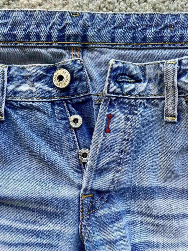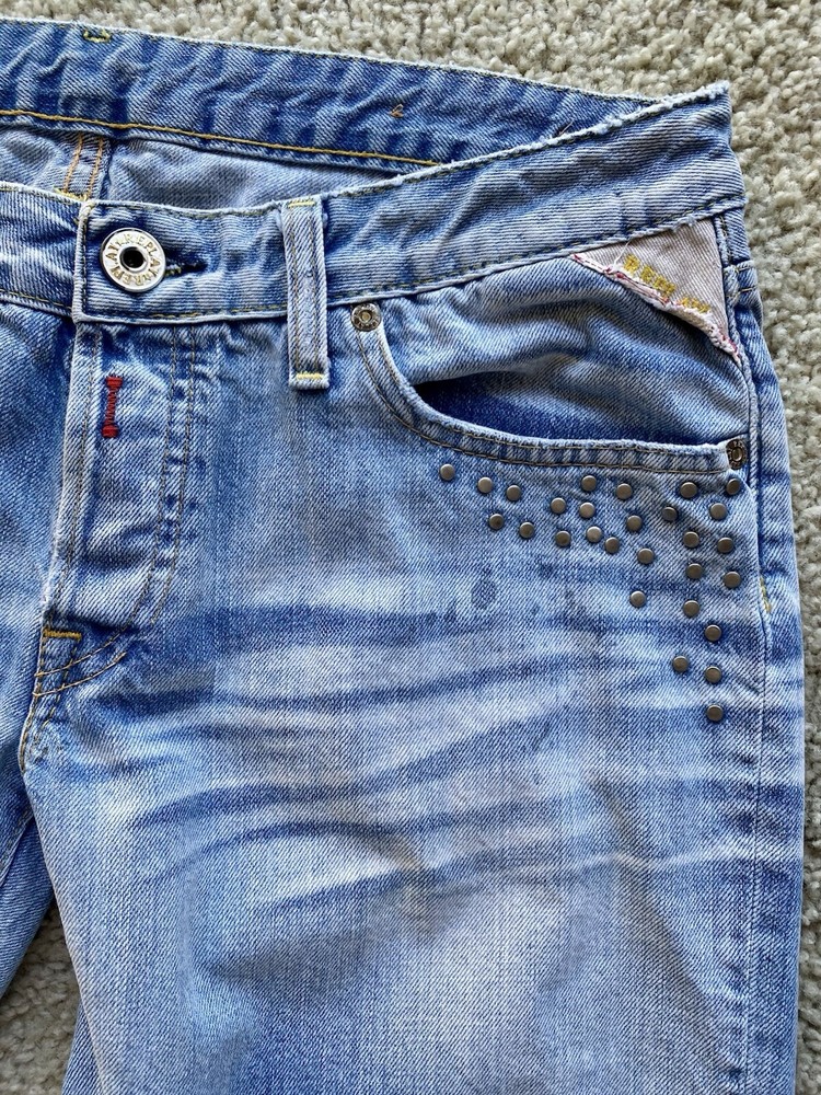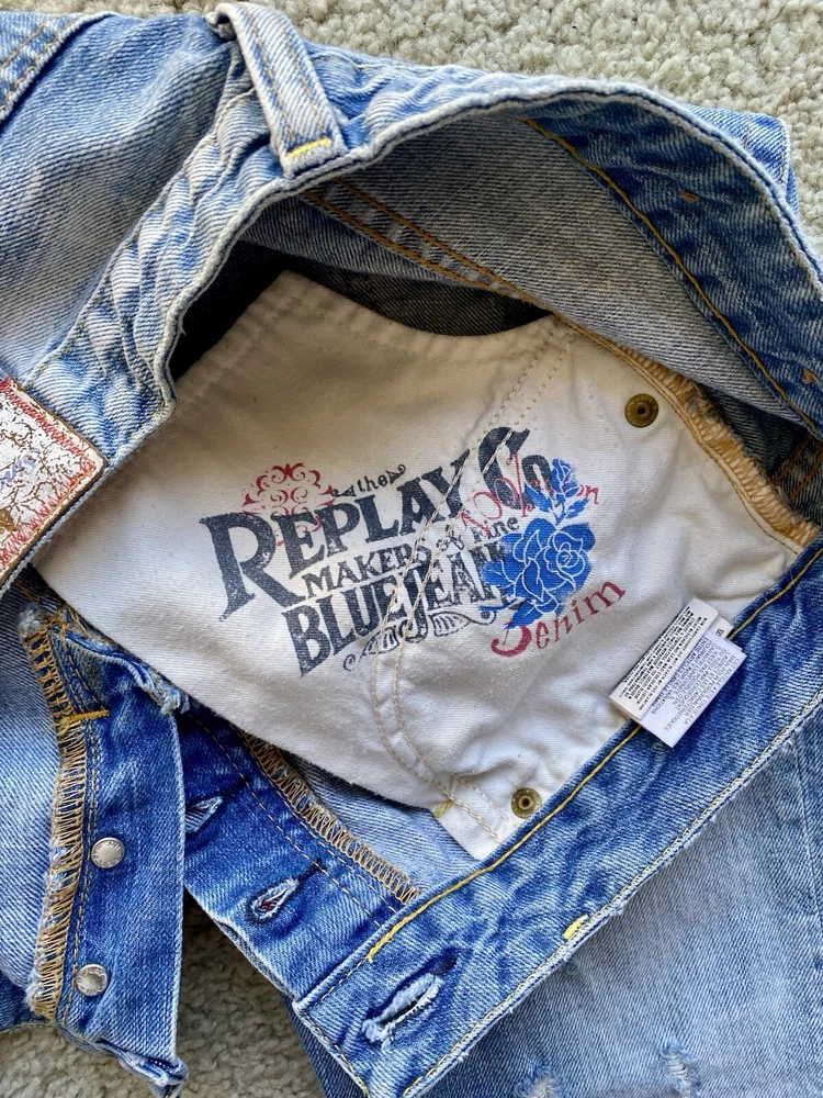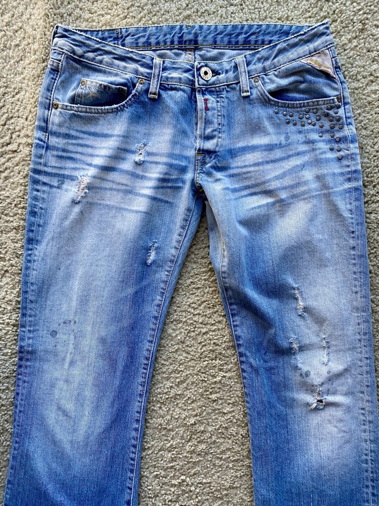 Replay Vintage Y2K Low Rise Distressed Studded Straight Leg Jeans Like new condition! ✨ Bought back in 2006, worn once, been hanging in my closet since! Retail: $170 Made in Italy These low-rise distressed studded jeans are peak Y2K, a pair of denim Britney Spears or Paris Hilton would love. 3-button fly closure. Intentional distressing and splattering details, along with silver grommets/studs on the left pocket. *Measurements taken while garment was laid flat Rise: 8 inches Length: 39-40 inches Waist: 17 inches Leg opening: 8 inches Inseam: 31 inches 90s, Y2K, vintage, 2000s, Britney Spears, distressed, studded, low-rise, low rise