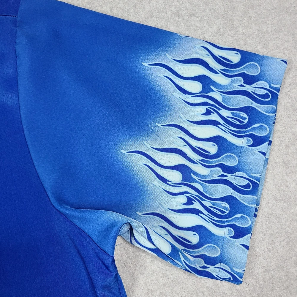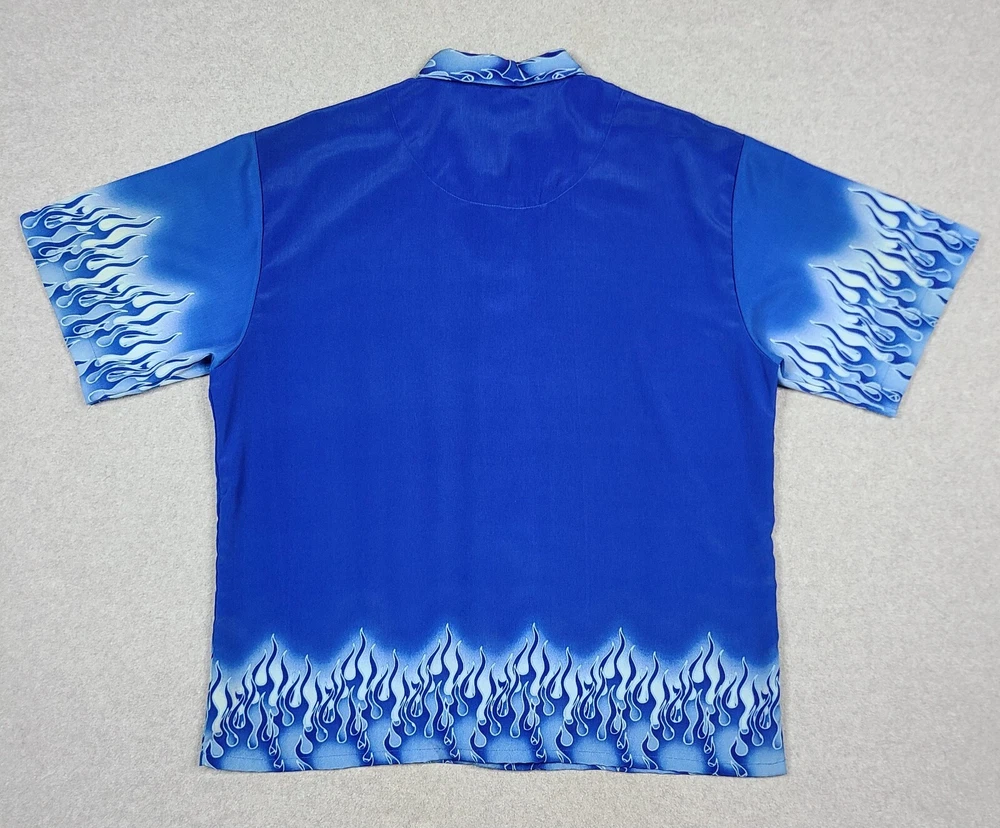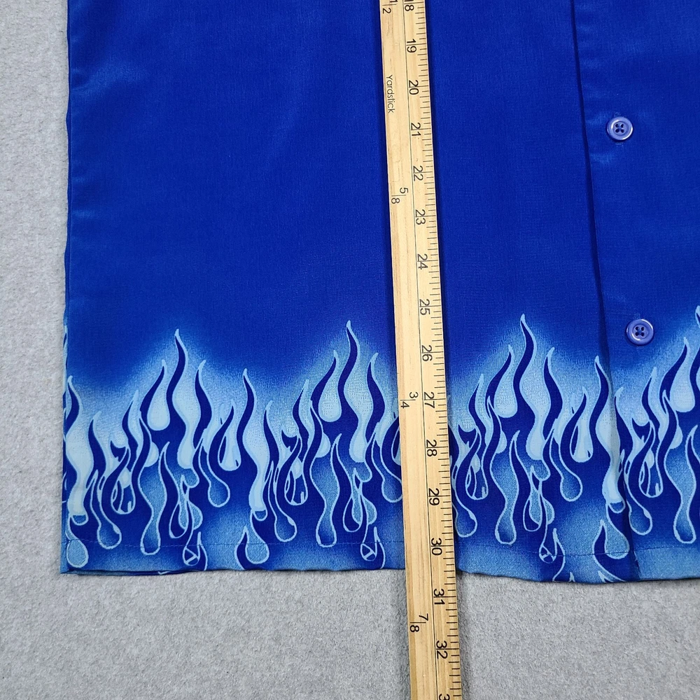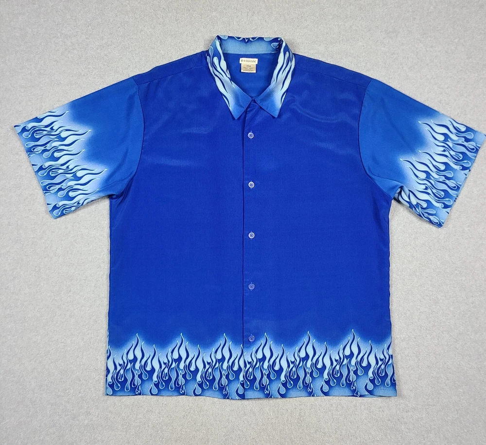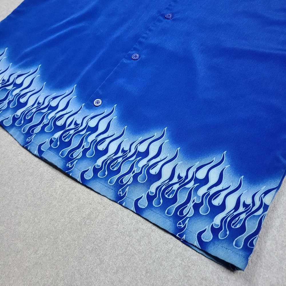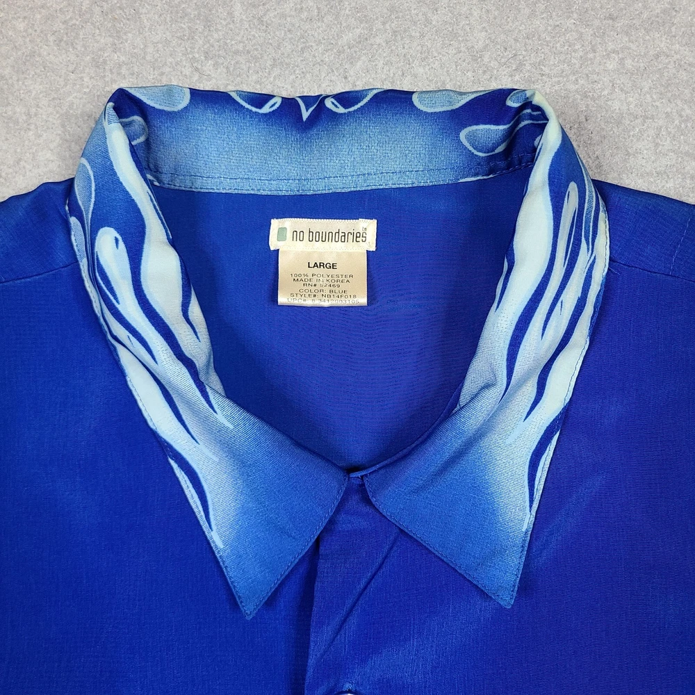 Elevate your style with this vintage Y2K No Boundaries button-up shirt. Featuring a bold graphic print with a flame and fire design, this shirt is perfect for travel, parties, and casual occasions. The short-sleeved collared shirt with a point collar style and button accents is made of lightweight and breathable polyester material that makes it comfortable to wear in all seasons. This machine-washable shirt comes in a black color and size large, fitting regular size types. It has a biker, motorcycle, hippie, punk, grunge, metal, gothic, retro, hipster, fire, Hawaiian, 70s, 80s, and 90s theme, making it a versatile addition to your wardrobe. Made in Korea, this shirt is perfect for those who want to make a statement with their fashion choices.