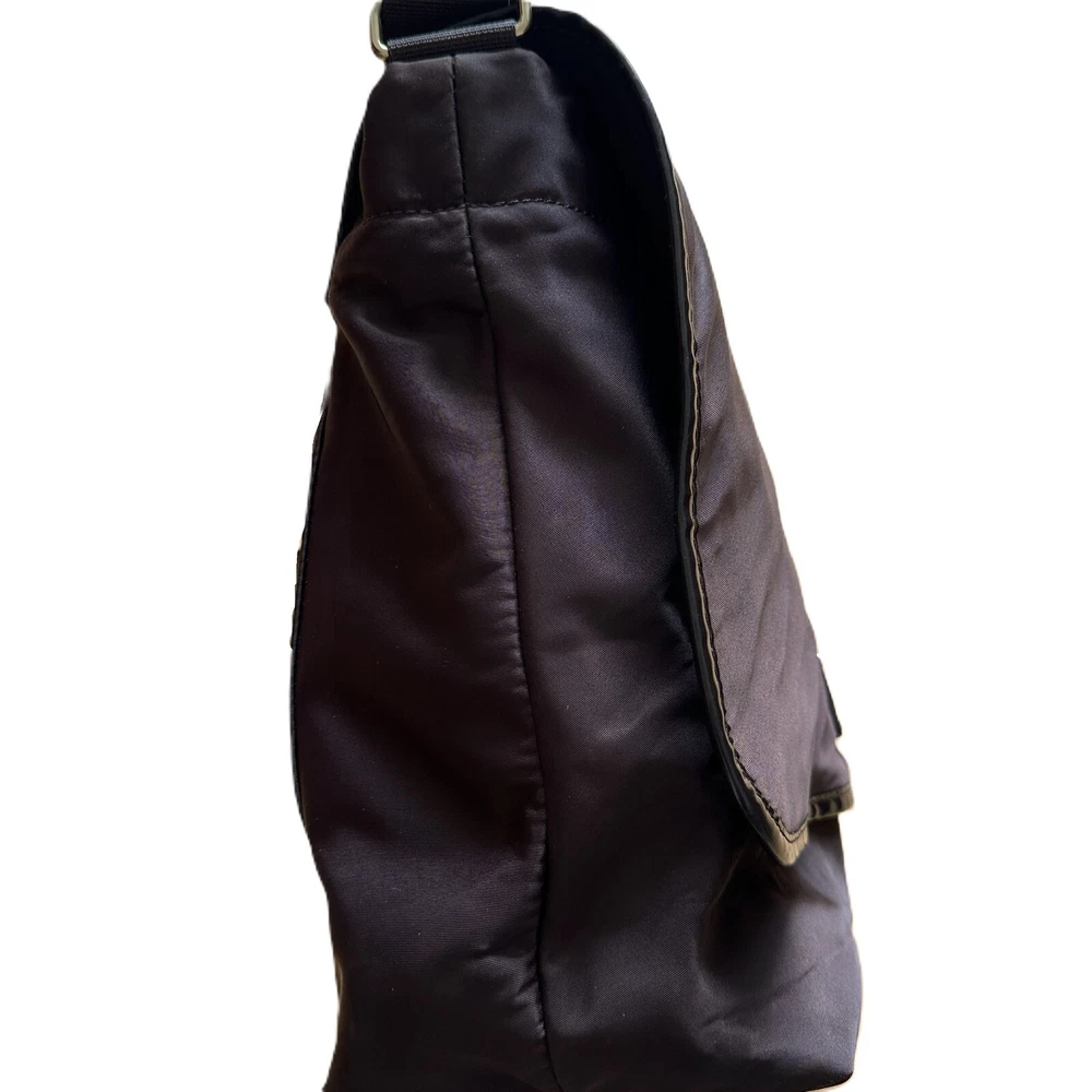 Y2K Kate Spade brown nylon messenger bag. Patent leather trim and logos, gold hardware, magnetic flap closure, red polka dot lined, one interior zip pocket, four interior slip in pockets and one external slip in pocket with magnetic closure. Adjustable crossbody strap. Measures approximately 13 x 12 x 5. Good used condition, polka dot print on lining is bleeding into the red color. Minor cosmetic wear to exterior, not noticeable when worn.