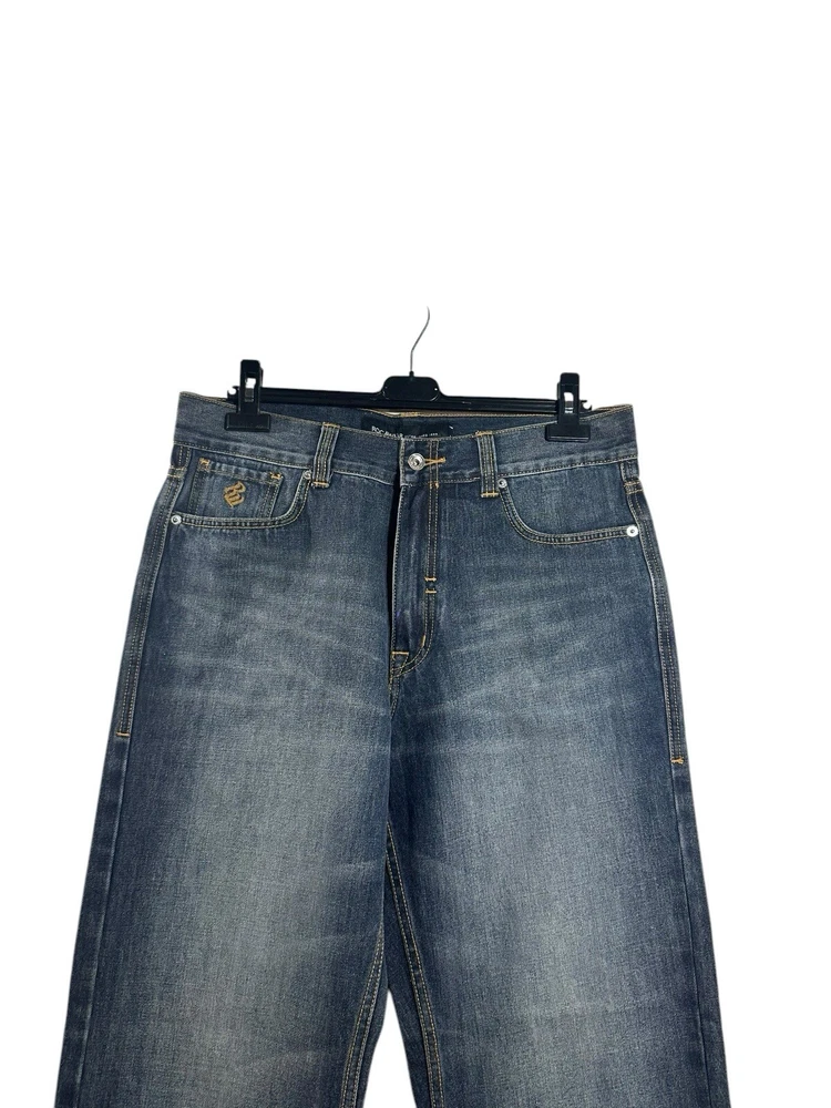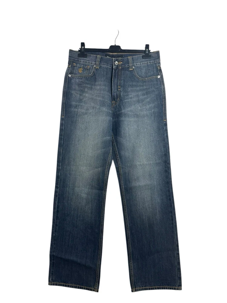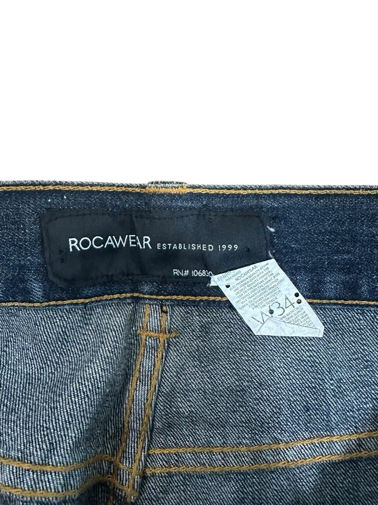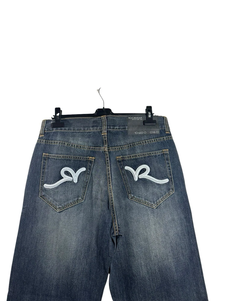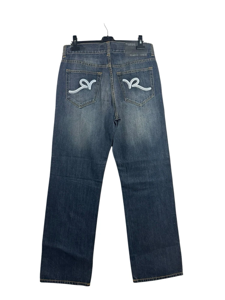 Vintage Y2K Rocawear Jeans for men in a classic indigo blue colour. These wide-leg, relaxed fit denim pants feature embroidered accents and a high rise waist for that authentic 2000s hip hop style. Made from cotton denim, these jeans are machine washable and perfect for any season. The 5-pocket design and 34-inch inseam make them a comfortable and stylish choice for any casual outing.