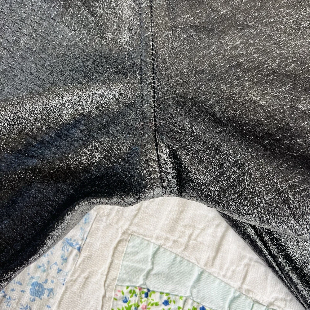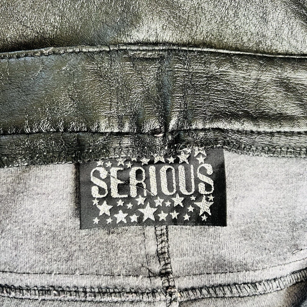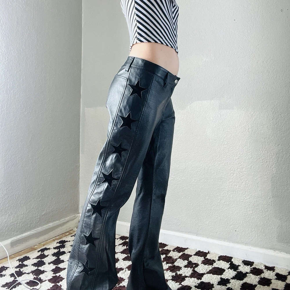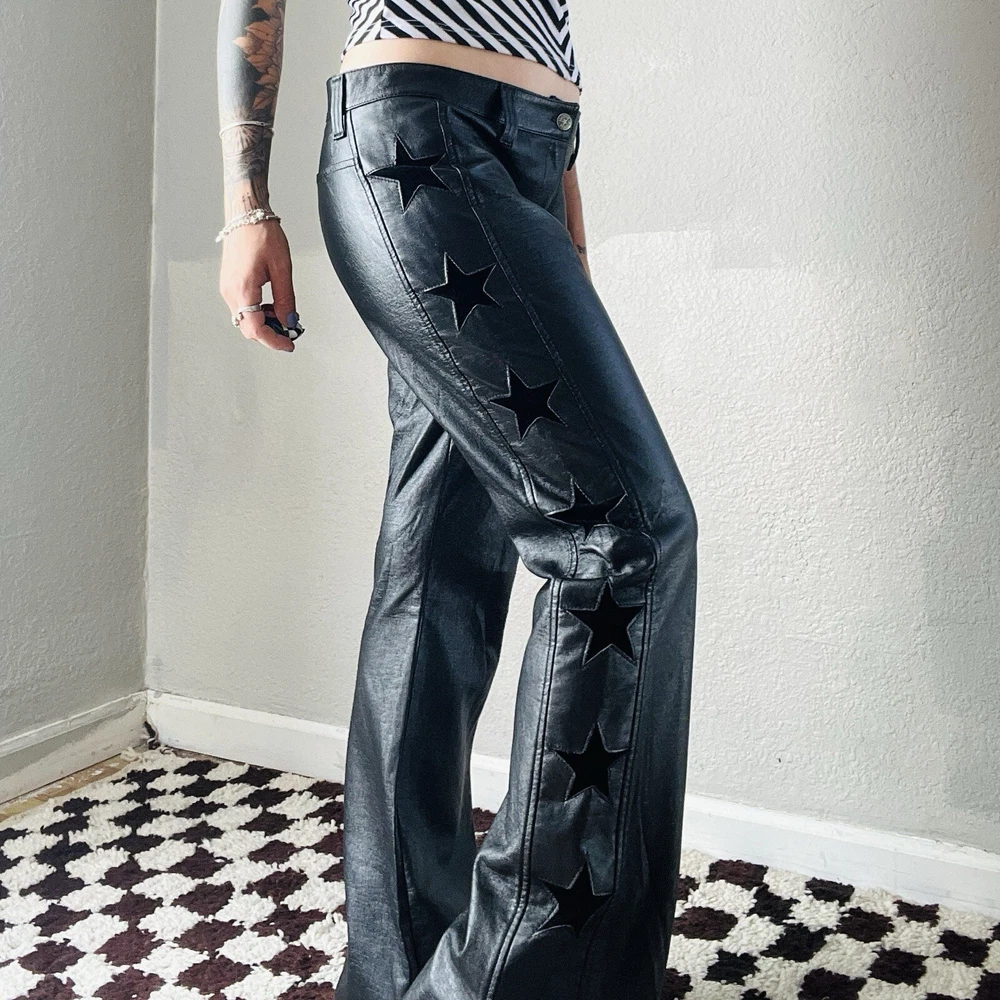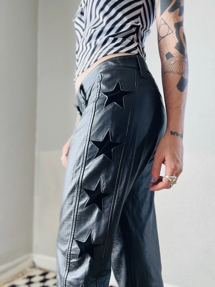 Y2K pleather star pants by Serious. Shown pinned on a 5’3” tall model, waist measures 33” (low rise), hips measure 39” and inseam measures 31 1/2”. Fits like a M/L. Some cracking to pleather in crotch area as pictured, not visible when worn. In good vintage condition.