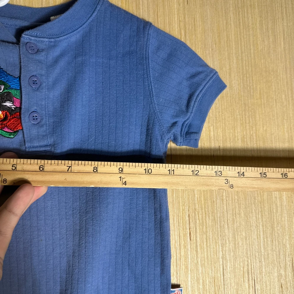This Vintage Y2K Sesame Street Snap Bodysuit in blue featuring Count Dracula design is perfect for kids aged 24 months. Made from 100% cotton, this short sleeve bodysuit with snaps for easy dressing is great for casual occasions. The retro 90s style and TV character theme make it a fun and unique addition to your little one's wardrobe. Easy to care for with machine washable instructions, this onesie is a nostalgic and stylish choice for your child.