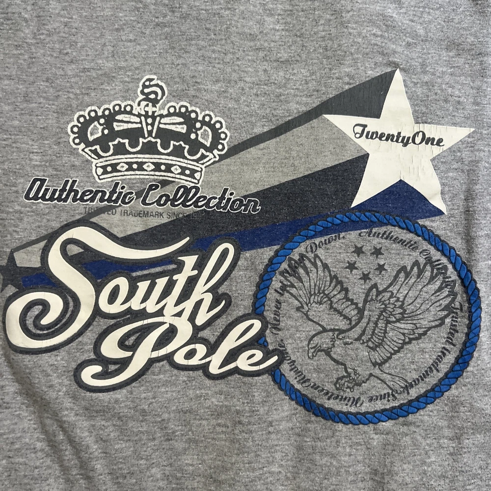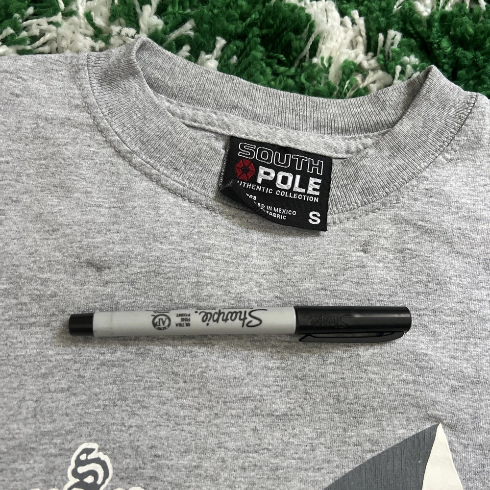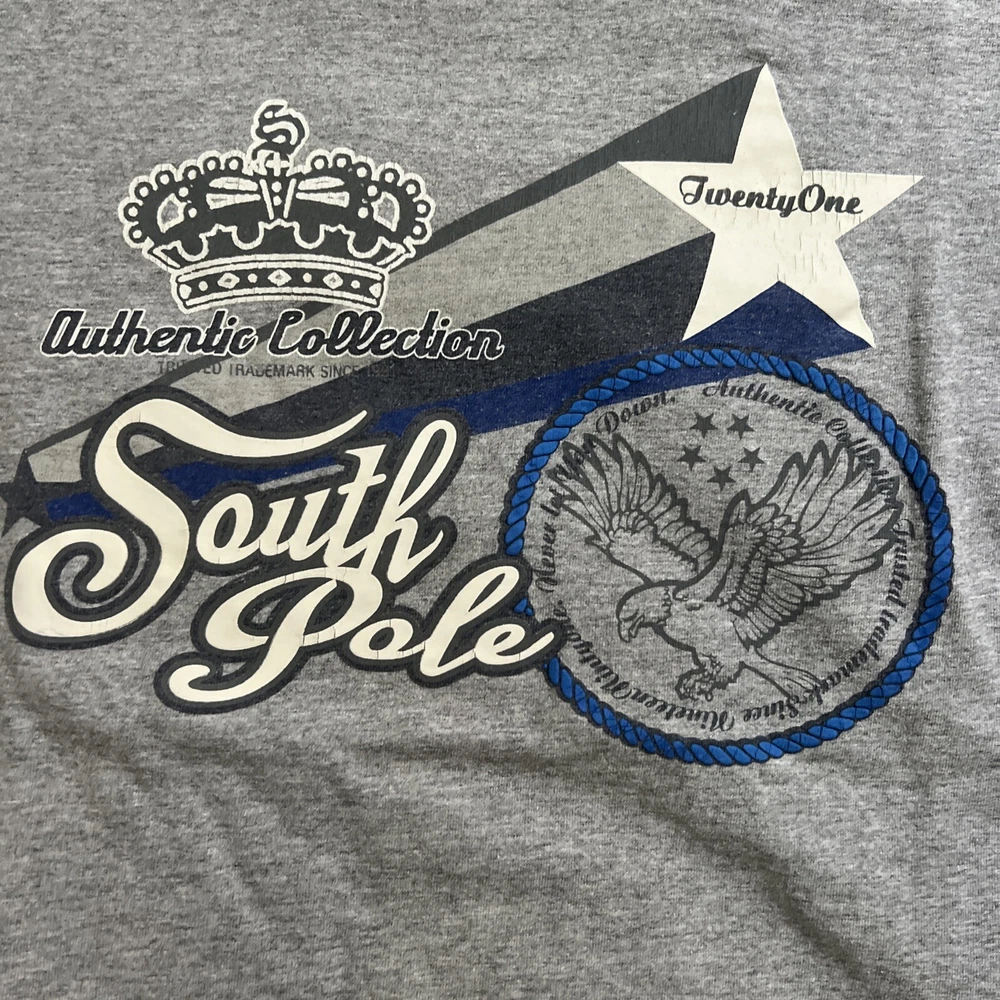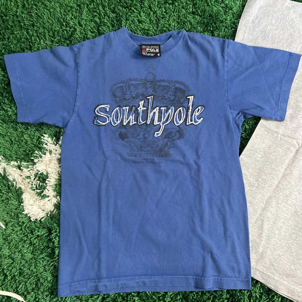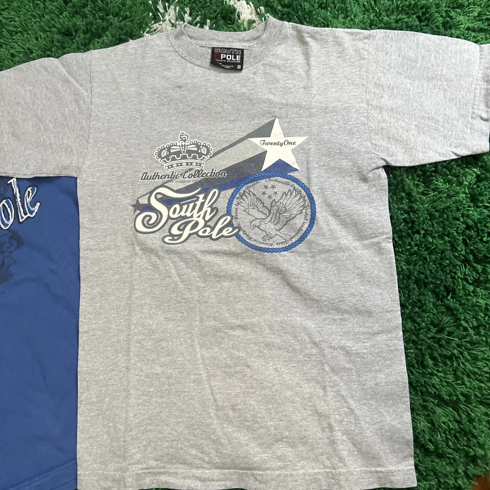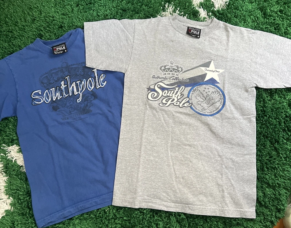 2 vintage South Pole graphic t shirts. They are in great shape and the only flaw is 2 small marks at the top of the grey shirt as seen in the photos. The measurements on the blue shirt are 16.5” pit to pit and 23” top to bottom. The measurements for the grey shirt are 17.5” pit to pit and 26” pit to pit. Please see all photos