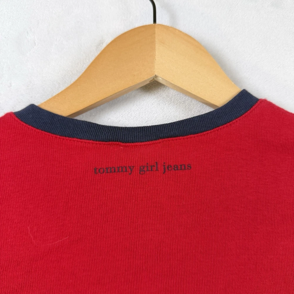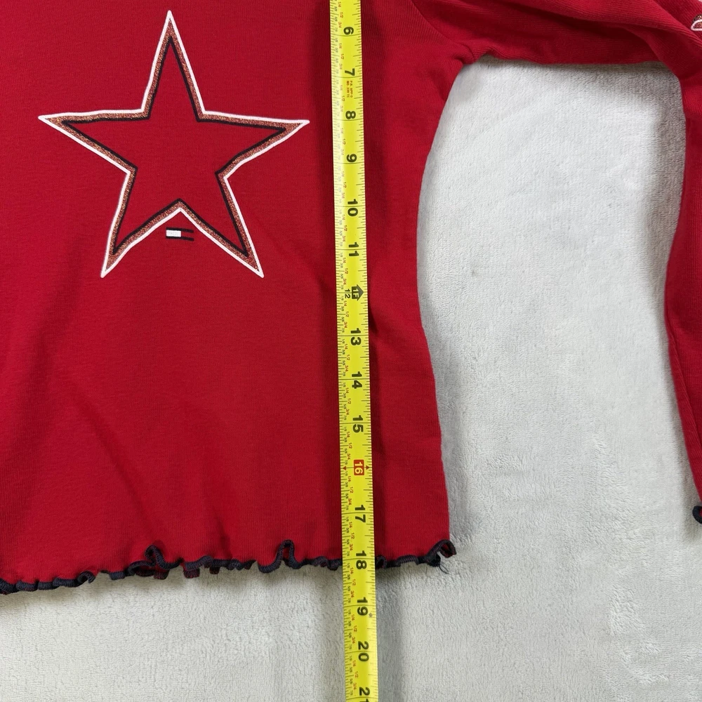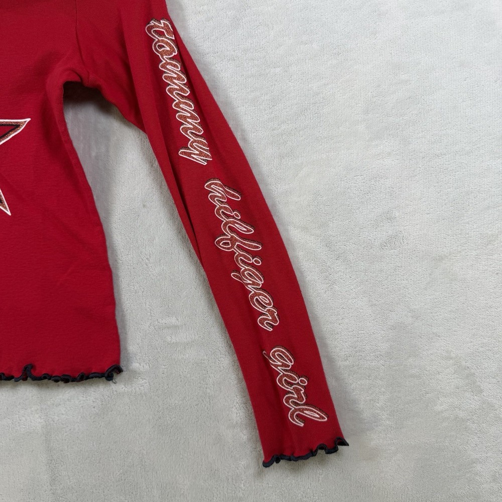 This Vintage Y2K Tommy Hilfiger Girls Shirt in Youth size M is a stylish addition to any young girl's wardrobe. Made of comfortable cotton jersey fabric with a crew neckline and pullover closure, this red shirt features the iconic Tommy Hilfiger star logo with glitter accents, adding a touch of sparkle and fun. Perfect for casual or travel occasions, this shirt is easy to care for and suitable for all seasons, making it a versatile and trendy choice for any young fashionista.
