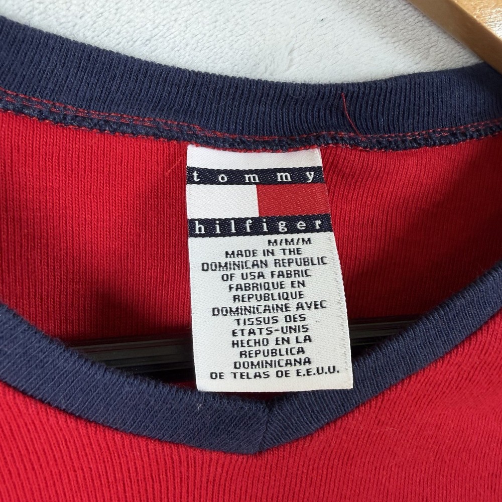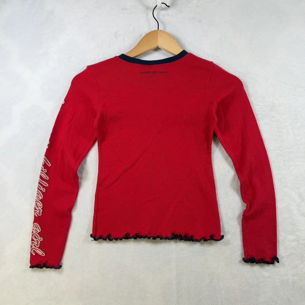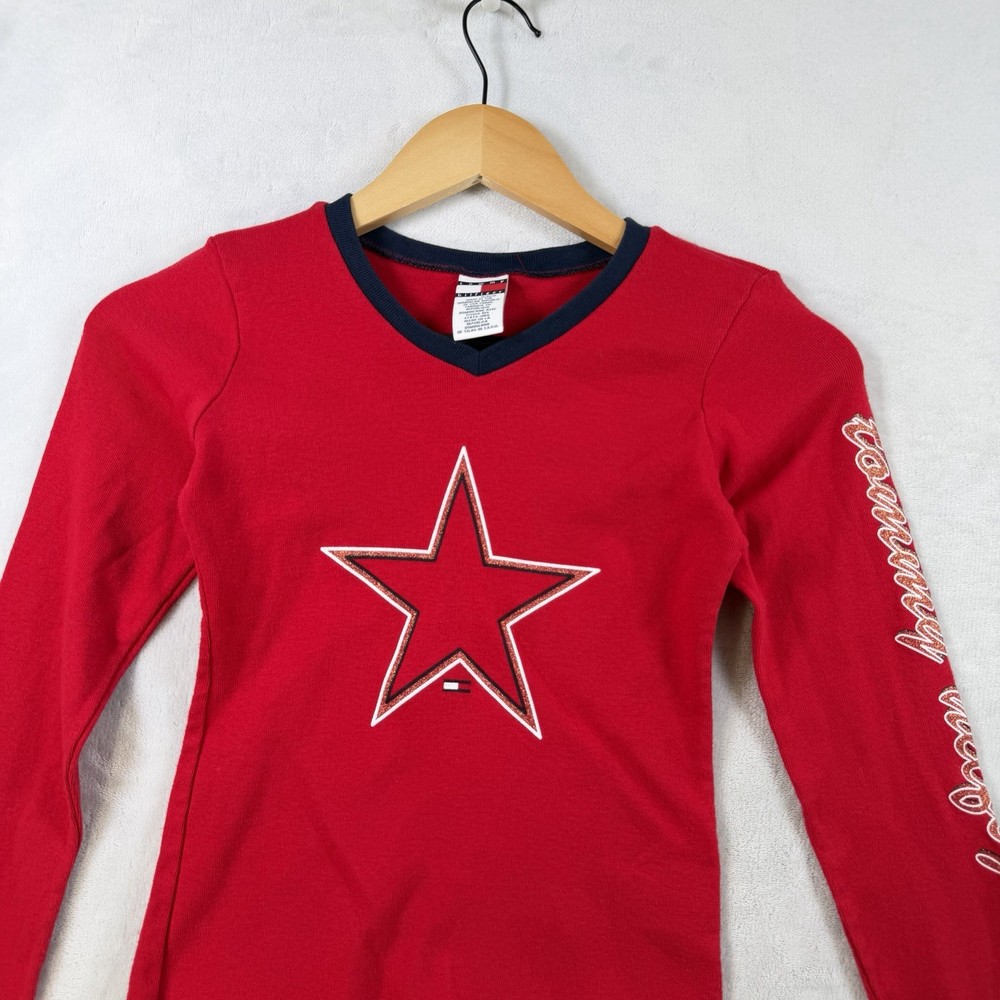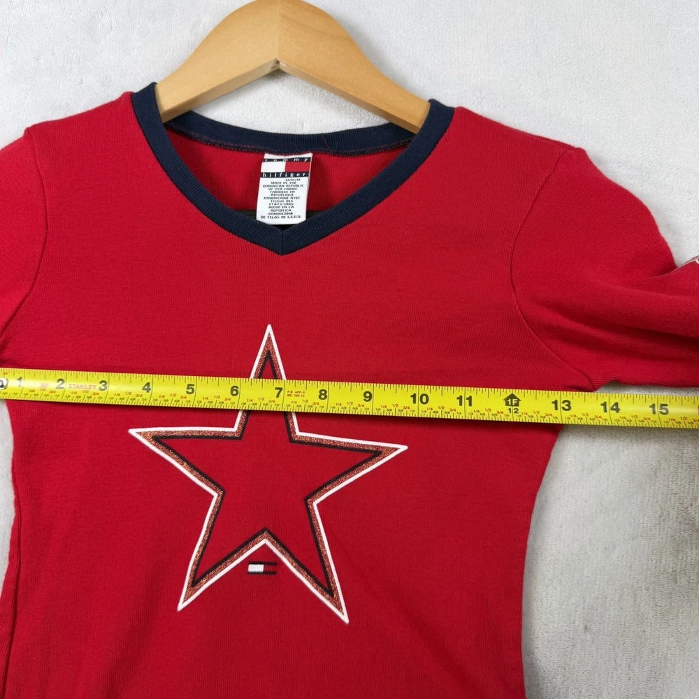 This Vintage Y2K Tommy Hilfiger Girls Shirt in Youth size M is a stylish addition to any young girl's wardrobe. Made of comfortable cotton jersey fabric with a crew neckline and pullover closure, this red shirt features the iconic Tommy Hilfiger star logo with glitter accents, adding a touch of sparkle and fun. Perfect for casual or travel occasions, this shirt is easy to care for and suitable for all seasons, making it a versatile and trendy choice for any young fashionista.