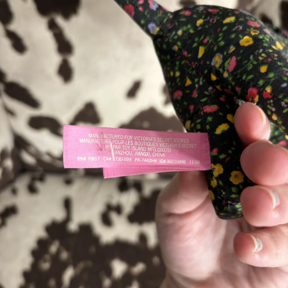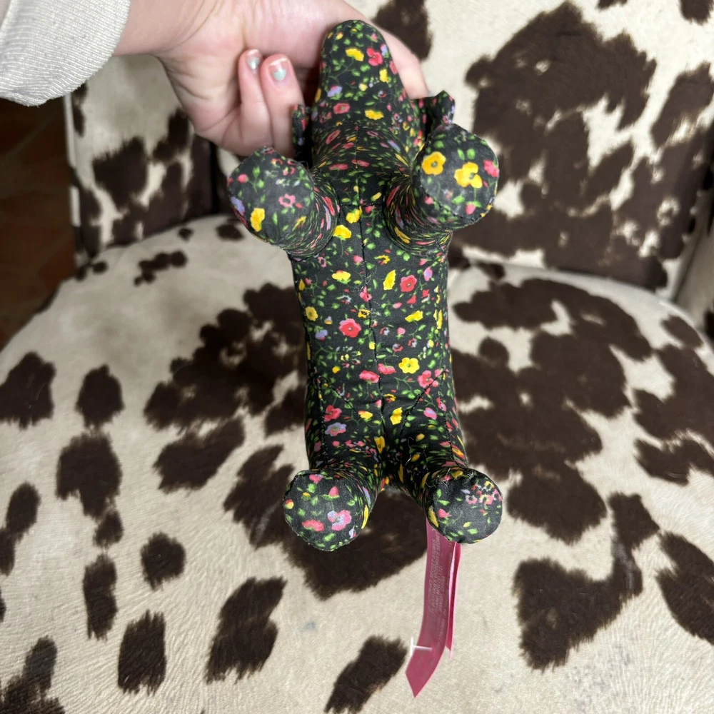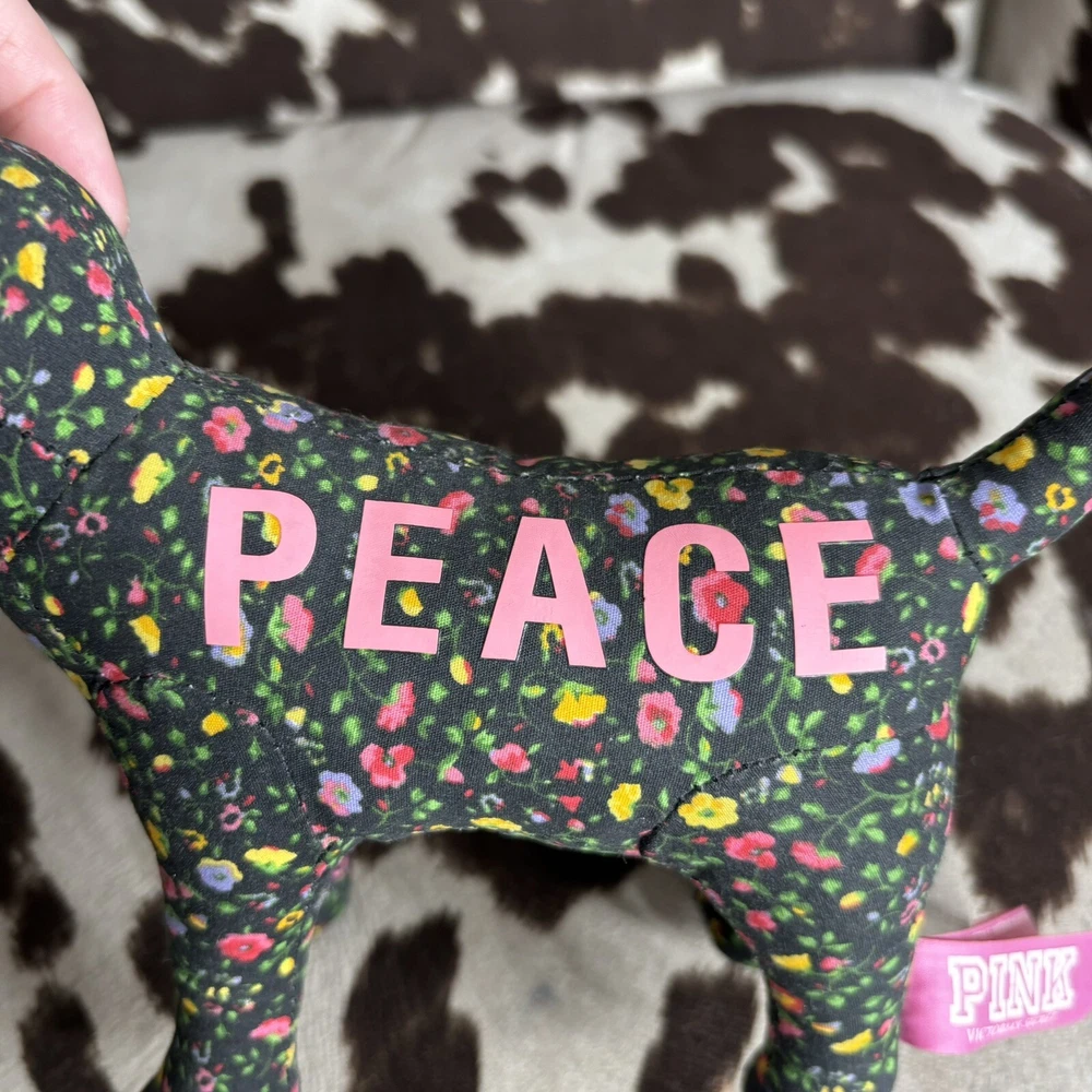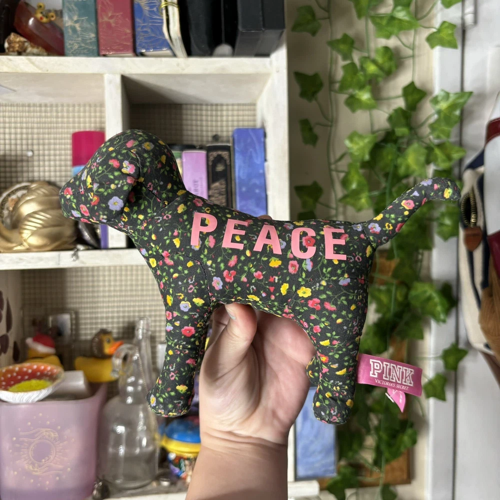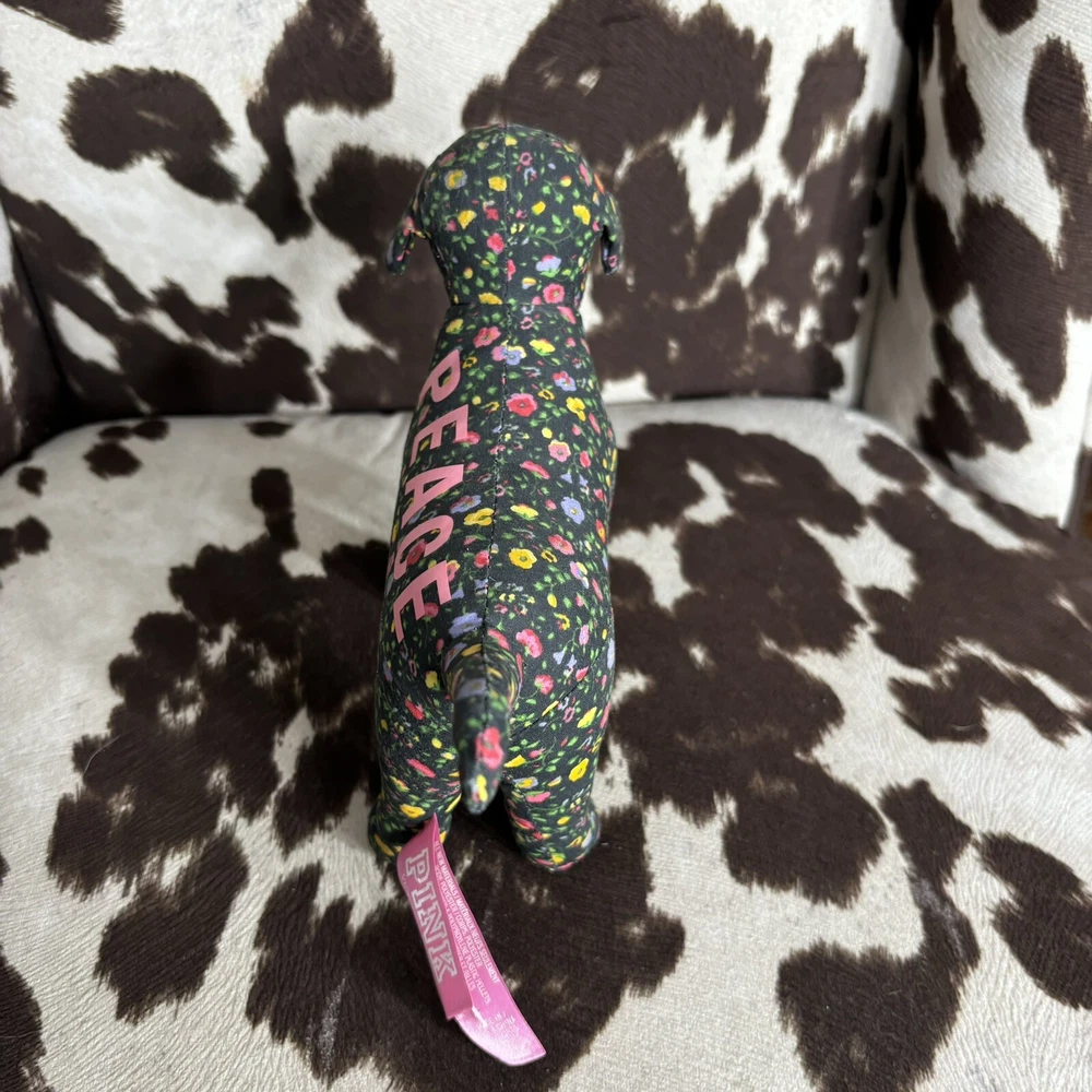 Vintage Y2K Victorias Secret PINK Dog Mascot Floral Wildflower ‘Peace’ 8” Plush In good overall condition. No stains, general wear from age and storage applies. Butt tags intact with plastic tag connector still intact. Rare and hard to find model. Black with wildflower/floral background and pink ‘Peace’ lettering decal. No cracking or fading on decal. Measures about 8” long.