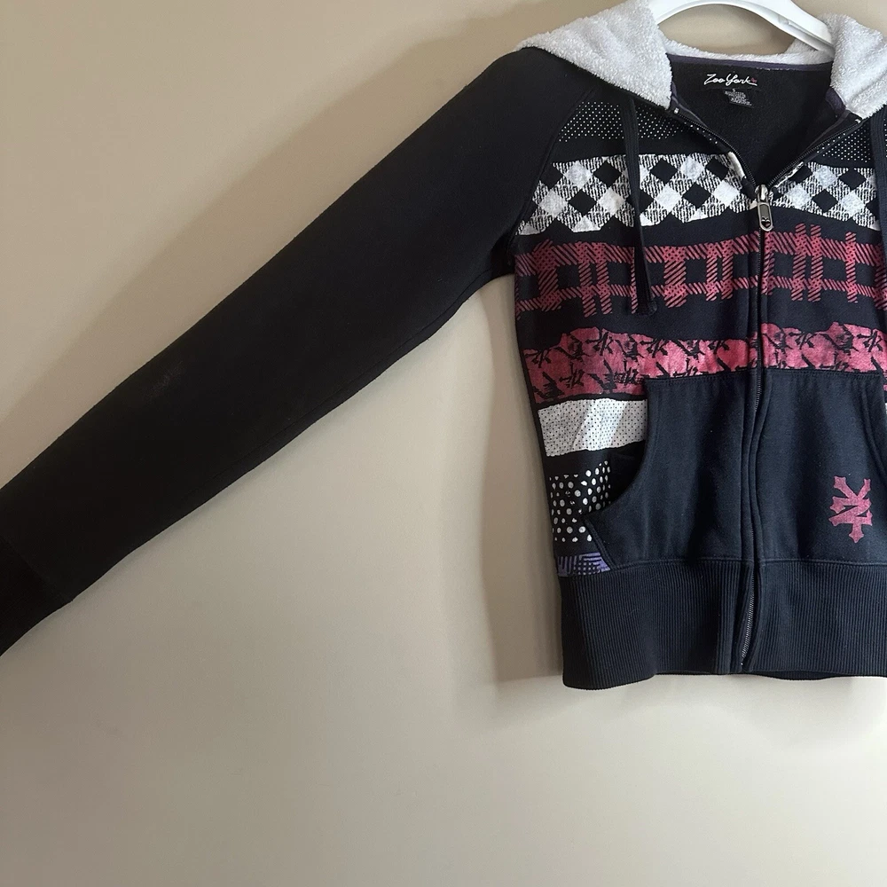 Vintage Y2K Zoo York Zip up Hoodie with fleece lined hood Women's size Small Pinkman 1990s Streetwear Skater Grunge Skateboard pockets & hidden pocket black, white, red, purple excellent vintage condition tags: streetwear grafitti approximate measurements lying flat length: 20" sleeve: 21" armpit to armpit: 17.5" 📦 Packaged with care 📬 I will ship it out within 2 business days 🙂 Smoke free home ♥️ Offers welcome.