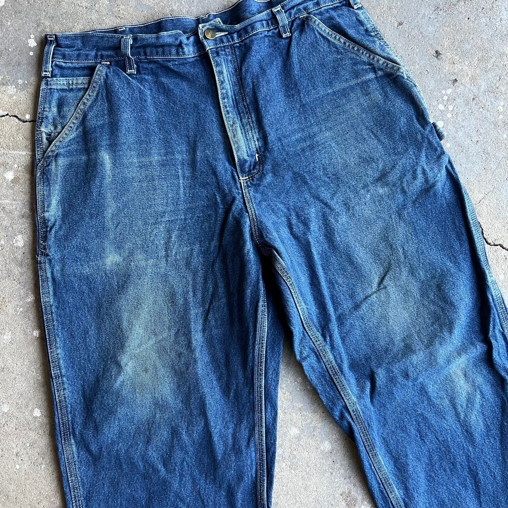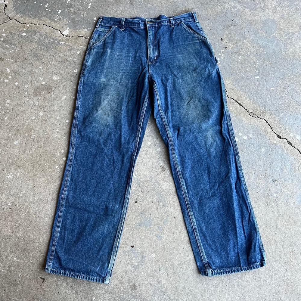Vintage Y2K blue Carhartt denim jeans work wear carpenter pants. Great pair. Measure 36x32.5 and a 9.5 leg opening. Please check measurements before purchasing. I do my best to show any flaws in pictures. Quick shipping! Bundles encouraged! @ants_haul on Instagram. 445!!!