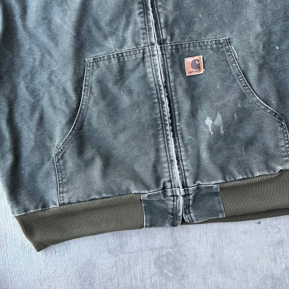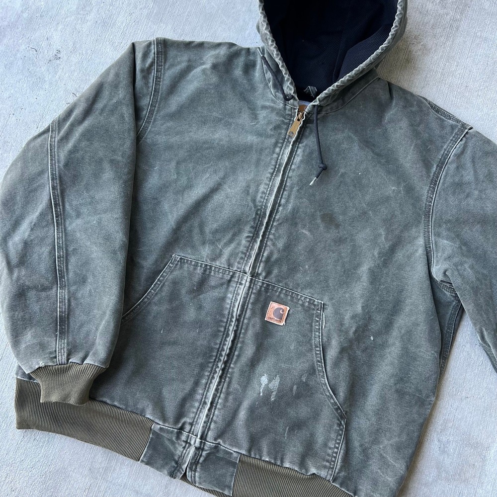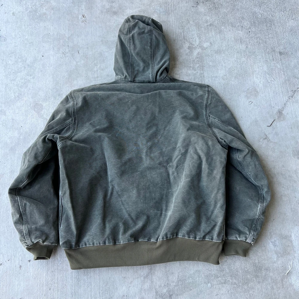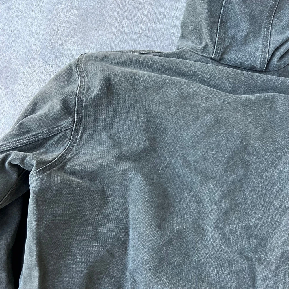 Vintage y2k active green mos carhartt hooded work wear jacket. Really nice jacket! Has some staining but nothing overly crucial. Light lining. Measures 27.5x28. Please check measurements before purchasing. I do my best to show any flaws in pictures. Quick shipping! Bundles encouraged! @ants_haul on Instagram.