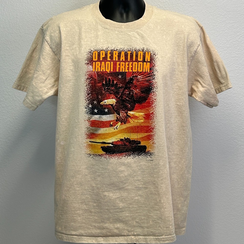 Vintage Operation Iraqi Freedom T Shirt Mens Large Y2Ks 2000s Iraq War Military Patriotic Bald Eagle American USA Flag Tank Saddam Hussein Bleach Spotted Tie Dye Beige Anvil Graphic Tee CONDITION: Has minor image cracking - no other flaws noticed. See photos. SIZE AND MEASUREMENTS: Mens/Unisex Large Width 21.5" - Underarm to underarm Length 28" - Measure from top of shoulder at the edge of collar to the bottom of the shirt