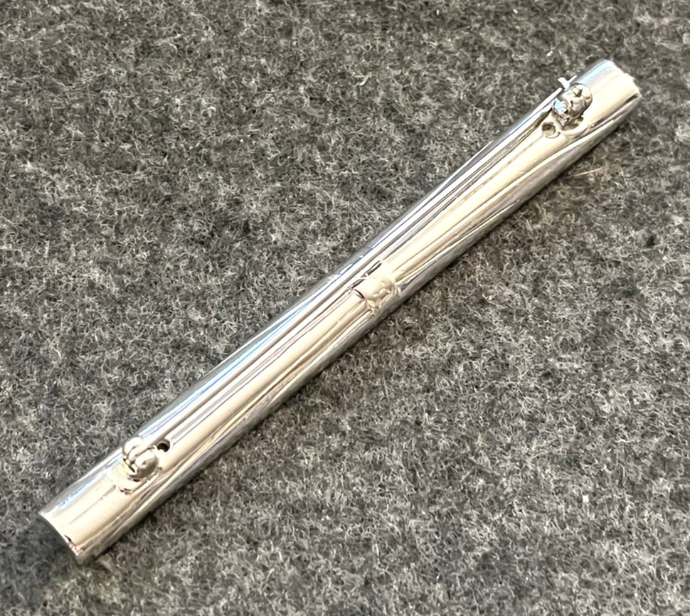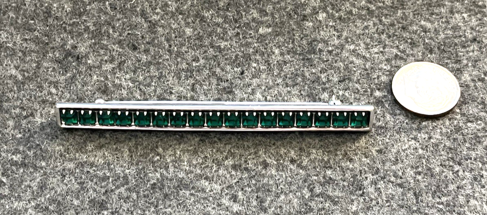 Guaranteed 100% authentic Yves Saint Laurent (YSL) rhodium plated silver tone bar pin / brooch! The pin has prong set forest green color rhinestones. It measures 3-1/8 inches long and 1/4 inch wide. The pin weighs 12.2 grams. Marking on the back side is "YSL", the stamping is partial but you can see it is there. A dime is placed for size reference and not included. Condition is excellent as shown! Please check out all pictures I have taken personally of the actual item. This is one of a kind, hard to find vintage YSL pin. Don't miss out! I do not accept return on this item due to delicate jewelry item. I describe my item exactly what it is. I personally took the pictures and measurements myself. * * * Non-smoking environment! * * *