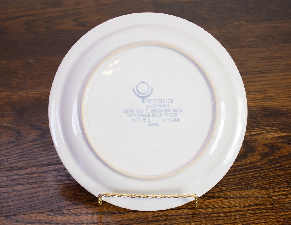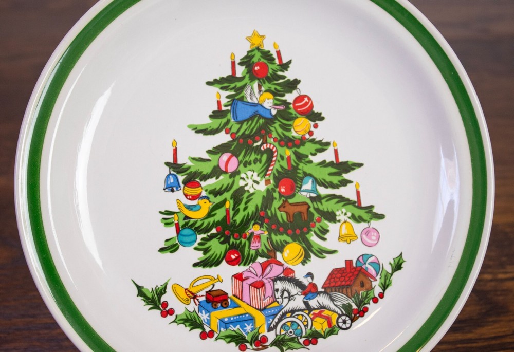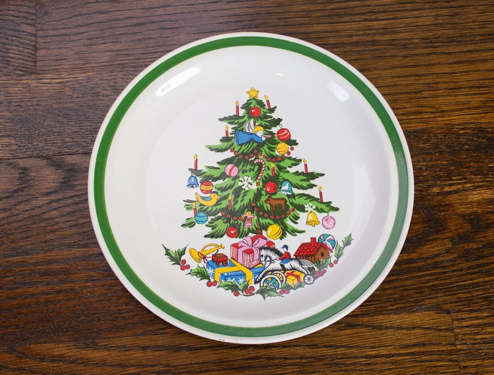 Classic vintage stoneware salad plate made by Yamaka in the holiday pattern Noel. Each plate has a green border and a decorated Christmas tree. The tree has presents scattered underneath. The plates are in great condition with no chips or cracks. One plate measures approximately 7.5" in diameter.