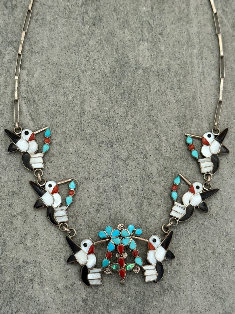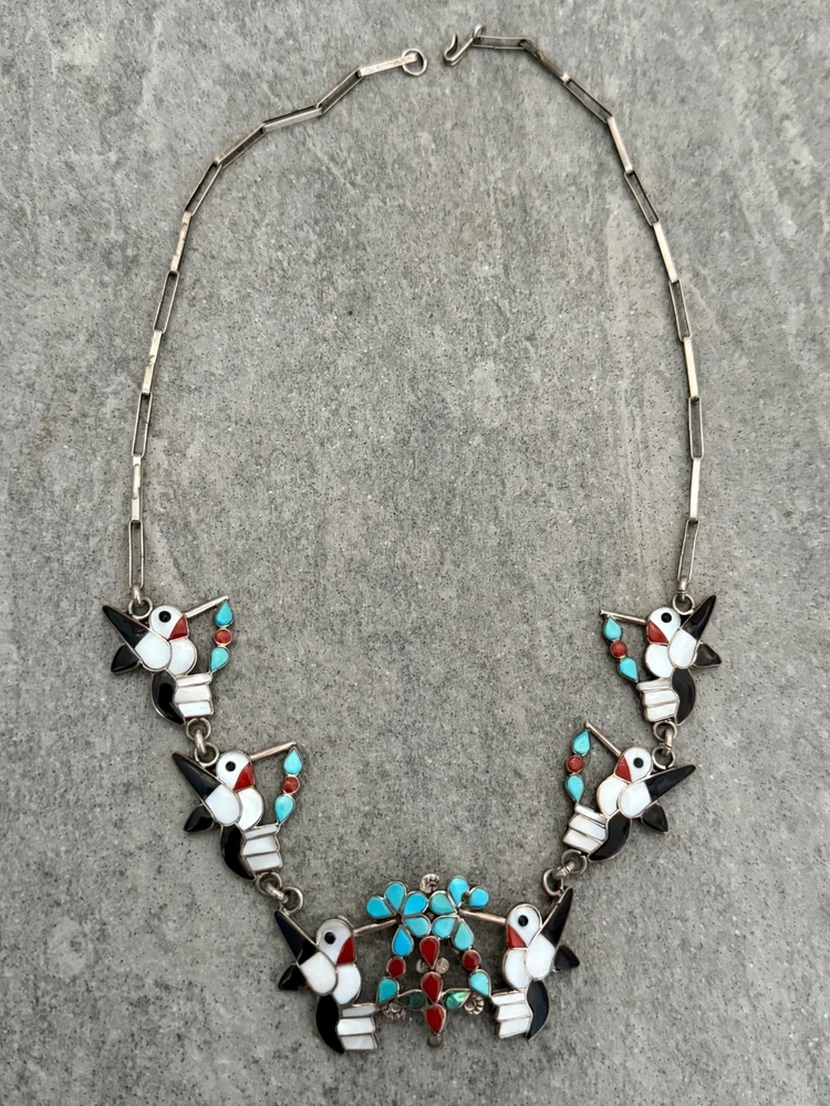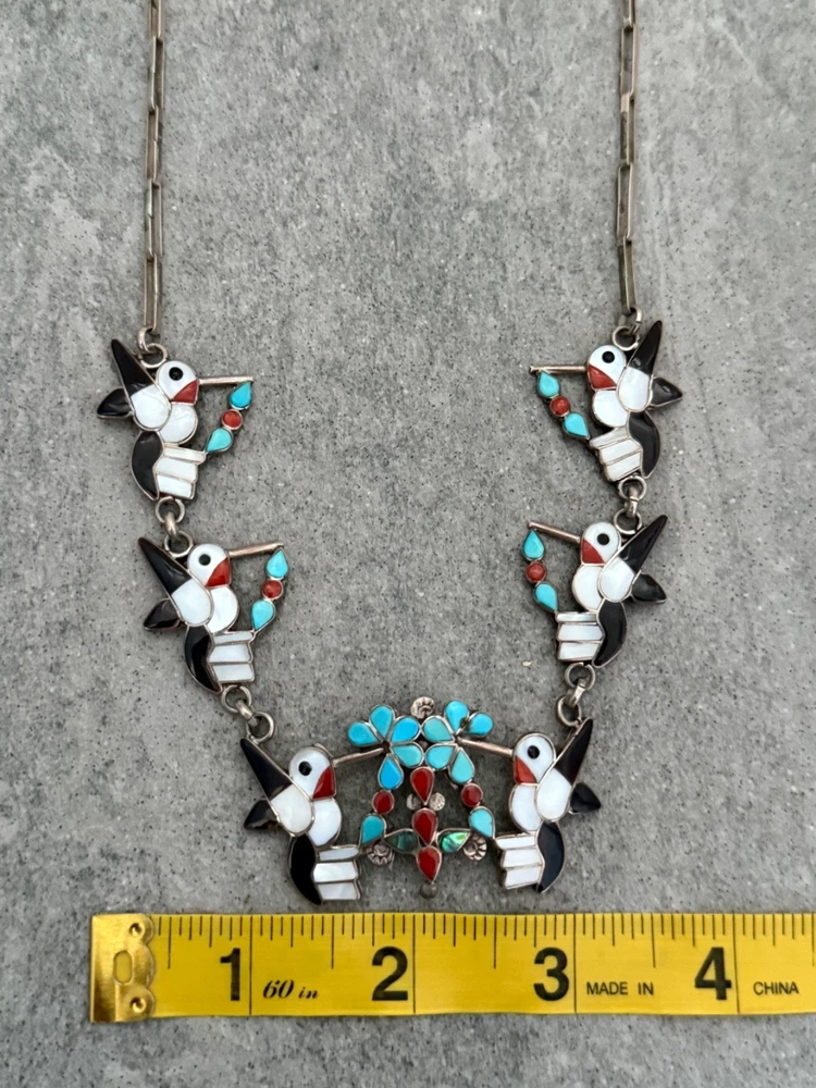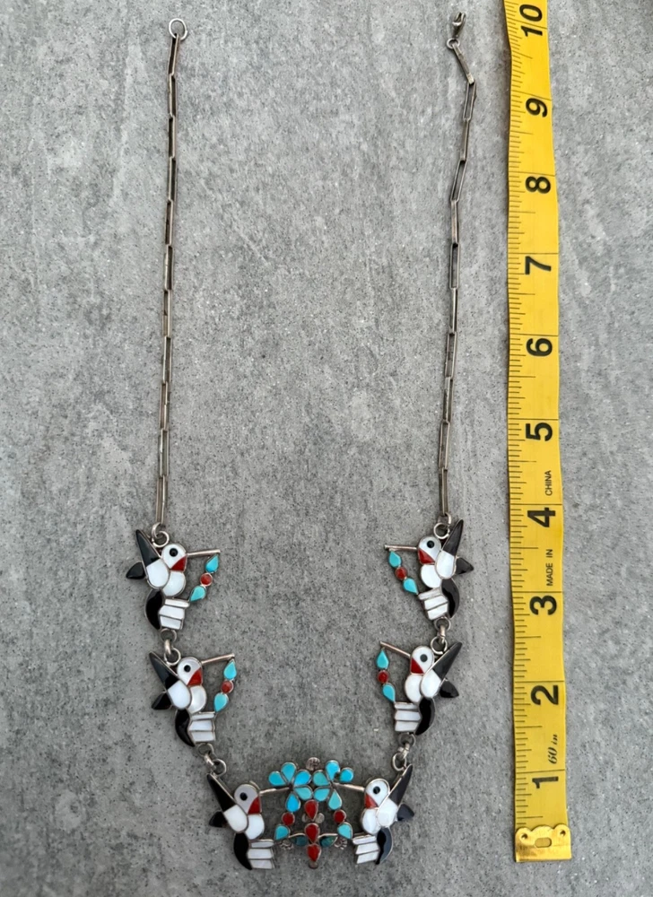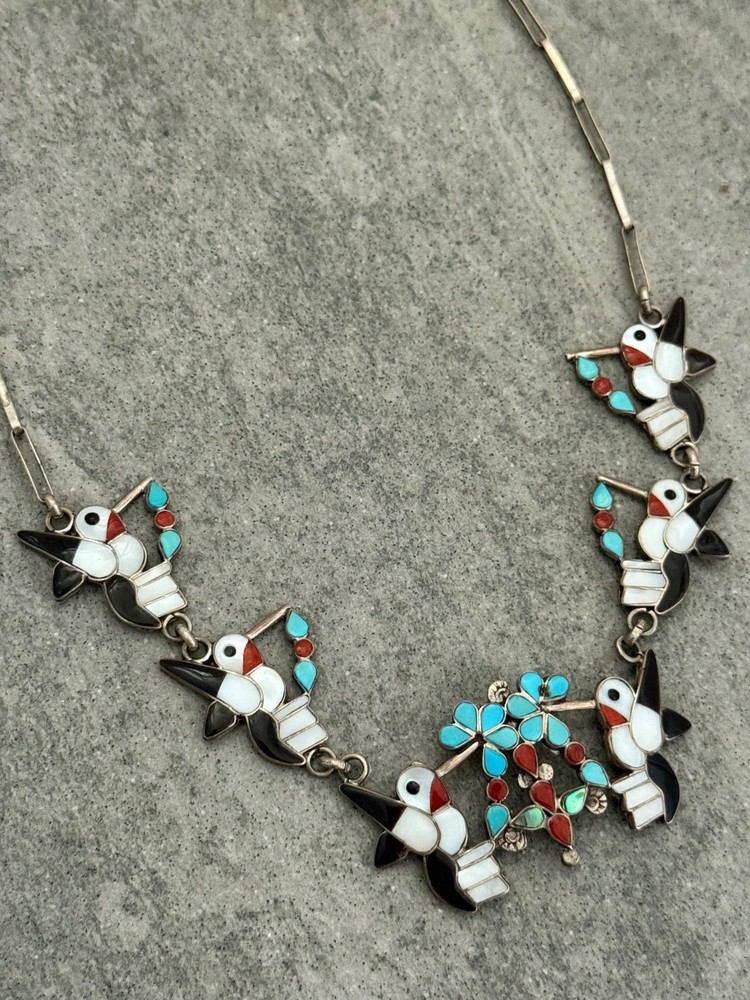 Vintage ZUNI Hummingbird Turquoise Coral MOP Onyx Inlay Sterling necklace 20 in