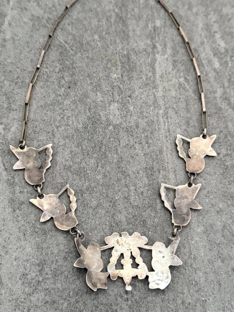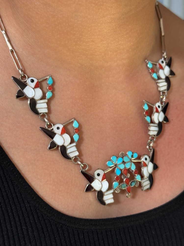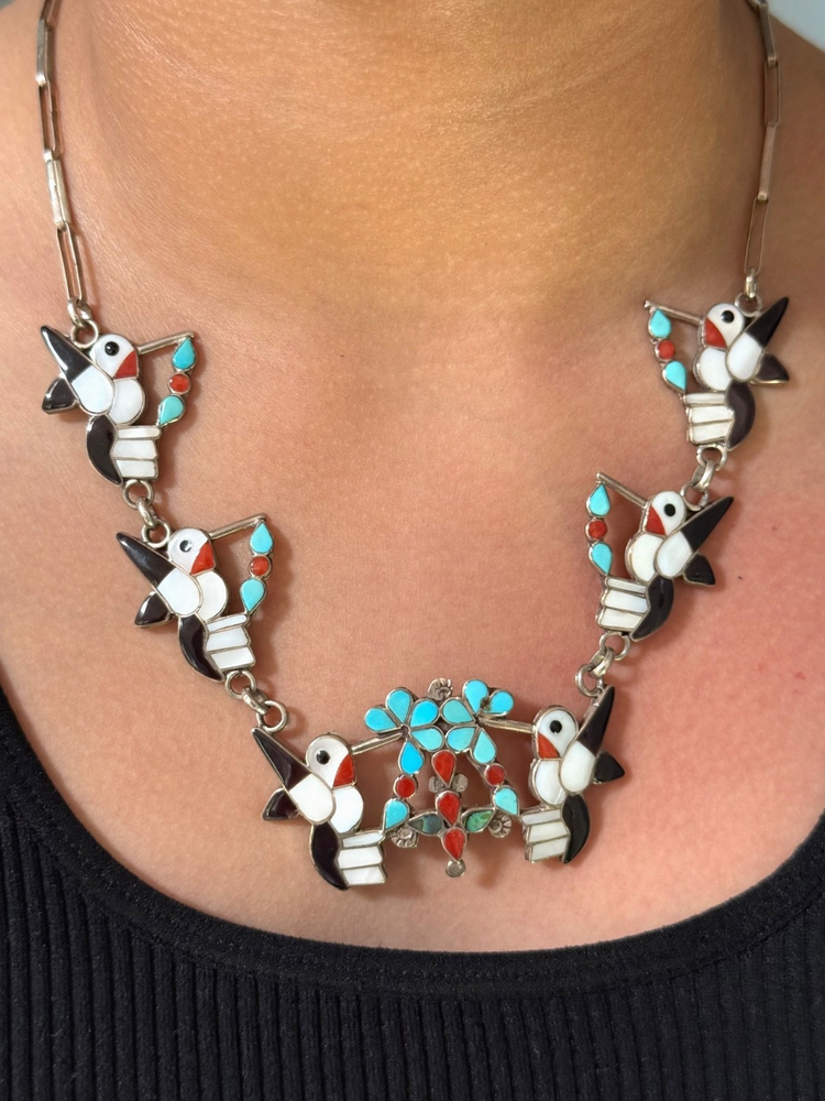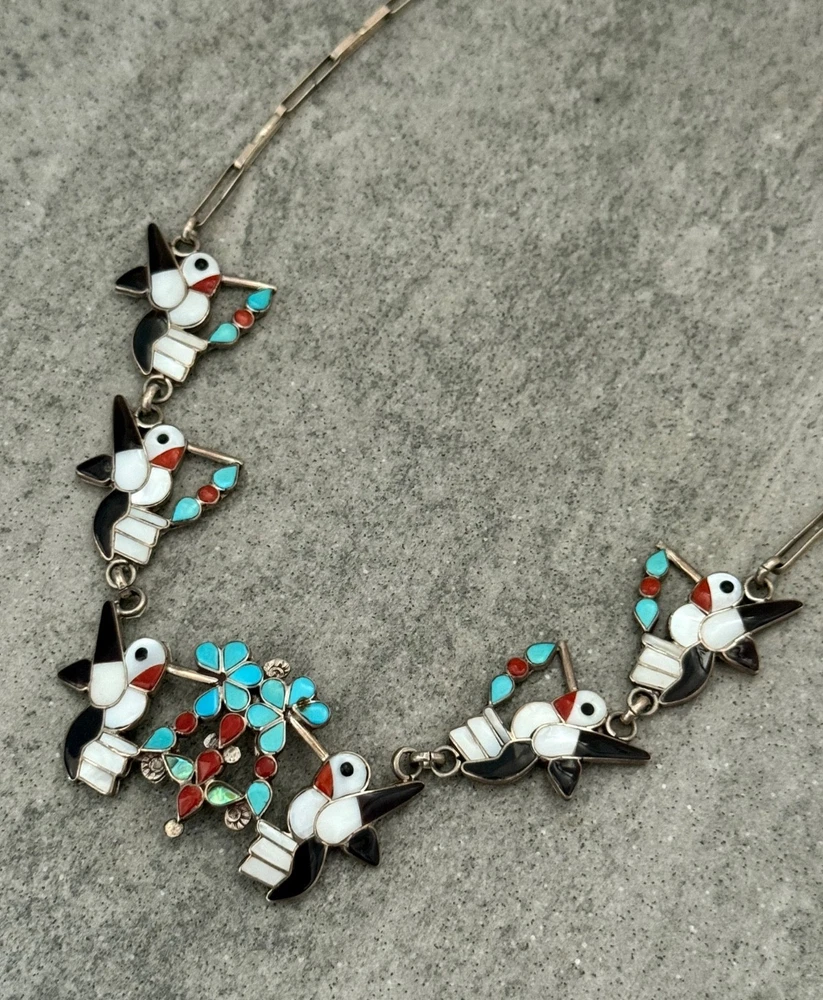 Vintage ZUNI Hummingbird Turquoise Coral MOP Onyx Inlay Sterling necklace 20 in