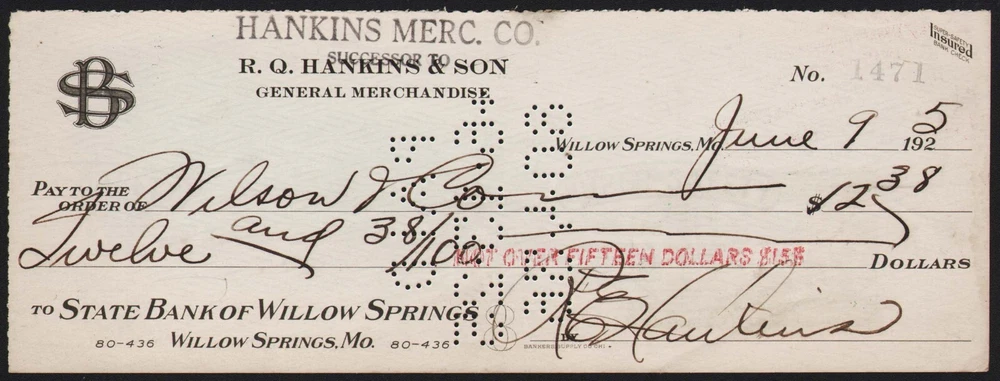 Vi ntage bank check, HANKINS MERC. CO. Successor To R. Q. Hankins & Son General Merchandise Willow Springs Mo. dated 1925, in excellent+ used condition. Few scuffs/spots/folds/pin holes/stains. The check you will receive will have a different pay to name or amount/markings/stampings but will be dated 1925 and in the same condition as described. Size is 3" x 8 1/8". Scans show the front, back will have some stampings/markings/signatures. The black border is so all the edges can be seen and is not part of the bank check itself. NOTE : All of the bank checks I have listed are guaranteed to be 100% authentic originals. They are all clean, unused and new old stock unless otherwise noted. Thank you for your purchase I appreciate it. Be sure to add me to your favorites list ! About Me I am Mistercola (Robert). I have bought, sold, and traded all types of advertising memorabilia for over 35 years now. I have been selling on ebay for over 20 years. Visit all my ebay user names Mistercola (main store), Mistercolatwo, Mistercolathree, Mistercolafour, Mistercolafive, Mistercolasix and Mistercolaseven (second store). All of the items I sell are guaranteed to be 100% authentic and original. I offer the best condition items I have available and price them as low as possible. Just because I list an item for much less than its true value does not mean that it is of inferior quality. I give a fair and honest description of an items condition using the following scale: Mint --- Near Mint --- Excellent --- Very Good --- Good --- Fair --- Poor, with some ++'s when I feel an item falls in between. I do all the acquisitions, listings, and shipping personally. If you have any questions or comments just contact me though any of my listings by clicking on "Contact Seller". I will get back to you as soon as possible. My policies are listed below so take a moment to look them over. Over the coming years I will be listing thousands of items in all my store categories. Many of these will be out of my personal collections. I will continue to sell soda bottle caps, bread wrappers, soda labels, soda pop bottles, milk caps, milk bottles, matchbook covers, magazine ads, etc. along with a great variety of ephemera in most every advertising category. I found this quote on the back of a matchcover and I think it sums up my way of doing business: “I thank you for the business and the friendliness which I believe exists between us. I appreciate your patronage and assure you that I will do all in my power to please you. If my goods and service please you, tell your friends. If not, tell me.” Thank you to all my past and future customers, I always appreciate your business. Robert Mistercola My Policies 1) M y items are kept in a smoke and pet free climate controlled environment. Due to the nature of Vintage items there may be the occasional age related odor that is beyond my control. 2) All of my auctions are No Reserve and will sell to the highest bidder. I DO NOT charge a buyer's premium or end an auction early. Shipping is done professionally "in house" so there is never a charge for an outside service. 3) Multiple wins may be combined, where feasible, to keep the shipping costs down. YOU MUST WAIT FOR MY INVOICE BEFORE YOU PAY in order to receive the lowest possible shipping price. You can add items to your Cart and then request an invoice before you pay. If you make multiple purchases and pay separately I am unable to refund any portion of the shipping costs if you pay before receiving my invoice. 4) Your item/items will be shipped within 1 business day to ensure prompt delivery. All domestic packages will come with FREE tracking. I take great care in my packing and shipping and I will do my best to insure that your package arrives quickly and safely. I am not responsible if something happens to your order once it is in the hands of the carrier. 5) International Buyers: Shipping costs for your country can be determined by using the Shipping Calculator in the listing. Rates are based on USPS First Class Package International or USPS Priority Mail International. Delivery times will vary greatly from what is posted in the listing. Import duties, taxes and charges will not be included in the item price or shipping costs and are the buyer's responsibility. International Mail does not come with a tracking number and I am not responsible if your package is lost or damaged once it is in the hands of the carrier. 6) If you are considering leaving less than positive feedback or low DSR's please contact me first so I have a chance to address your concerns. If I do not know what the problem is, I cannot fix it. 7) Returns: Due to a change in ebay policy I no longer accept returns unless the item differs from what is pictured and described. If a problem should arise there are a variety of options to work with so contact me first before you contact ebay. 8) If you have questions on how I run my listings, or the processing of your order, you can contact me anytime through ebay Messages or from any of my listings by clicking on "Contact Seller". I answer all questions as quickly as possible.