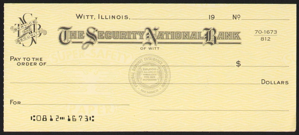 Vintage bank check THE SECURITY NATIONAL BANK Witt Illinois new old stock nrmt+