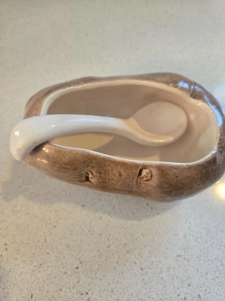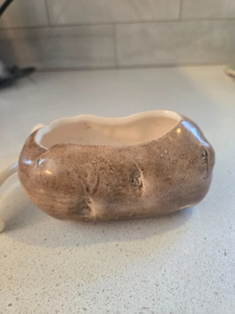 Vintage and super kitschy ceramic baked potato bowl with spoon. Use it for gravy, sour cream or any other baked potato condiment. Cute for a casual get together with a group of friends.