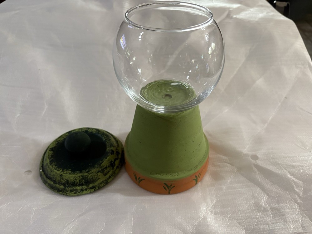 This product is a beautiful green clay pot and glass display container with a floral pattern, perfect for storing cotton balls, Q-tips, or other small items. The clay pot design adds a unique touch to the piece, while the lid ensures everything stays organized. With dimensions of 9.5" in height and 4.5" in width, this candy dish or display is both functional and decorative, making it a lovely addition to any collection or decor setting.