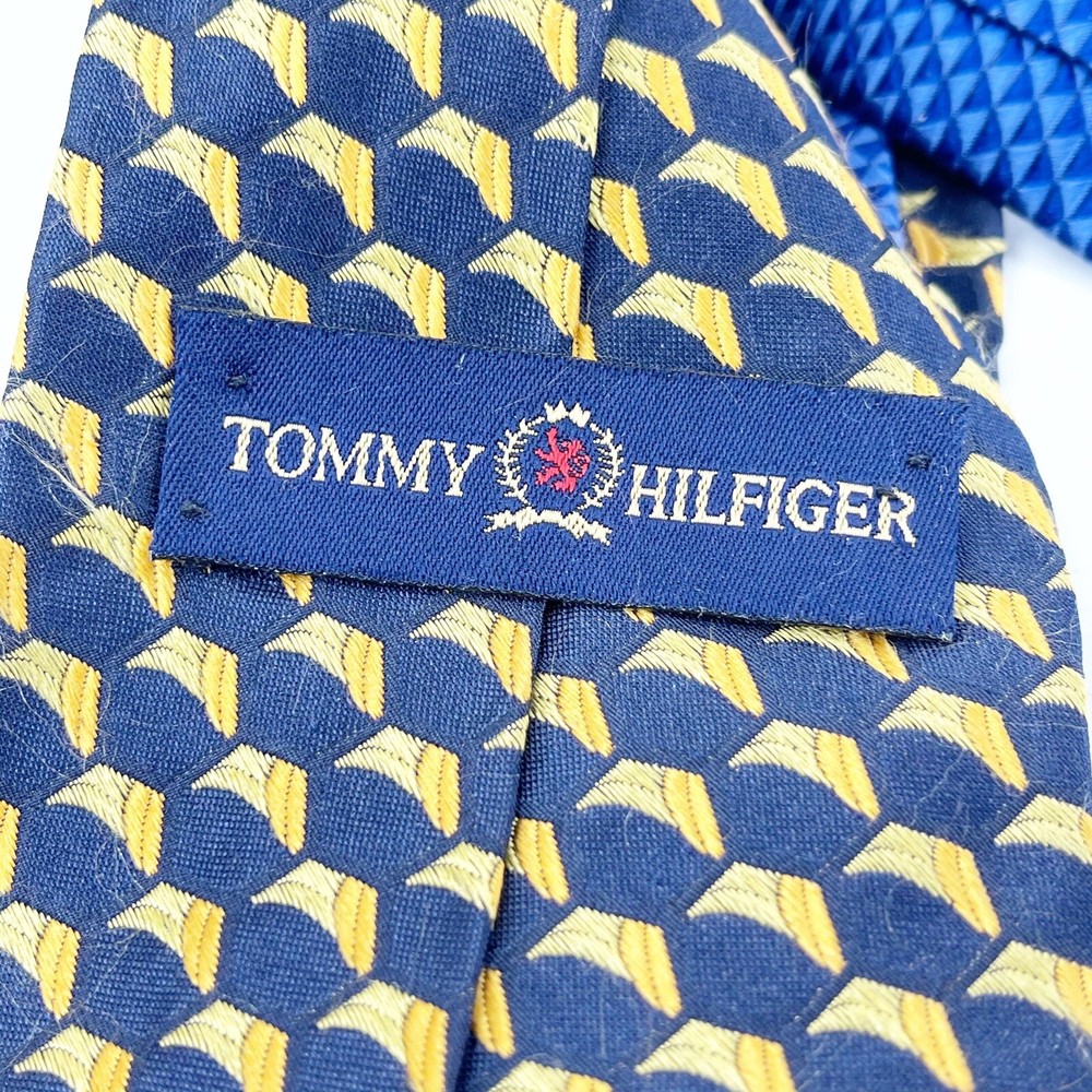Vintage TOMMY HILFIGER Men’s Geometric Print Imported Silk Tie Necktie Blue Gold 61" long and 4" wide. 100% Silk