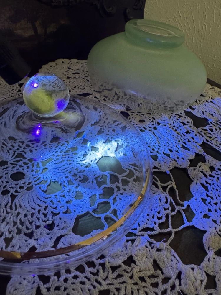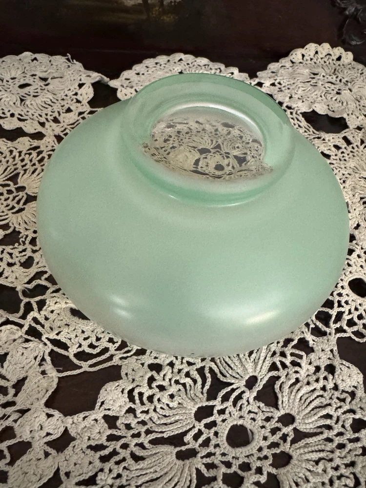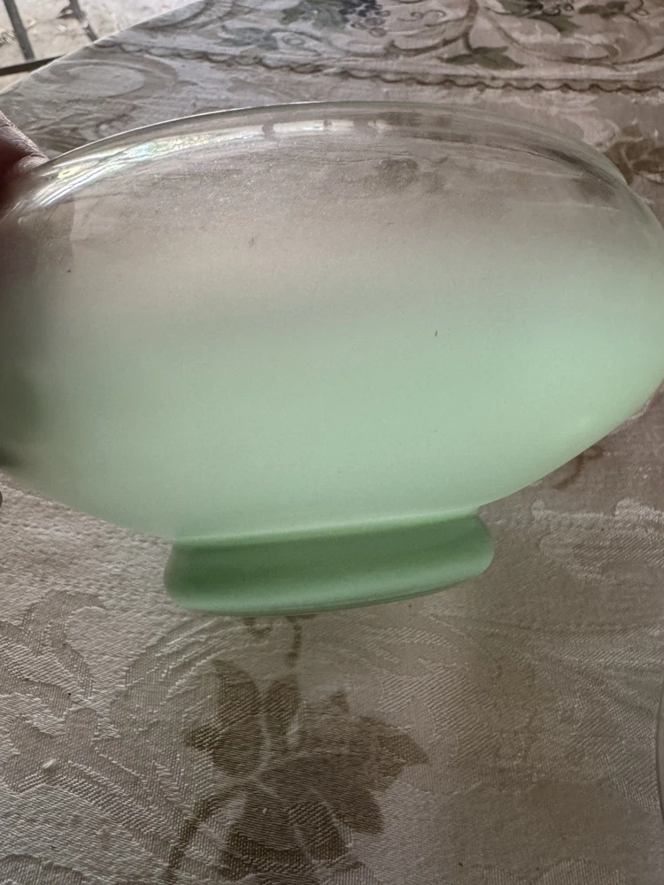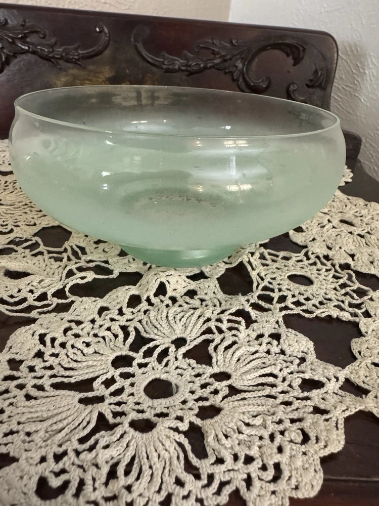 Unique, Beautiful Vintage pale green Satan glass bowl that fades to clear towards a gold rimmed glass ball top (glass ball shows UV color change); the glass pontil mark is smooth on bottom indicating fine workmanship but the glass is otherwise not marked. Ive not seen another just like this - a special piece-approximately 6” high by 6” deep which was probably made in the early 1900’s - 1930’s based on Uranium presence. In great condition with no scratches or chips and the gold rim is intact.