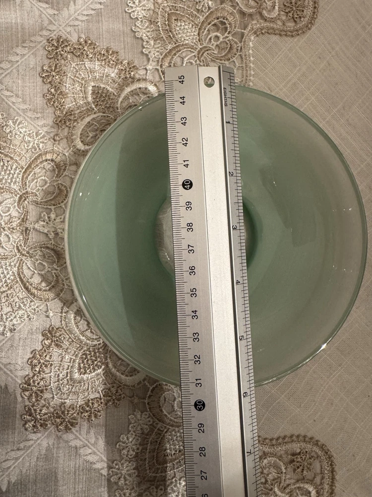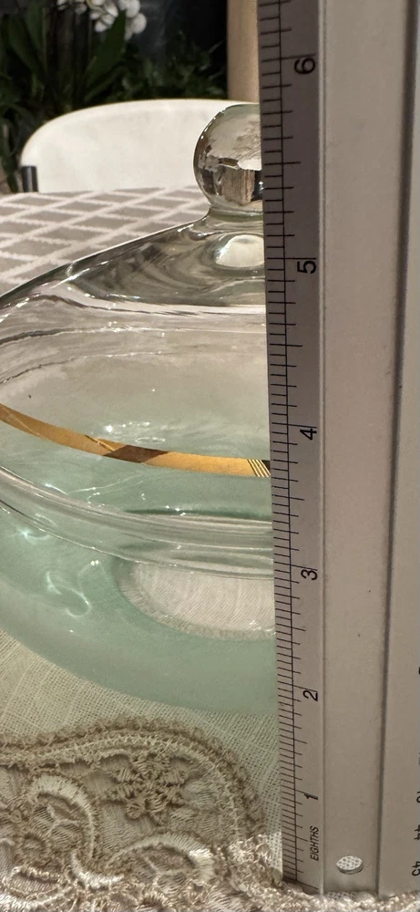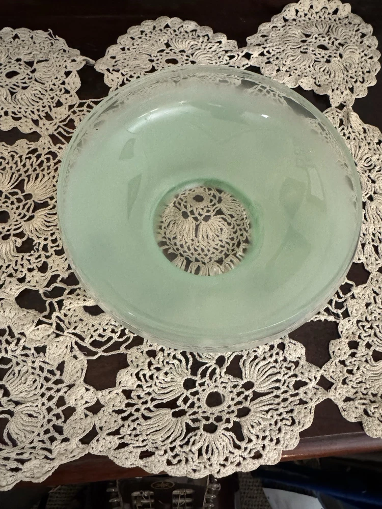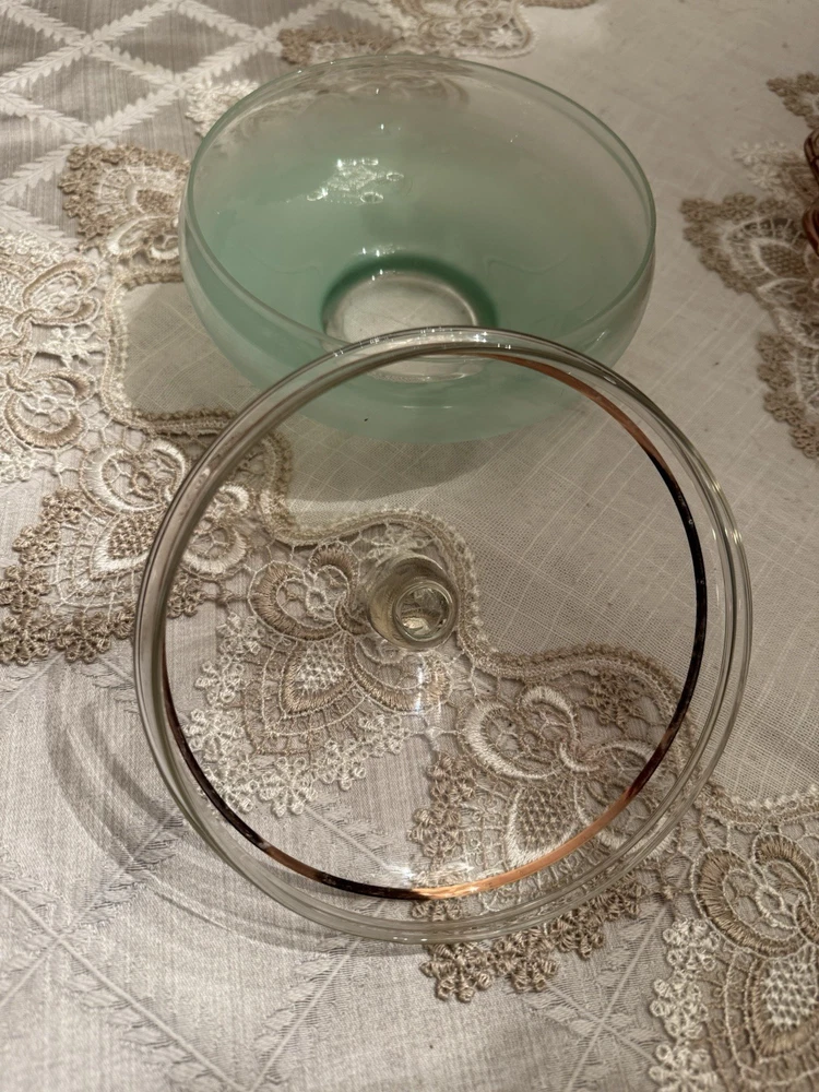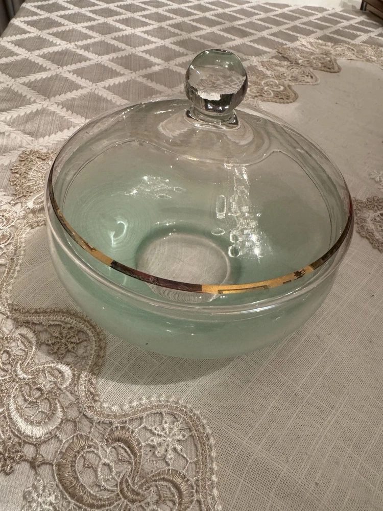 Unique, Beautiful Vintage pale green Satan glass bowl that fades to clear towards a gold rimmed glass ball top (glass ball shows UV color change); the glass pontil mark is smooth on bottom indicating fine workmanship but the glass is otherwise not marked. Ive not seen another just like this - a special piece-approximately 6” high by 6” deep which was probably made in the early 1900’s - 1930’s based on Uranium presence. In great condition with no scratches or chips and the gold rim is intact.