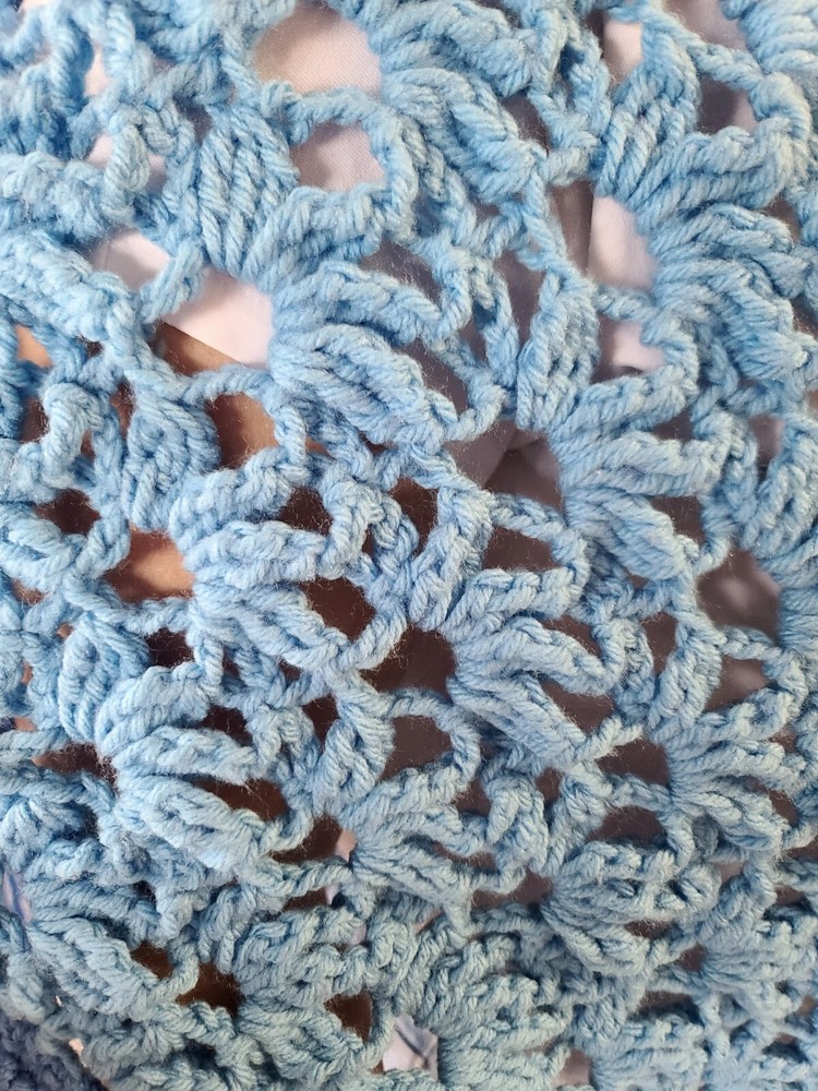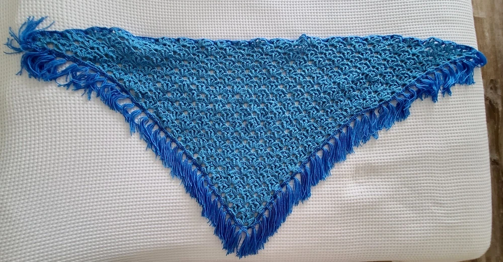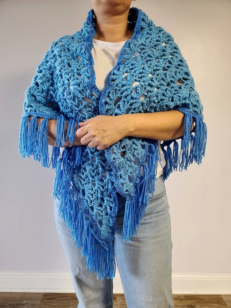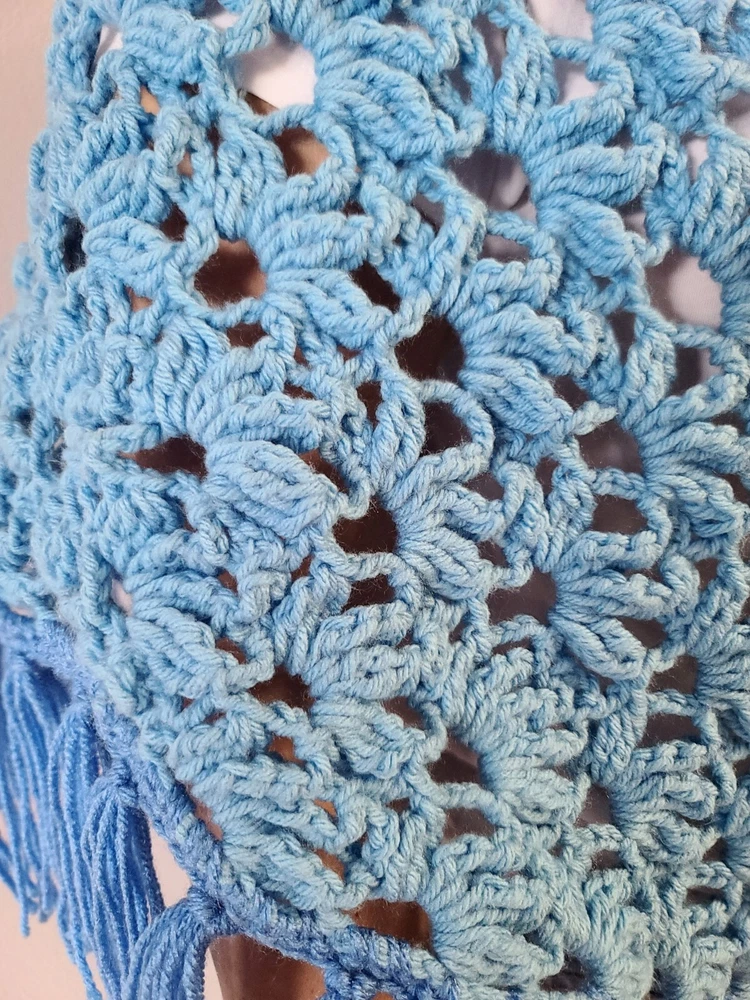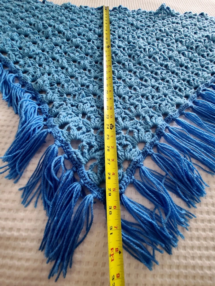 HANDMADE!! NEW!! Vintage blue handmade boho poncho with fringe, triangle shawl. Large blue shawl made of medium-weight acrylic yarn. The shawl is crocheted. Machine washable, but hand washing is recommended for yarn items. If you insist on machine washing, at least place the item in a laundry bag to avoid excessive stretching and snagging.