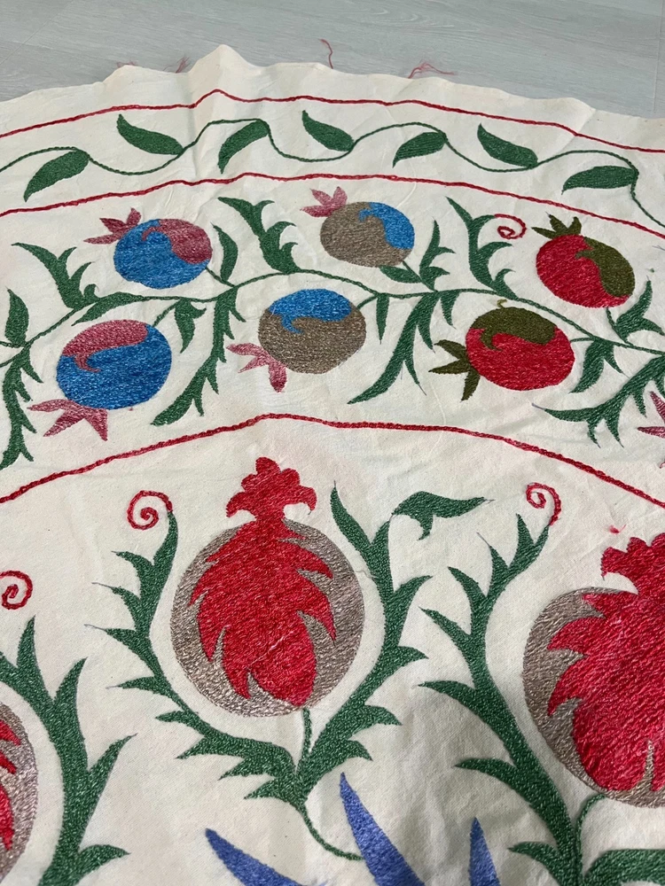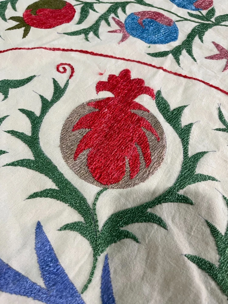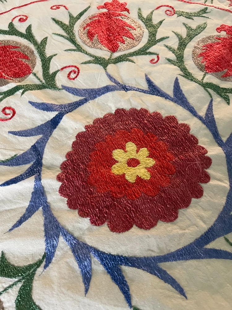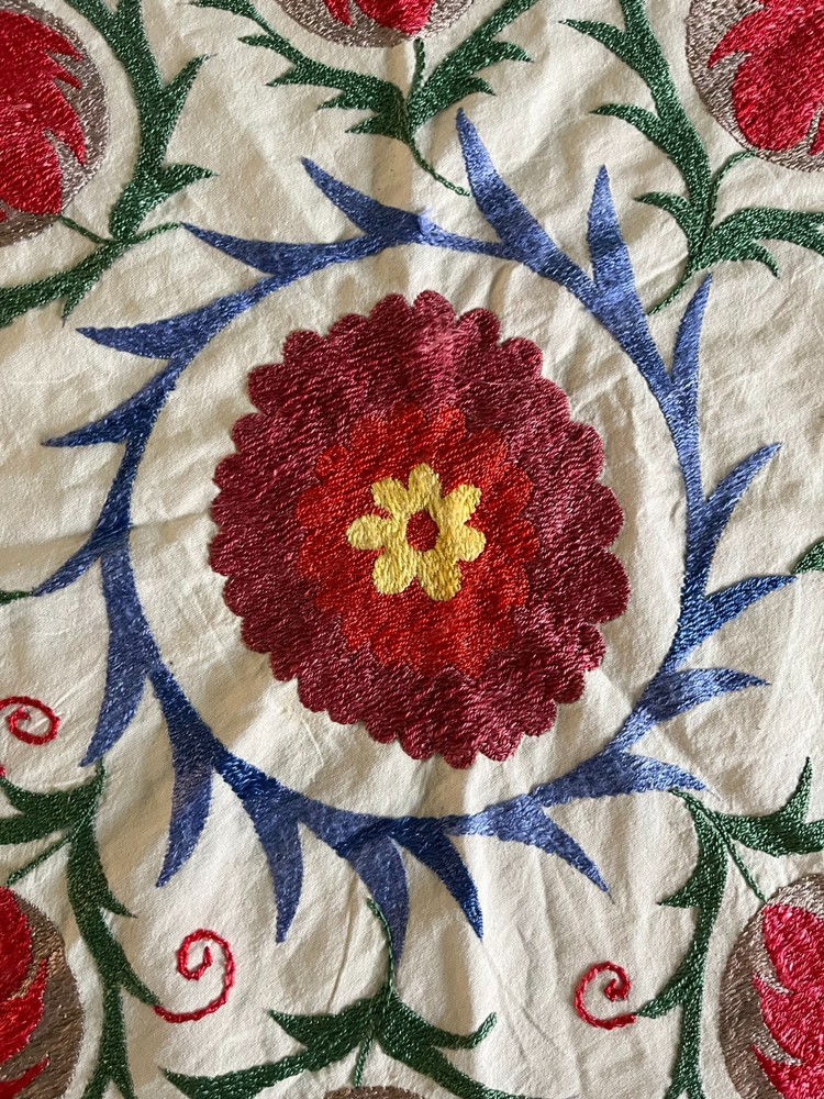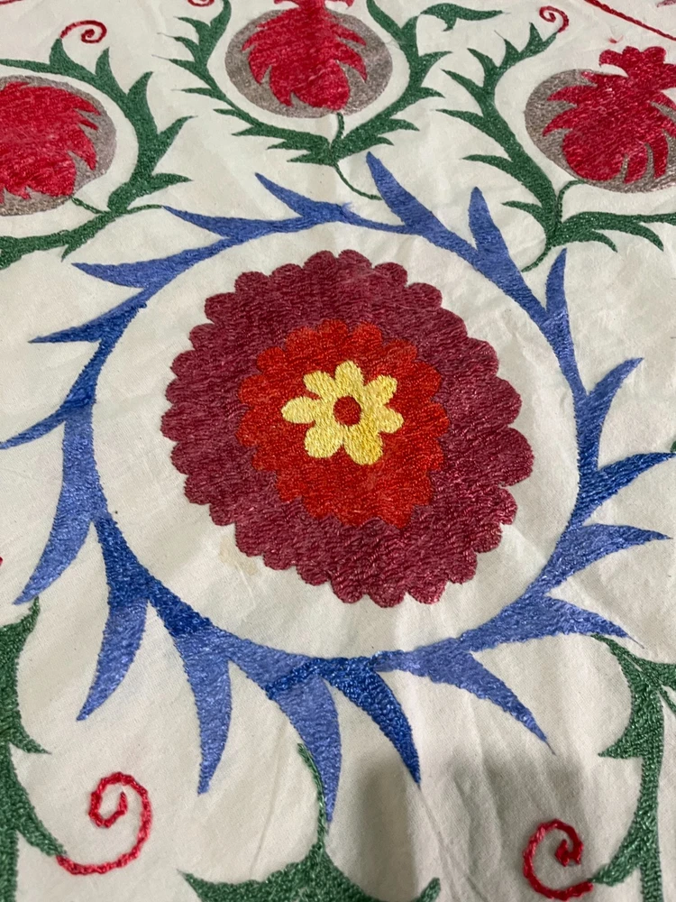 Created with Eselt - Mobile Optimized Templates for eBay Sellers Welcome to Samarkand Send us a message Created with Eselt - Mobile Optimized Templates for eBay Sellers Our Store Seller Profile Feedback About us Contact Created with Eselt - Mobile Optimized Templates for eBay Sellers Handmade Uzbek Suzani Wall Hanging Red Blue Floral Embroidery Art Boho Decor Handmade Uzbek Suzani Wall Hanging – Red Blue Floral Embroidery Art | Boho Home Decor Hand Embroidered Uzbek Suzani – “Pomegranate Garden” by Siyab Bazar ROUND 4.92 ft (150 cm) Boho Coverlet | Wall Art | Tapestry | Textile Decor A suzani is a traditional Central Asian hand-embroidered panel, and creating one from scratch is a lengthy, completely manual process. Below is the classic technique, as our artisans prepare it. Preparing the base (fabric) Traditionally used materials: • cotton • linen • silk (in the old days, homespun cloth) What to do: • the fabric is washed and dried to allow it to shrink beforehand • ironed • sometimes several pieces are sewn together into one large piece (suzani are rarely made from a single piece) Applying the pattern This is one of the most important steps. Methods: • Draw the pattern by hand (chalk, charcoal, pencil) • Transfer from a stencil • In the old days, the pattern was often stored "in the mind" of the craftswoman The patterns are not random: • Sun — life, energy • Flowers — beauty, fertility • Branches — procreation Each region (Bukhara, Samarkand, Shakhrisabz, Tashkent) has its own style. Thread selection Traditionally: • Silk threads (the most valuable) • Cotton • Sometimes wool Colors are selected by hand; in the past, they were dyed with natural dyes: • Garnet • Indigo • Onion peel • Madder root Hand embroidery The longest stage. Basic techniques: • Basma - a thick satin stitch (the most popular) • Yurma - a chain stitch • Ilma - a filling stitch How to embroider: • The fabric is stretched over a frame • The embroidery process takes months, sometimes 6-12 months • Often several women work on a single suzani In the old days, suzani were prepared as part of a bride's dowry. Assembly and finishing After completing the embroidery: • check for symmetry • carefully secure the threads • hand wash • dry in the shade • smooth without applying too much pressure Sometimes add: • fringe • lining • decorative edging The finished suzani completely handmade unique pattern (no other like it exists) can be used as: • wall hanging • bedspread • wedding or family dowry 💡 Interesting fact A true suzani is never perfectly even – this is the hallmark of handcrafted work and the “living energy” of the piece. Immerse yourself in the timeless beauty of Samarkand craftsmanship with this hand-embroidered Uzbek Suzani, part of Siyab Bazar’s signature “Pomegranate Garden” collection — where every stitch blooms with life, color, and meaning. This exquisite Suzani showcases vibrant red pomegranate patterns framed by bold floral motifs — each symbolizing love, abundance, and prosperity. Hand-embroidered by skilled women artisans in Samarkand, it carries the warmth of their heritage and the rhythm of the legendary Siyab Bazaar, where tradition and artistry meet. Features: Place of origin: Samarkand, Uzbekistan Material 100% natural made of Suzani cotton and silk (ikat and adras) Size: 4.92 ft approx. (150 cm) Traditional Central Asian Suzani pomegranate motif designs in silk thread, embroidered by hand. Dry clean only! Do not bleach! 100% Hand-embroidered in Samarkand, Uzbekistan Silk and cotton threads on a natural cotton base Elegant red pomegranate & floral motifs – traditional symbols of fertility and joy Ideal as wall art, bed cover, or boho home accent Unique Siyab Bazar design – no replicas, each piece is one of a kind, no two are ever the same Soft, detailed, and filled with rich cultural energy Lightweight, soft, and richly textured ✨ A Piece with a Story: This Suzani tells a tale of sunlight and silk, of red pomegranates bursting with life and fortune. The intricate needlework embodies centuries of Central Asian tradition, while its bold palette brings warmth and elegance to any interior — from bohemian lofts to refined modern homes. Hang it as a tapestry, drape it as a coverlet, or display it as a textile artwork — wherever it rests, it will radiate the soul of Samarkand and the unmistakable spirit of Siyab Bazar. Approximate Size: 4.92 ft (150 cm) Material: Cotton base with silk/cotton embroidery Origin: Handcrafted in Samarkand, Uzbekistan Condition: New – handmade; natural variations emphasize its authenticity Siyab Bazar Heritage Collection: At Siyab Bazar, we celebrate the living art of Uzbekistan. Every Suzani we curate is not just decor — it’s a story woven by hand, a bridge between the past and the present. Let the red pomegranates of Samarkand bloom in your home — symbols of abundance, unity, and timeless beauty. 🕊 SiyabBazar Promise: At SiyabBazar, each Suzani is chosen for its spirit, artistry, and heritage. We partner directly with Uzbek craftswomen to preserve their ancestral embroidery traditions and share their beauty with the world. Bring home a piece of the Samarkand sky — a handmade treasure woven with peace, history, and heart. God bless and warm regards, - Siyab Bazar Team Thank you for viewing our listing! Created with Eselt - Mobile Optimized Templates for eBay Sellers Payment IMMEDIATE PAYMENT REQUIRED. We accept all major payment methods such as PaypPal, Payoneer, Google Pay, VISA, Mastercard, AmEx and Discovery. Shipping All items are shipped from Tashkent, Uzbekistan. EXPEDITED INTERNATIONAL SHIPPING via Courier (FedEx or DHL) Delivery time: 10 business days Products for which you requested PERSONALIZATION we need 5 additional days for production. Delivery times vary depending on local/ international postal services and weather conditions . Processing time: 