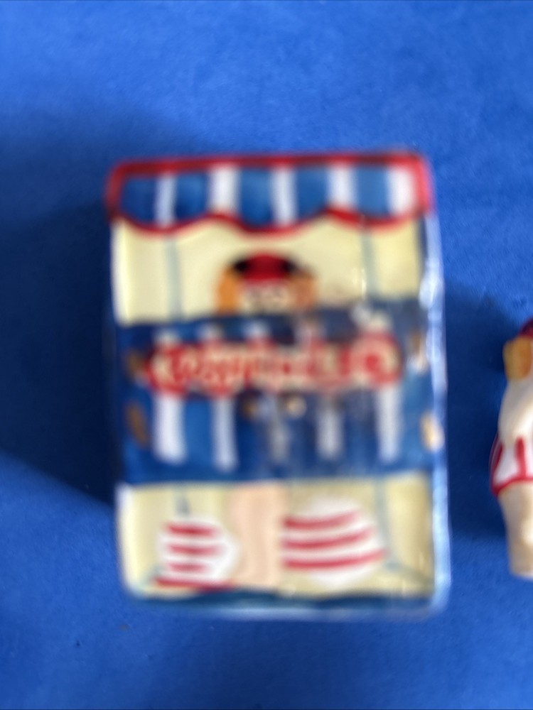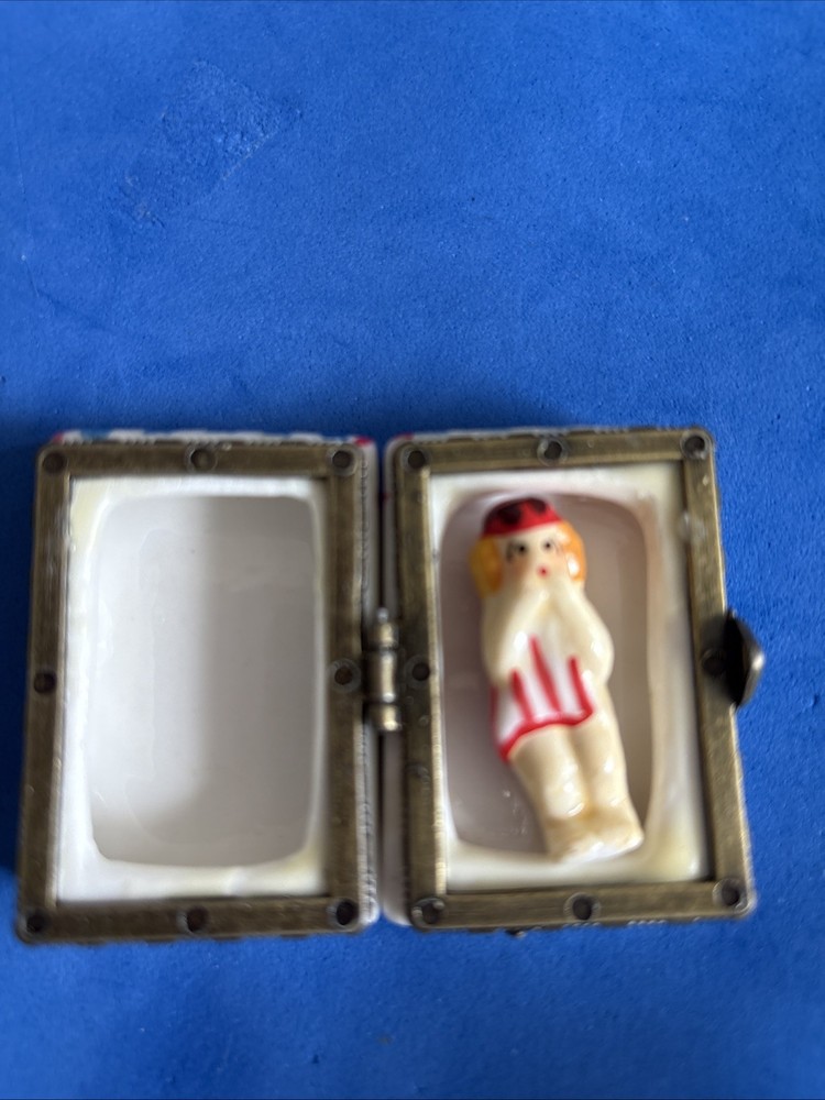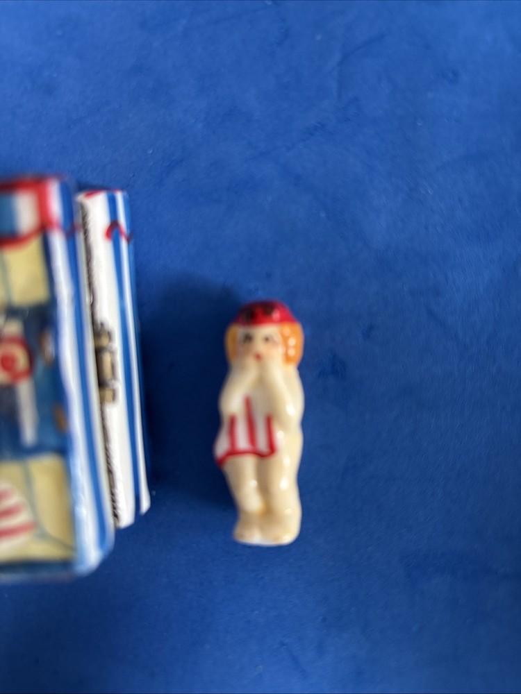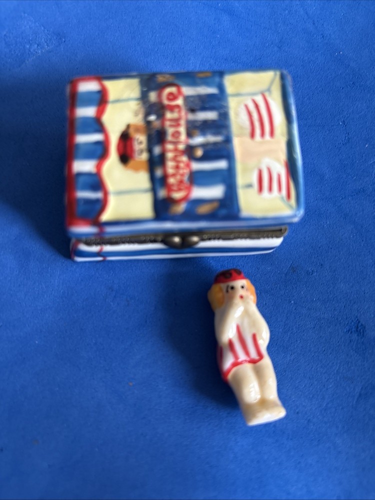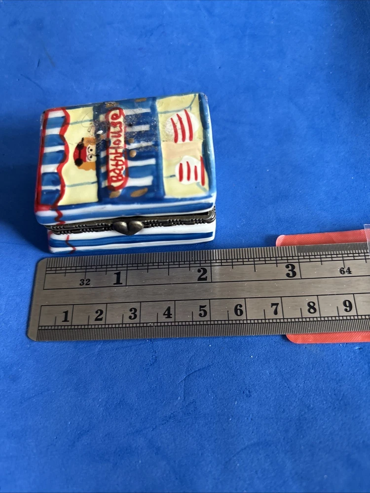 Vintage hinged enamel jewelry box shaped like a beach house with doll charm
