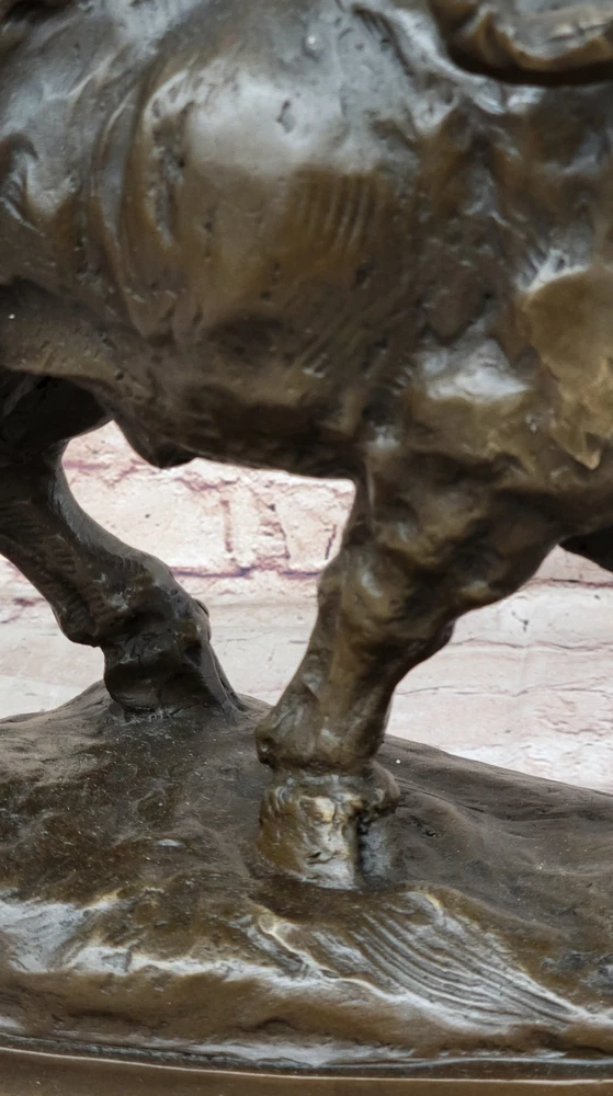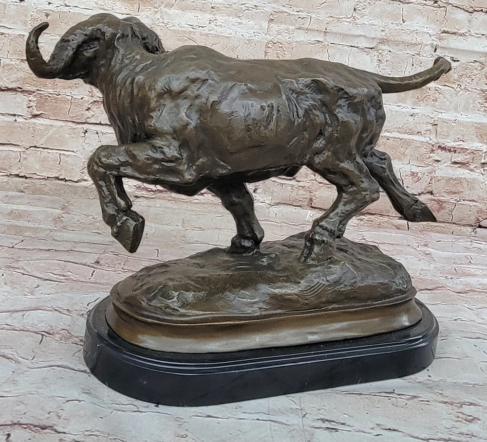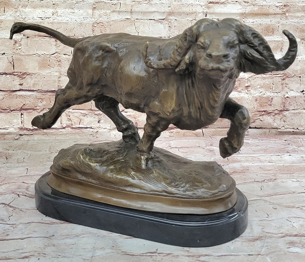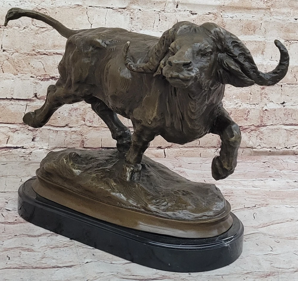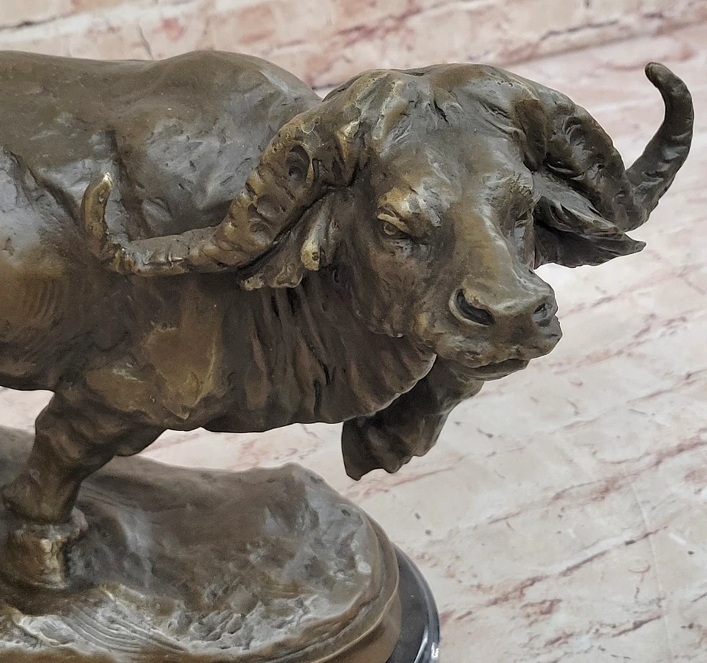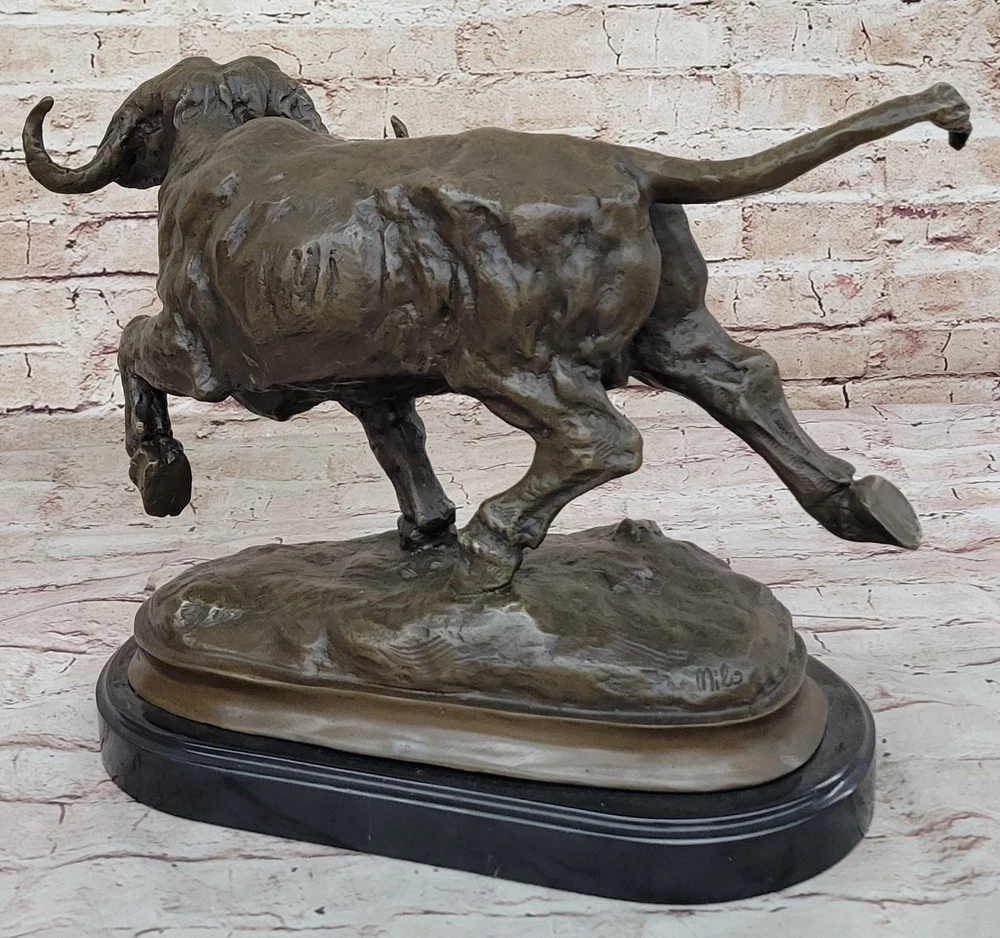 Condition : This sculpture is in perfect condition. Bronze Dimensions with Marble Base:11" X 17" Marble Dimensions: Diameter 13.5" Height without base:10" Weight:27 LBS Inventory:2497K08442 Capturing the raw power and unpredictable temperament of a charging bison, this sculpture vividly depicts the intensity of the moment. Bison, typically known for their peaceful and lazy demeanor, can transform into formidable forces, capable of charging at speeds up to thirty-five miles per hour. The sculpture portrays the bison in mid-charge, showcasing its massive skull and distinctive horns, emphasizing the potential danger inherent in its sudden and unpredictable behavior. The intricate detailing, including the large curled horns, brings the sculpture to life, conveying the strength and ferocity of this iconic North American mammal. The bison's natural weapons, from its horns to its massive head, are skillfully portrayed in this fully detailed sculpture. The artist highlights the potential for a bison to use its head as a battering ram, harnessing the momentum of its substantial weight at high speeds. The hind legs, capable of delivering devastating force, add to the sculpture's dynamic representation of the bison's power. The brown patina, enhanced with subtle gold touches, adds depth and realism to the artwork, capturing the essence of this majestic creature in a moment of intense action. Crafted with precision and artistry, this sculpture is a product of the "Lost Wax Method," a technique that allows for intricate details and lifelike representations. Mounted on a round black marble base, the sculpture gains a sense of grounding, emphasizing its significance as a work of art. Signed by the artist Milo, this piece not only pays homage to the strength and vitality of the bison but also serves as a testament to the artist's skill in capturing the essence of wildlife in bronze. RUNNING BISON CHARGES BRONZE MARBLE SCULPTURE MILO HOT CAST MARBLE BASE FIGURINE Video will open in a new window Using the eBay App? Paste link into a browser window: [isdntekvideo]