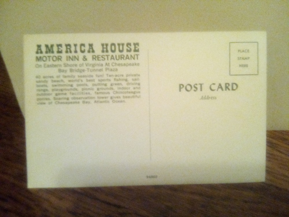 The product is a vintage postcard featuring the America House Motor Inn in Kiptopeak, Virginia. This single unit postcard is an original print from the 1939-Now era, depicting an Inn subject in a standard size of 5.5 x 3.5 inches. Made of paper and printed in lithograph, this postcard showcases a piece of North American history from the United States, specifically in the region of Virginia. Perfect for collectors of topographical postcards, this piece offers a nostalgic glimpse into a bygone era of travel and leisure.