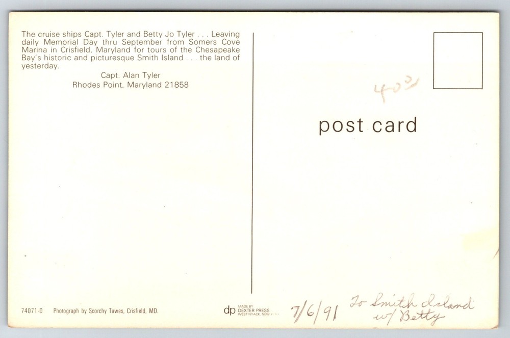 This postcard is a fantastic keepsake! The vibrant colors and crisp details perfectly capture the charm of Somers Cove Marina. It’s a great way to remember a trip or share the beauty of Crisfield with friends. The quality is excellent, and it arrived quickly—definitely worth adding to any collection!