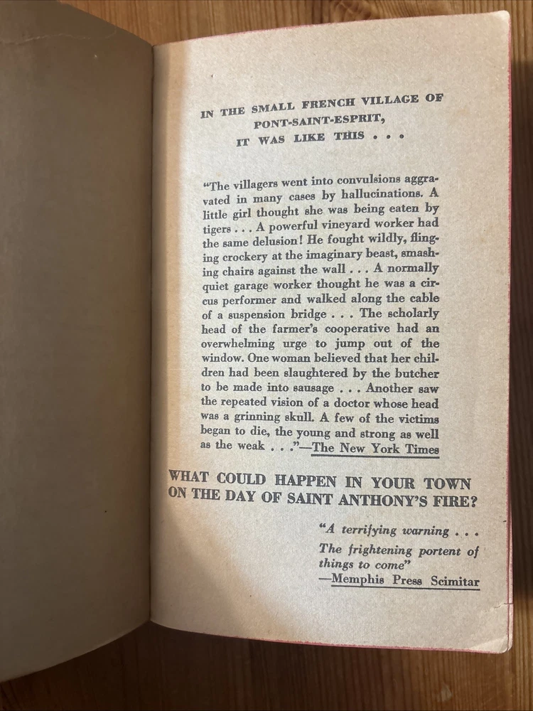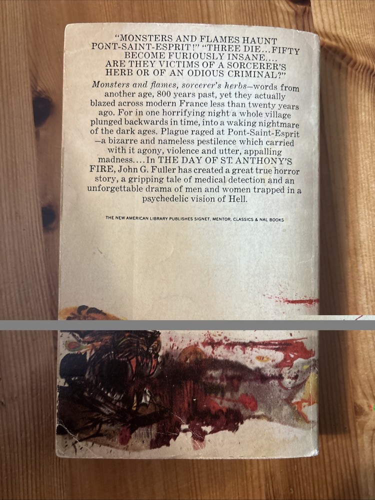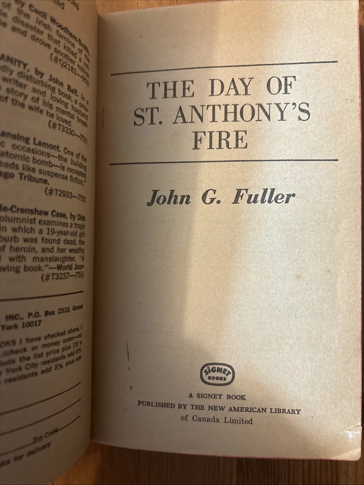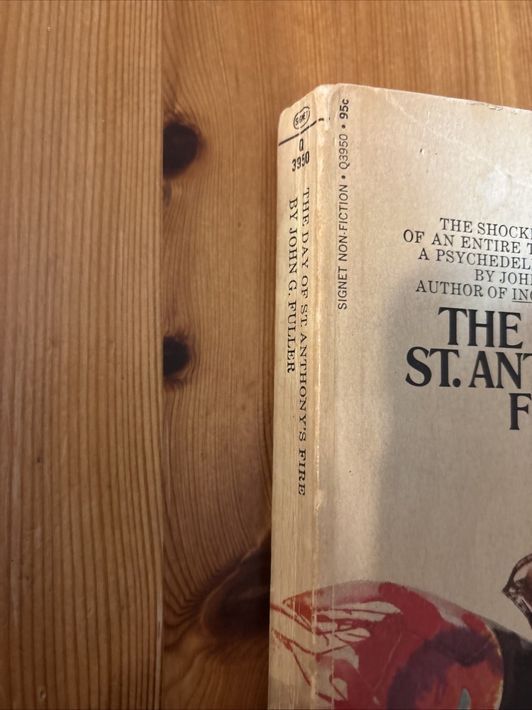 The Vintage 1969 Signet paperback "The Day of St. Anthony's Fire" by John G. Fuller is a rare and collectible book that delves into the psychedelic history of North America. Published by Signet Books in 1968, this vintage paperback offers readers a unique glimpse into the counterculture movement of the 1960s. Written in English by the renowned author John Fuller, this original piece is a must-have for anyone interested in the history of psychedelics and vintage paperbacks. A non-fiction book detailing the true story of a mass poisoning event in Pont-Saint-Esprit, France, in 1951, where hundreds of villagers suffered hallucinations, convulsions, and psychotic episodes, likely caused by ergot-contaminated rye flour, leading to widespread madness and tragedy.