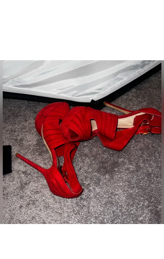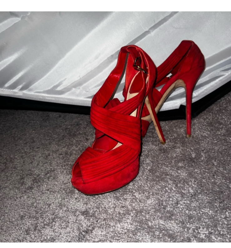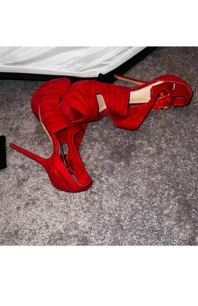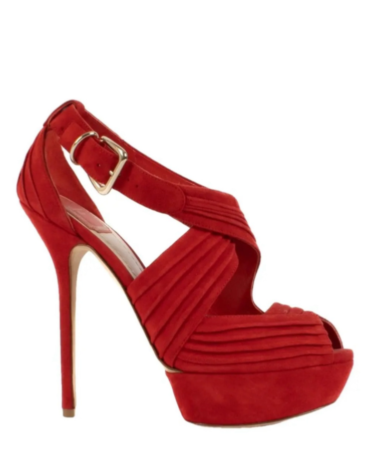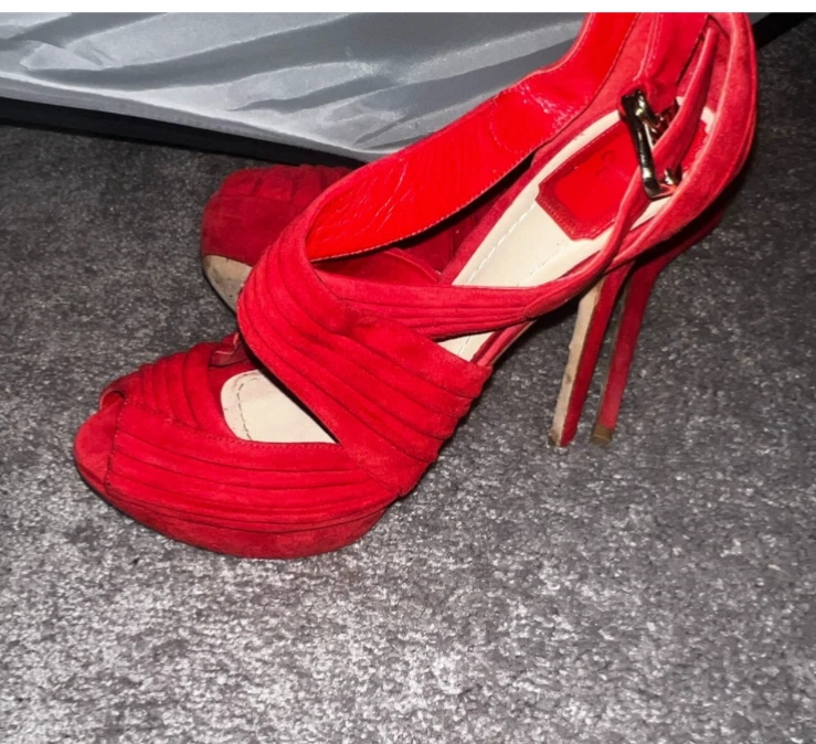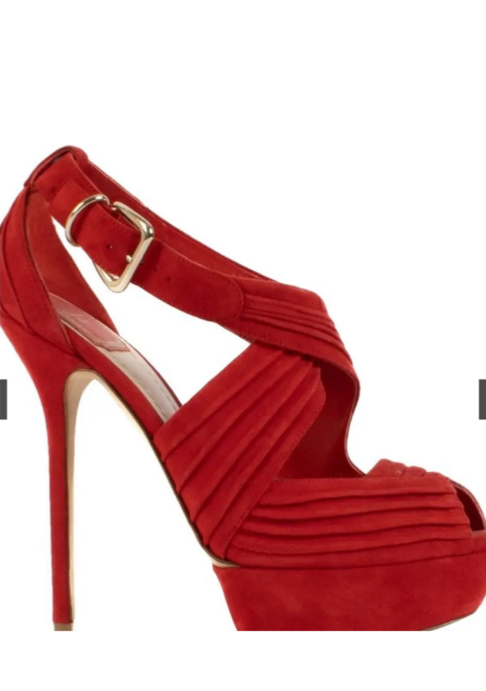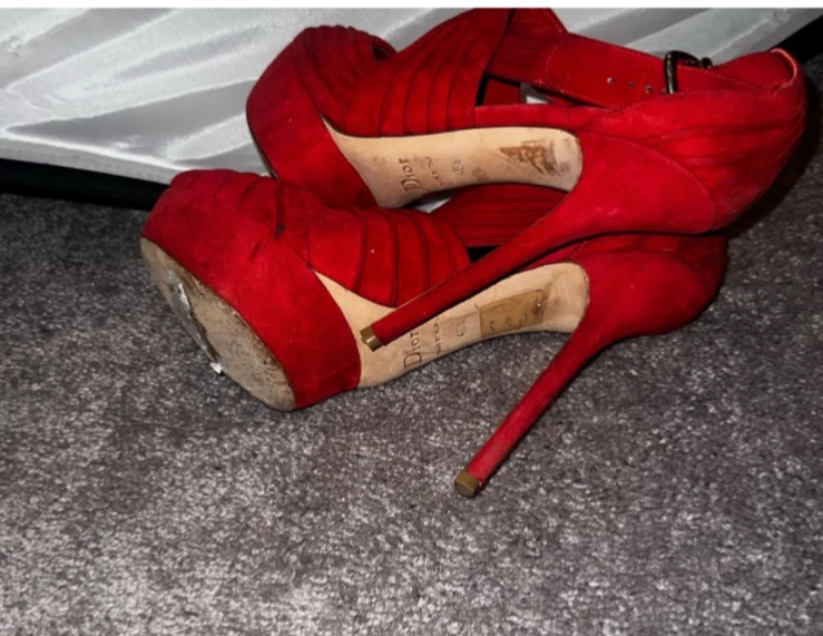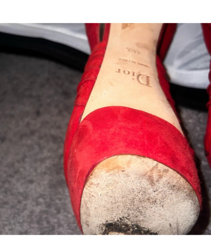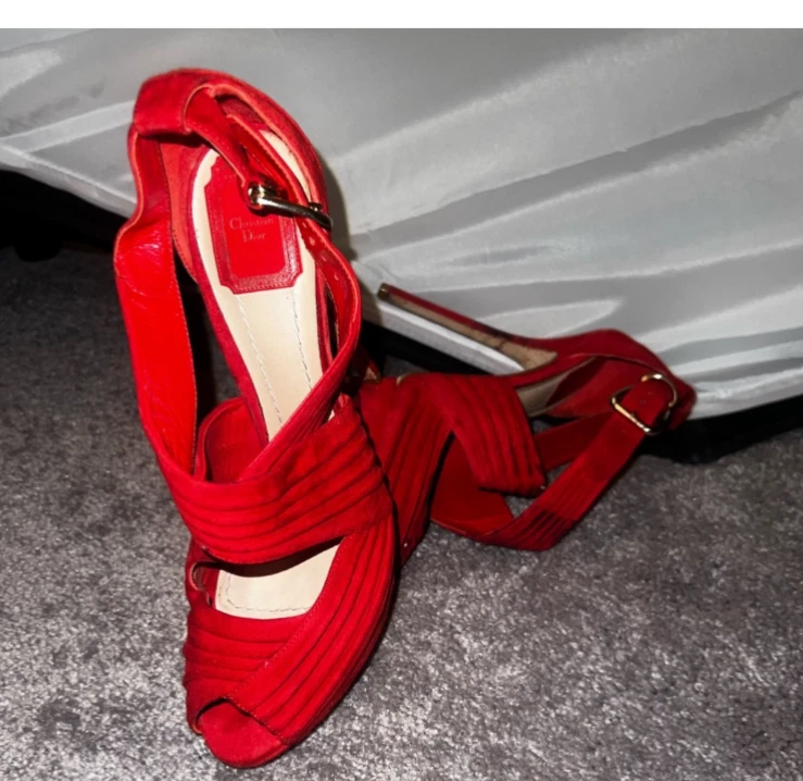 Red suede Dior heels in size 10 feature a platform style with a peep toe design. These elegant women's shoes are perfect for adding a pop of color to your outfit while also providing a stylish and comfortable elevated heel option.