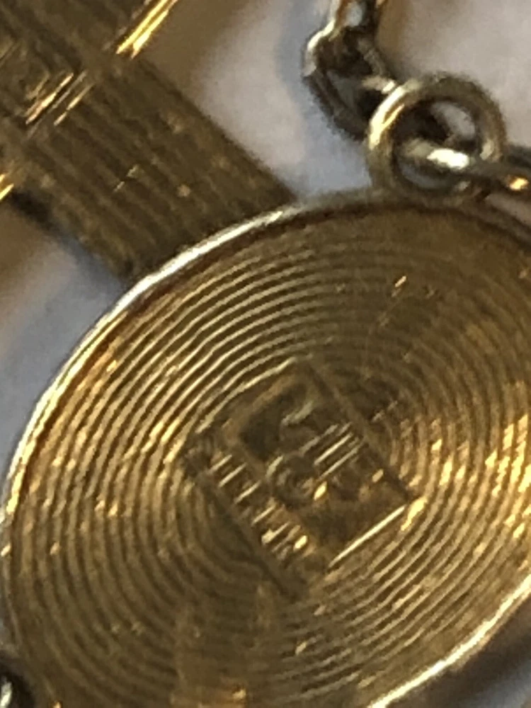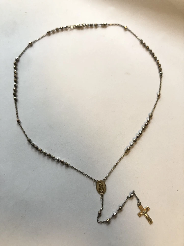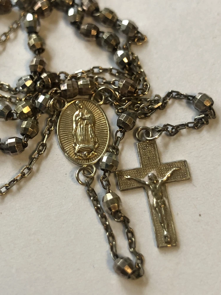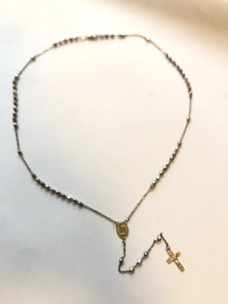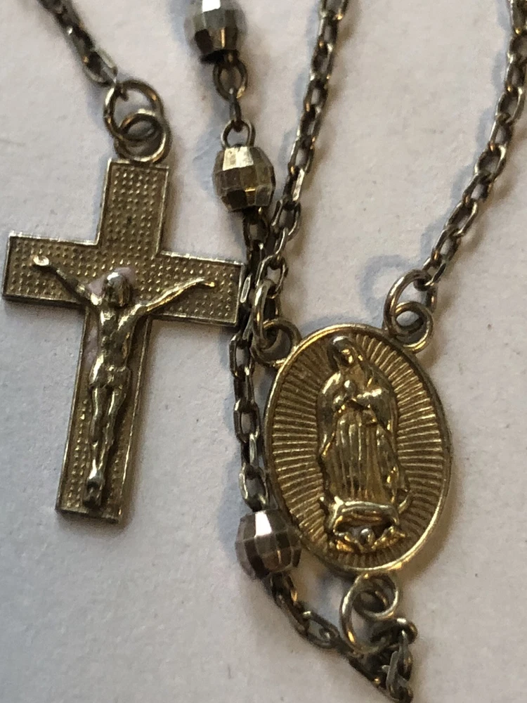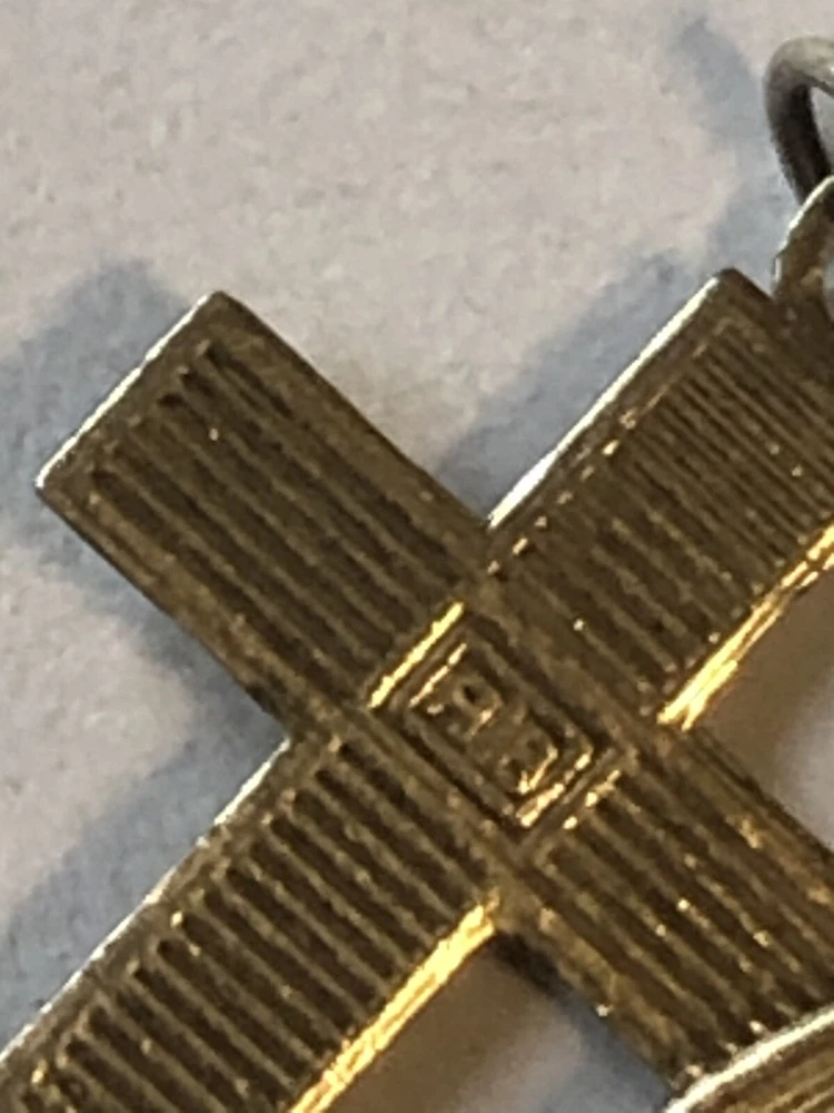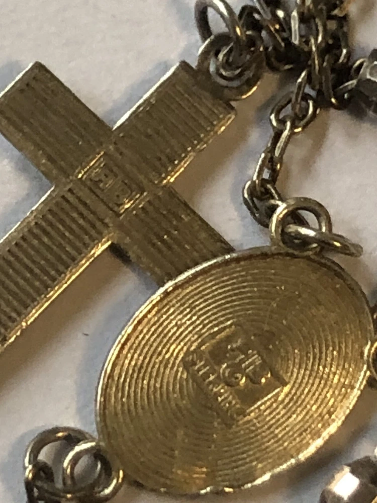 Awesome quality vintage piece very petite light weight designed , this is a designer signed piece purchased as Macys department store decades ago 18 “ necklace with a 4” Crucifix and medallion pendant drop .. has a disco ball look to it , all sterling silver with areas of the Sterling that were played with 14th gold