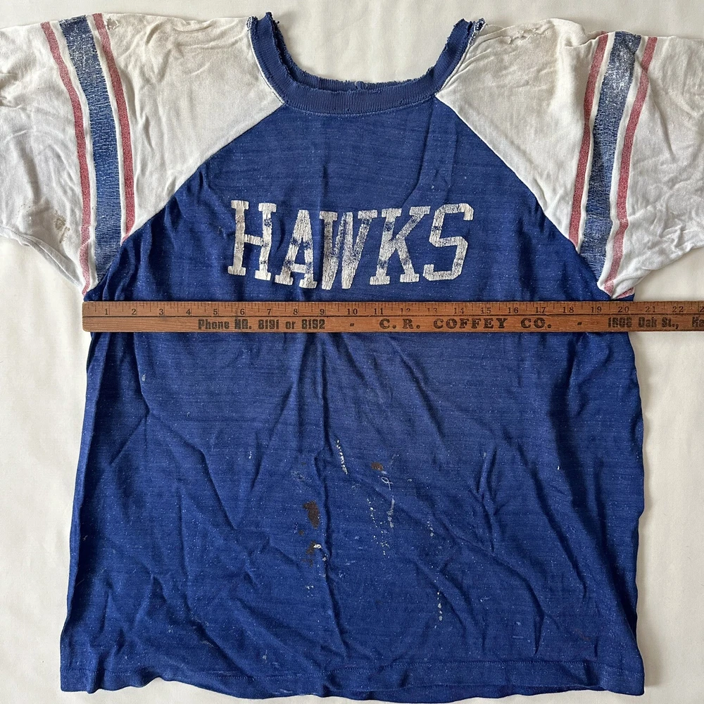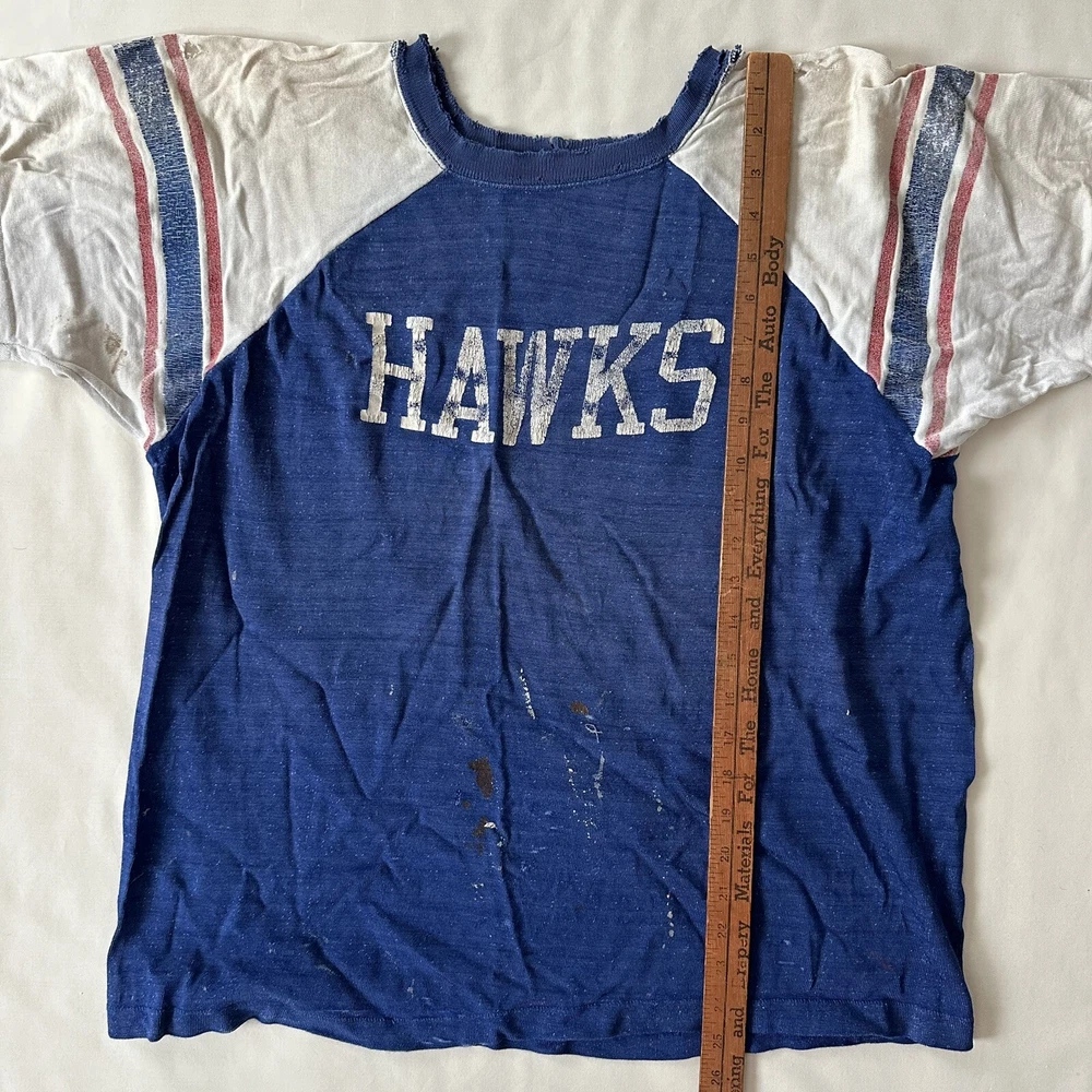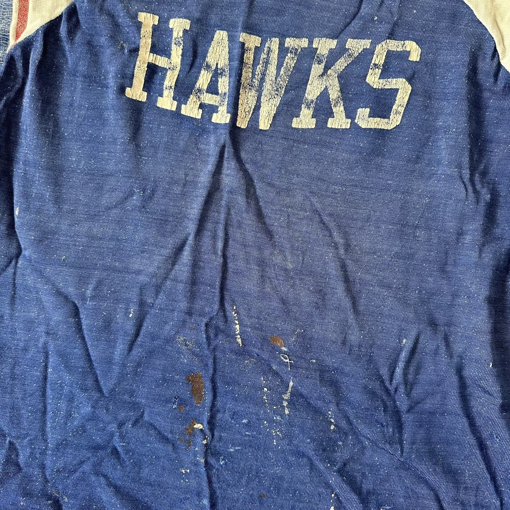 This vintage Hawks blue jersey is perfectly worn and thrashed making it such a cool piece. This is an original piece from the 1970s and perfect for anyone looking to add a touch of retro style and vintage cred to their wardrobe. The short-sleeved jersey features a regular fit and is probably a men's size L—see measurements. The vintage look of this jersey is perfect for those who want to stand out from the crowd. With its unique design and originality, this piece is sure to turn heads. Whether you're looking to add to your collection or simply want to make a statement, this thrashed jersey is the perfect choice. Originally a Rockhurst Hawks jersey from Kansas City, Missouri, this works beyond its original purpose