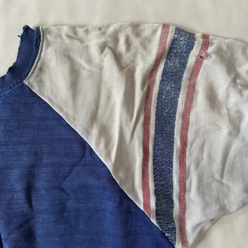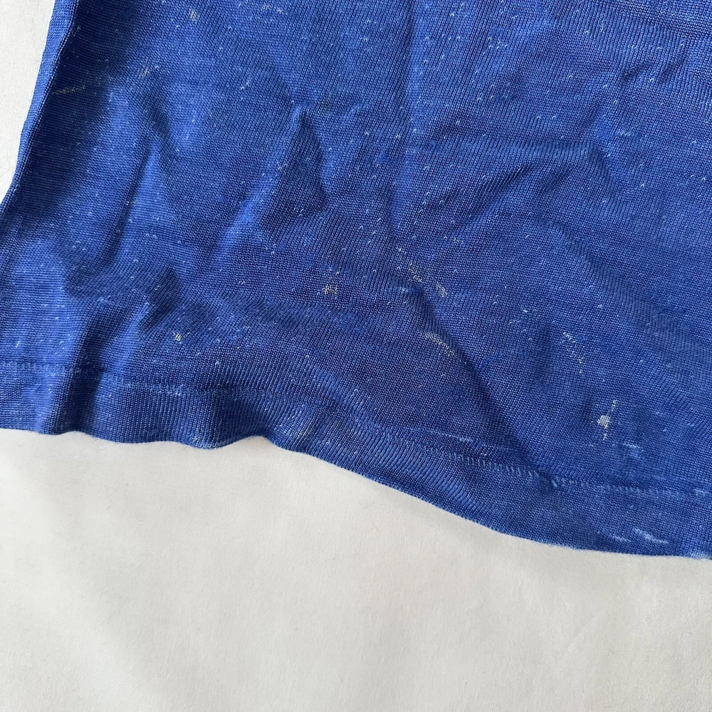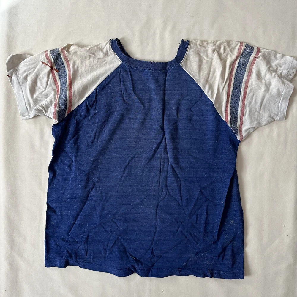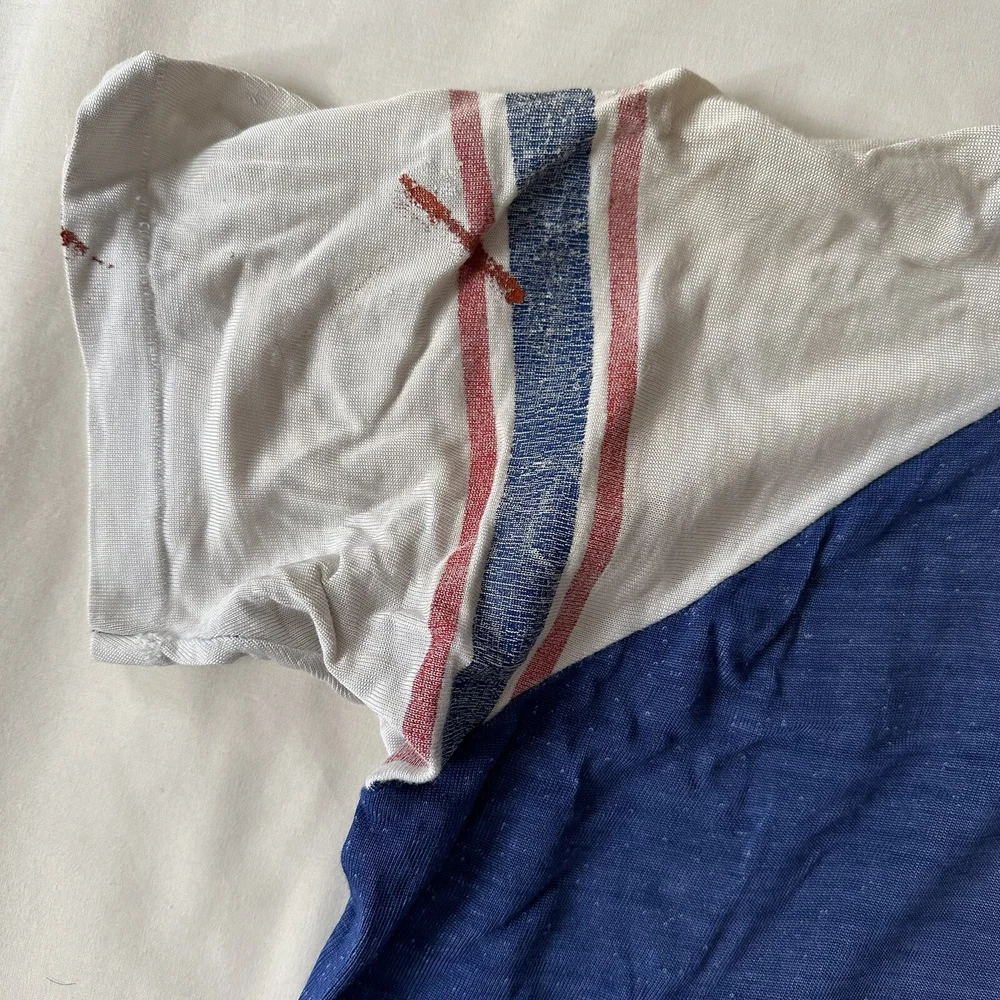 This vintage Hawks blue jersey is perfectly worn and thrashed making it such a cool piece. This is an original piece from the 1970s and perfect for anyone looking to add a touch of retro style and vintage cred to their wardrobe. The short-sleeved jersey features a regular fit and is probably a men's size L—see measurements. The vintage look of this jersey is perfect for those who want to stand out from the crowd. With its unique design and originality, this piece is sure to turn heads. Whether you're looking to add to your collection or simply want to make a statement, this thrashed jersey is the perfect choice. Originally a Rockhurst Hawks jersey from Kansas City, Missouri, this works beyond its original purpose