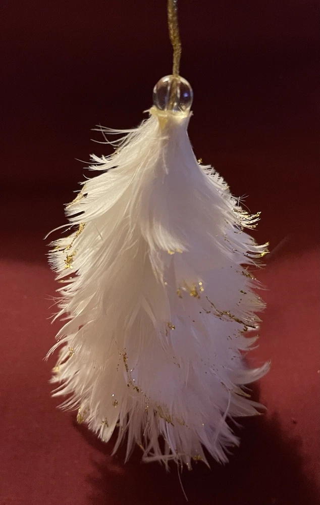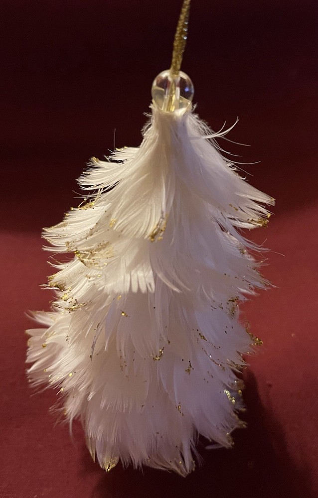 Unique vintage feathered Christmas tree ornament with gold on the edges. Possibly from the 1950s. Good condition. Please see photos for complete description.
